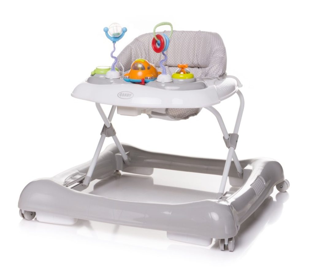 Dětské chodítko 4Baby 1Steeps s interaktivním hracím panelem je určeno pro děti od 6 měsíců věku. Zadní část sedátka je vyztužená a lze ho vyjmout. V přední části je umístěný interaktivní hrací panel ve tvaru autíčka. Na něm je umístěno tlačítko, která spouští různé melodie. Pro ještě větší zábavu jsou na horní desce umístěni 3 hračky v provedení chrastítek a jedna hračka z bezpečným zrcátkem. Kolečka chodítka jsou otočná a jsou vyrobeny z materiálu, který nepoškrábe podlahu. Splňuje veškeré normy které jsou vyžadovány pro dětské chodítka.