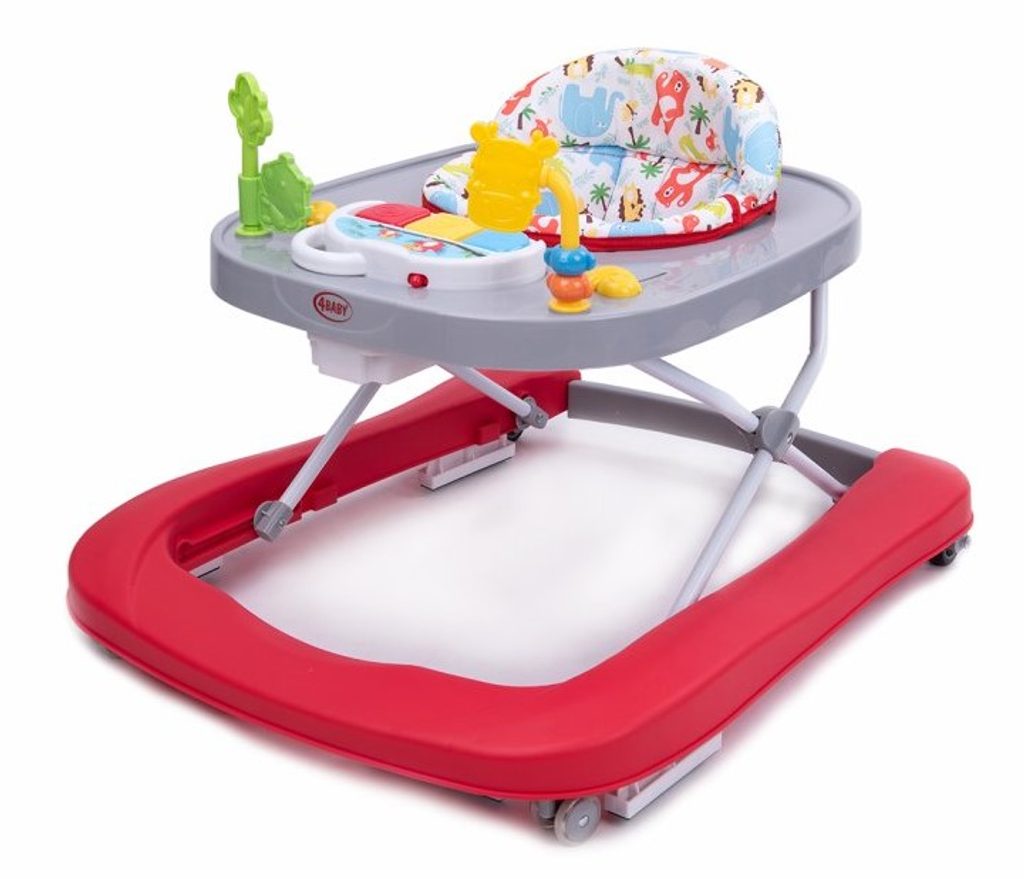 Dětské chodítko 4Baby s interaktivním hracím panelem je určeno pro děti od 6 měsíců věku. Zadní část sedátka je vyztužená a lze ho vyjmout. V přední části je umístěný interaktivní hrací panel. Na něm jsou umístěny 3 barevná tlačítka, která spouštějí různé melodie a přitom svítí. Pro ještě větší zábavu jsou na horní desce umístěni 2 posuvní šneci a hračky ve tvaru žirafy a tygra. Chodítko lze ho využít i jako odrážedlo. Přední kolečka chodítka jsou otočná a jsou vyrobeny z materiálu, který nepoškrábe podlahu. Splňuje veškeré normy které jsou vyžadovány pro dětské chodítka.