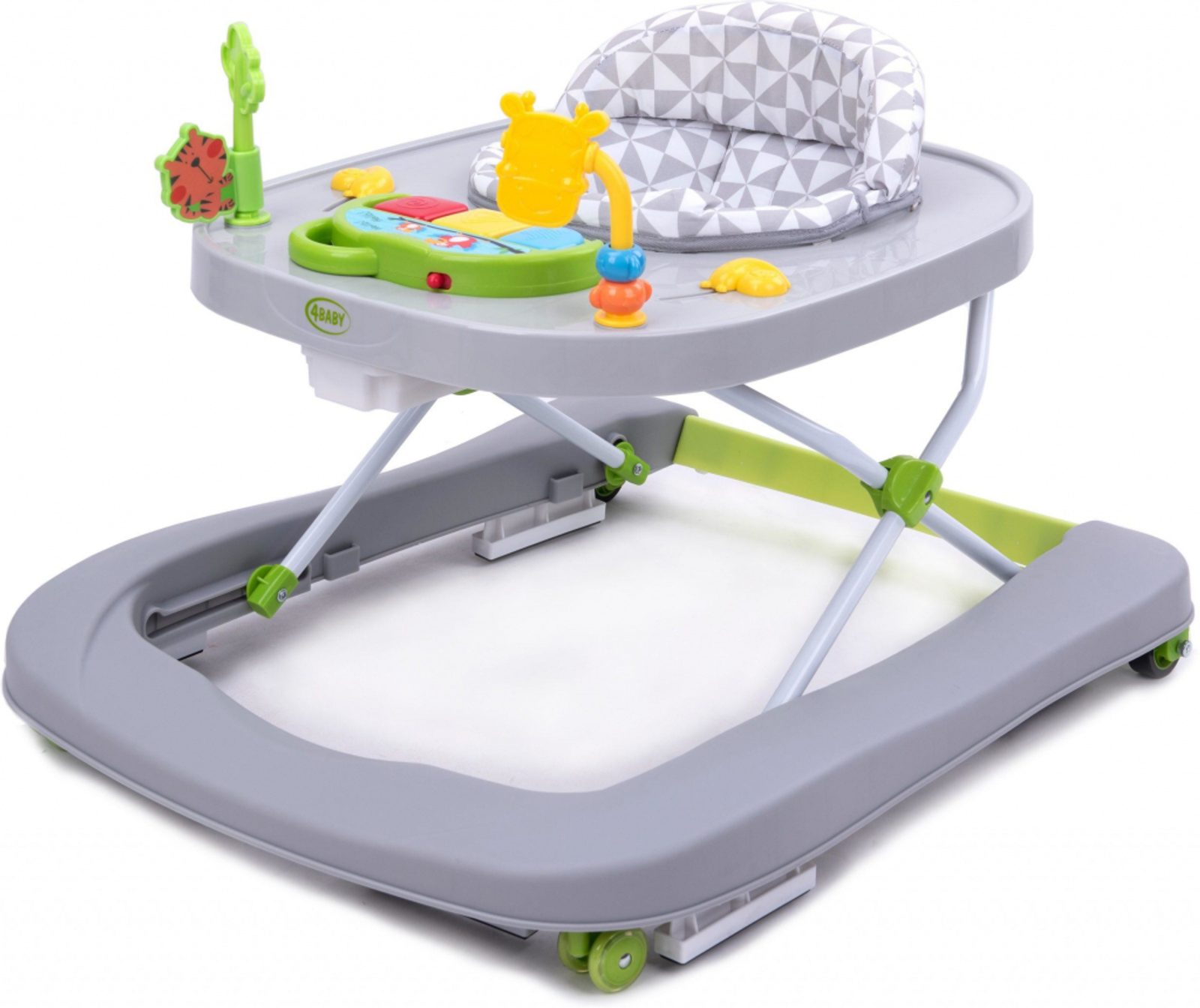 Dětské chodítko 4Baby s interaktivním hracím panelem je určeno pro děti od 6 měsíců věku. Zadní část sedátka je vyztužená a lze ho vyjmout. V přední části je umístěný interaktivní hrací panel. Na něm jsou umístěny 3 barevná tlačítka, která spouštějí různé melodie a přitom svítí. Pro ještě větší zábavu jsou na horní desce umístěni 2 posuvní šneci a hračky ve tvaru žirafy a tygra. Chodítko lze ho využít i jako odrážedlo. Přední kolečka chodítka jsou otočná a jsou vyrobeny z materiálu, který nepoškrábe podlahu. Splňuje veškeré normy které jsou vyžadovány pro dětské chodítka.