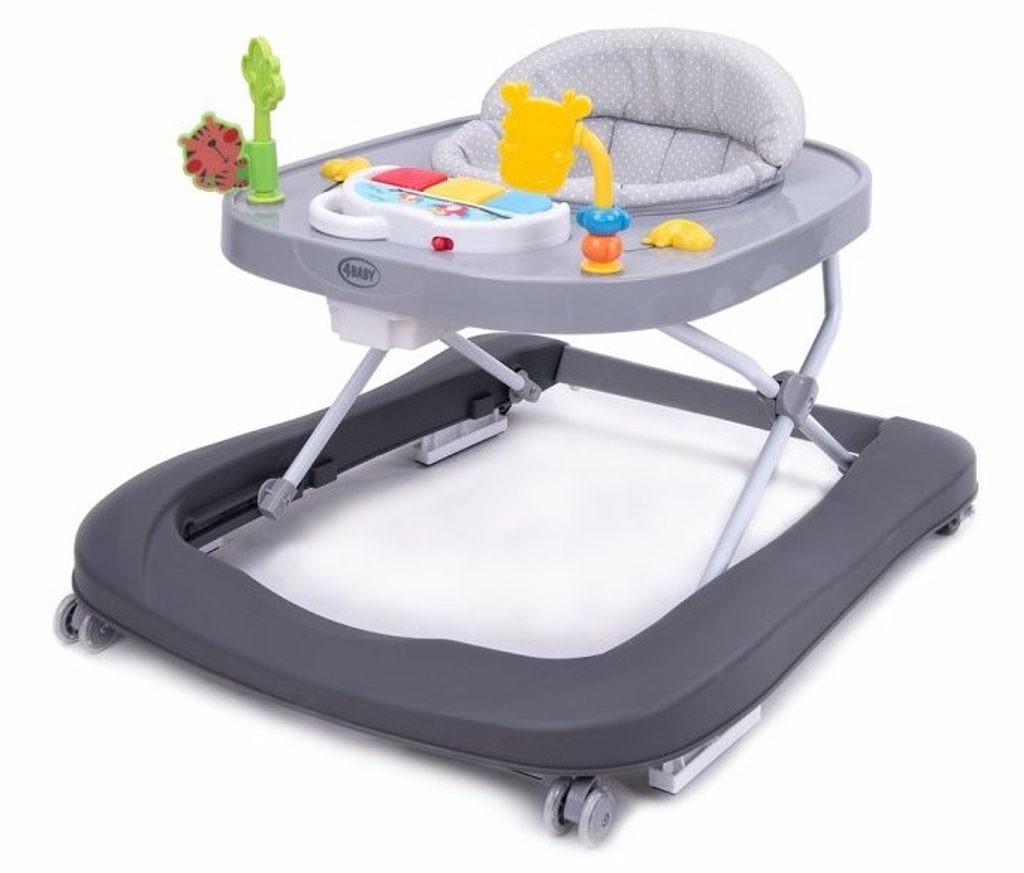 Dětské chodítko 4Baby s interaktivním hracím panelem je určeno pro děti od 6 měsíců věku. Zadní část sedátka je vyztužená a lze ho vyjmout. V přední části je umístěný interaktivní hrací panel. Na něm jsou umístěny 3 barevná tlačítka, která spouštějí různé melodie a přitom svítí. Pro ještě větší zábavu jsou na horní desce umístěni 2 posuvní šneci a hračky ve tvaru žirafy a tygra. Chodítko lze ho využít i jako odrážedlo. Přední kolečka chodítka jsou otočná a jsou vyrobeny z materiálu, který nepoškrábe podlahu. Splňuje veškeré normy které jsou vyžadovány pro dětské chodítka.