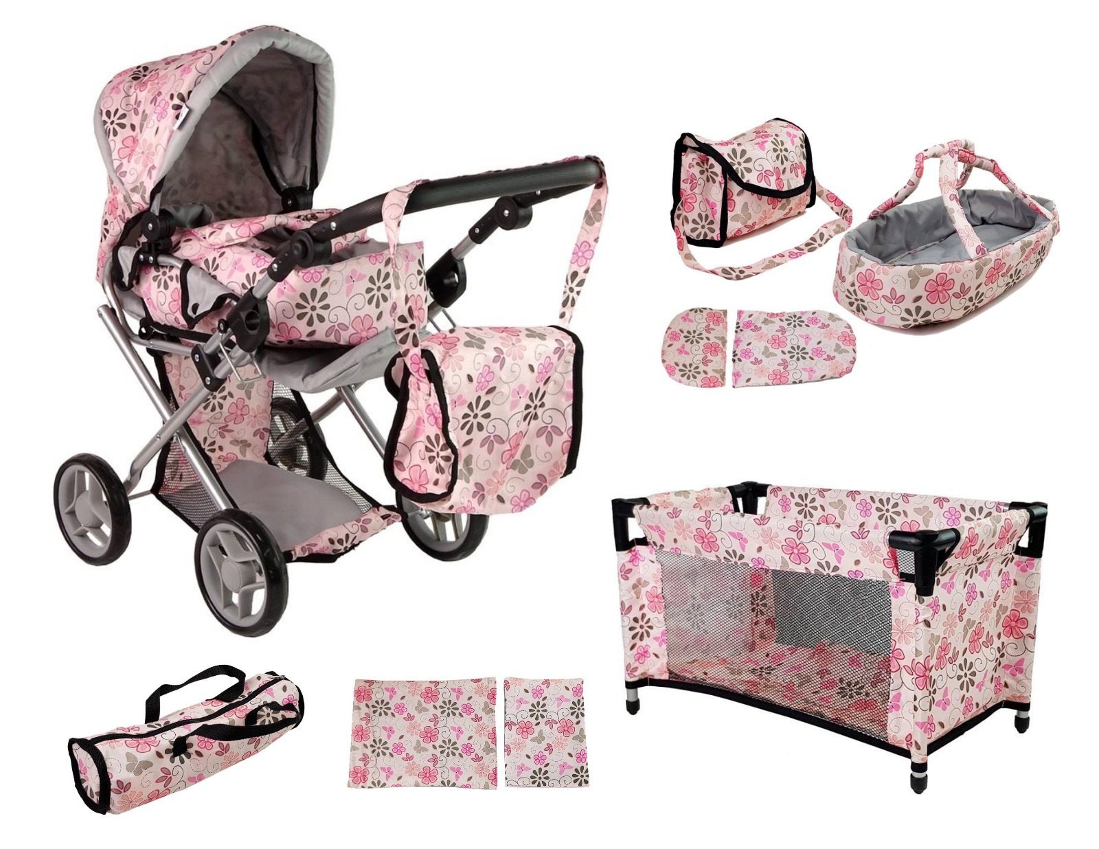 • obsahuje : kombinovaný kočárek pro panenky, cestovní postýlku, tašku na postýlku, peřinku s polštářkem