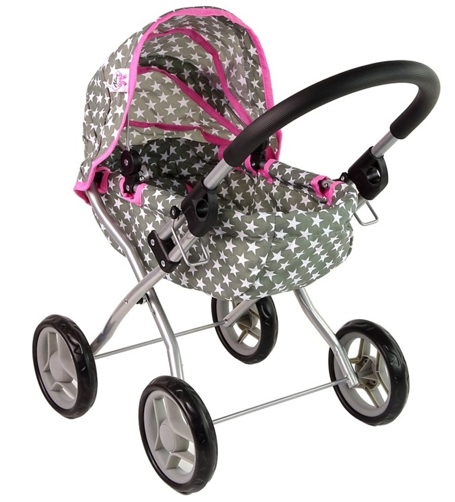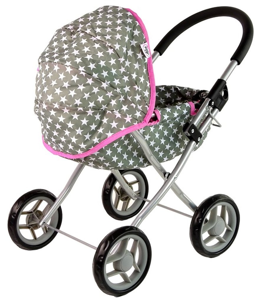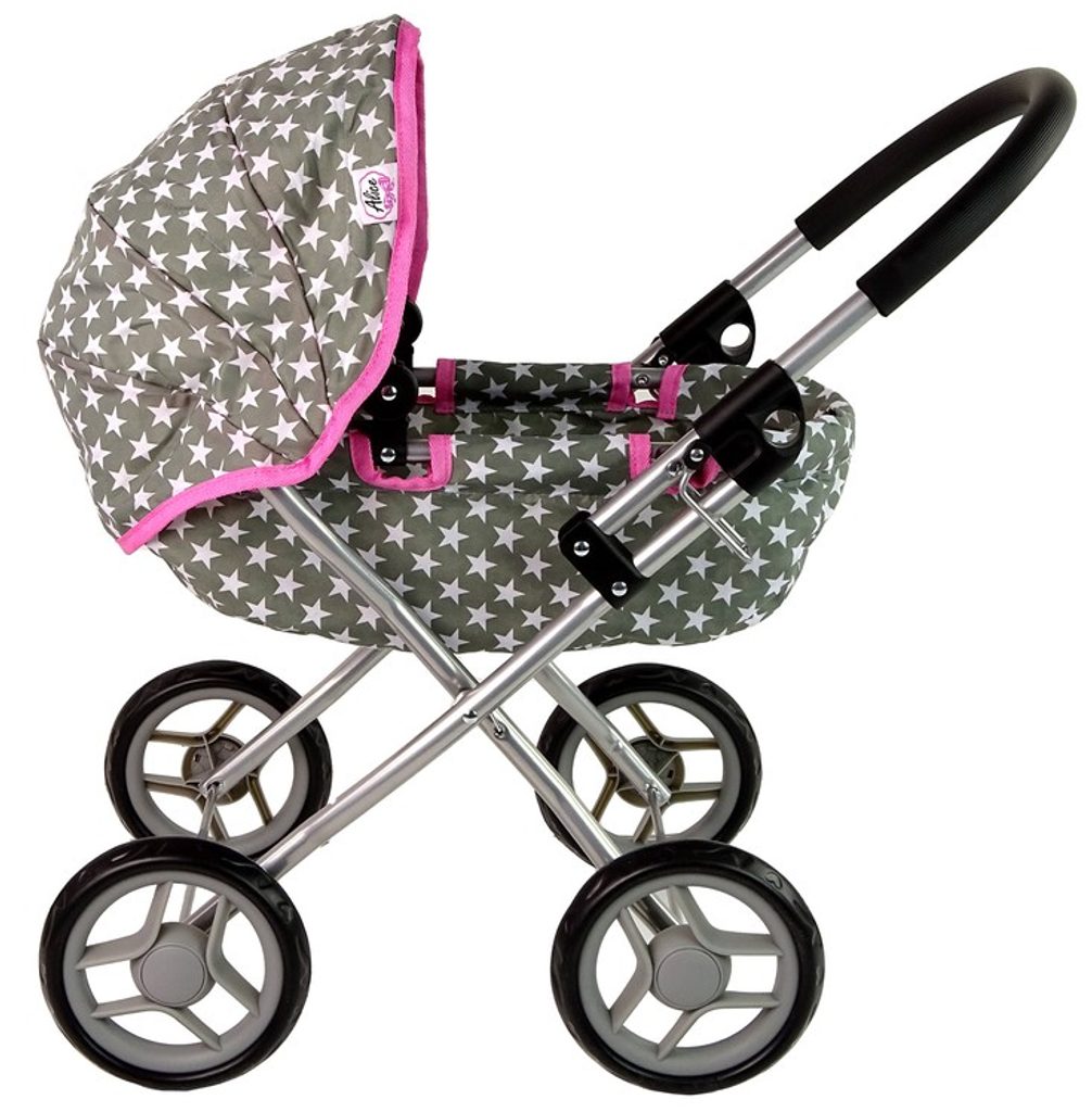 Kočárek pro panenky Alice má velmi lehkou stabilní konstrukci vyrobenou z hliníkových trubek, svrchní část je z impregnované bavlny. Lze ji jednoduše sejmout a kdykoliv vyprat. Rukojeť kočárku je obalená pěnou. Uvnitř kočárku je korbička s podložkou. Před automatickým složením chrání dítě blokace. Pěnová kola s disky nezanechávají šmouhy na podlaze. Kočárek je určen pro holčičky od 3 let.