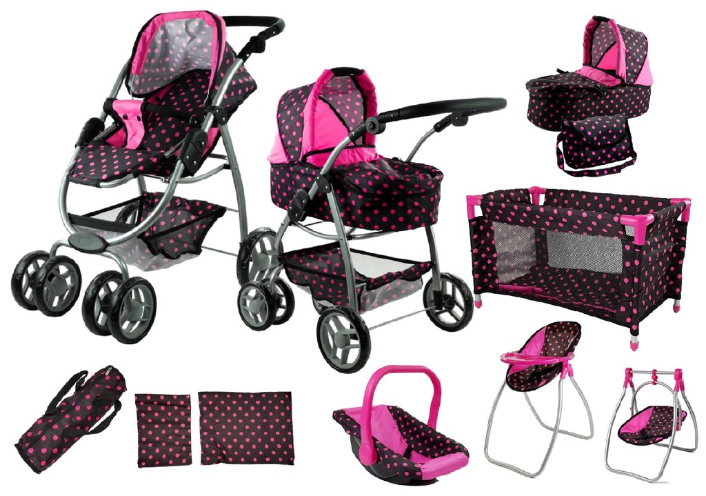 obsahuje : sportovní kočárek pro panenku 3v1, cestovní postýlku, tašku na postýlku, peřinku z polštářkem, autosedačku, přebalovací tašku, jídelní židličku a houpátko pro panenku 2v1