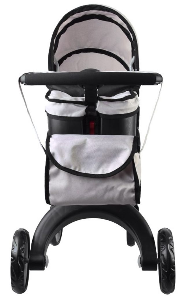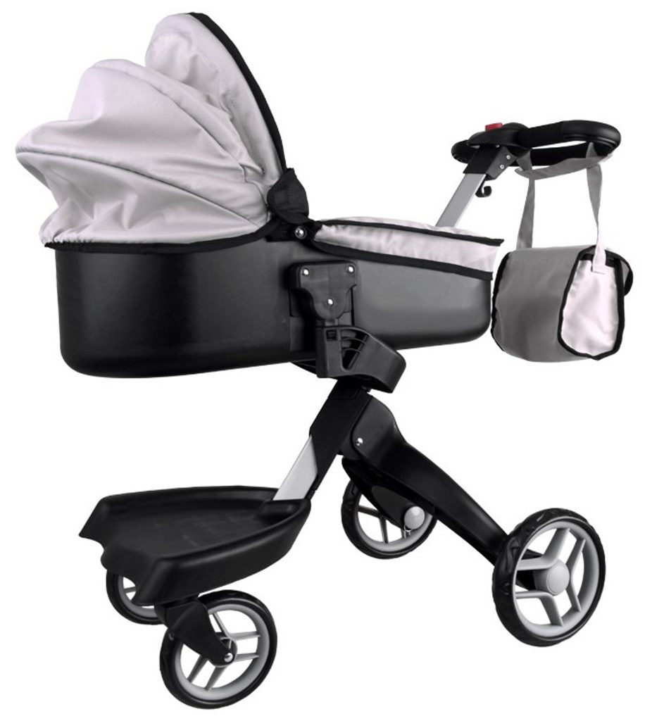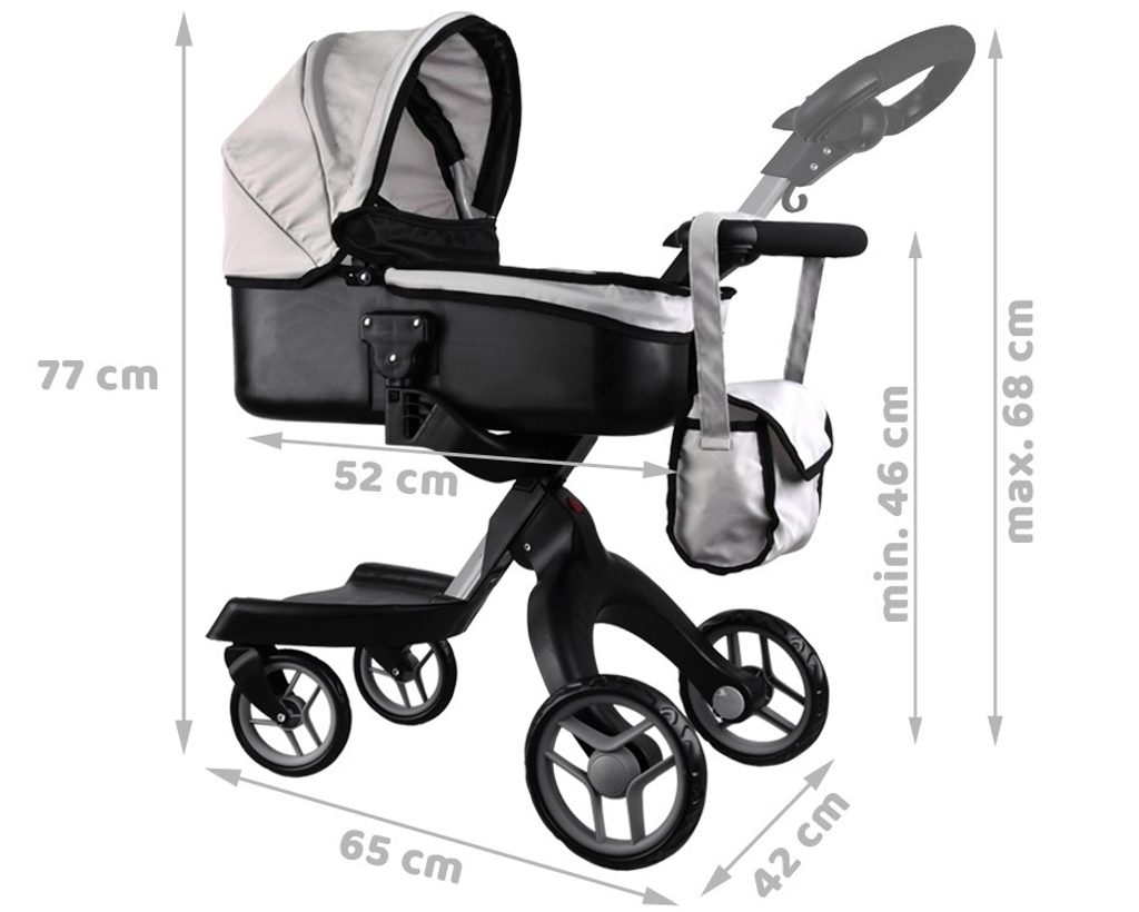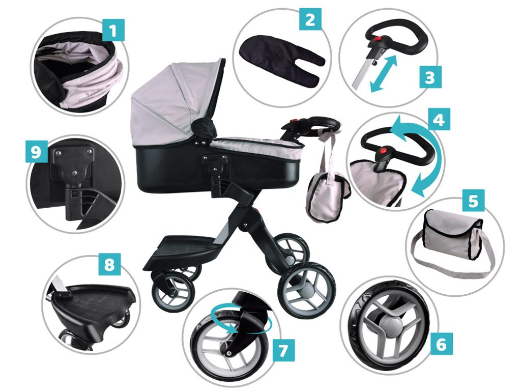 Moderní hluboký kočárek pro panenky Alice 4544 má velmi lehkou stabilní konstrukci vyrobenou z plastu a  hliníku, svrchní část je z impregnované bavlny. Rukojeť kočárku je nastavitelná od 46 do 68 cm. Přední kola kočárku jsou otočná. Ve spodní části je umístěna polička na drobnosti, součástí kočárku je i látková taštička. Je vhodný pro panenky do velikosti 45 cm.