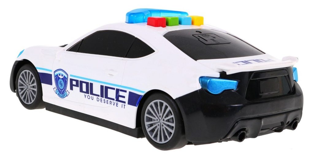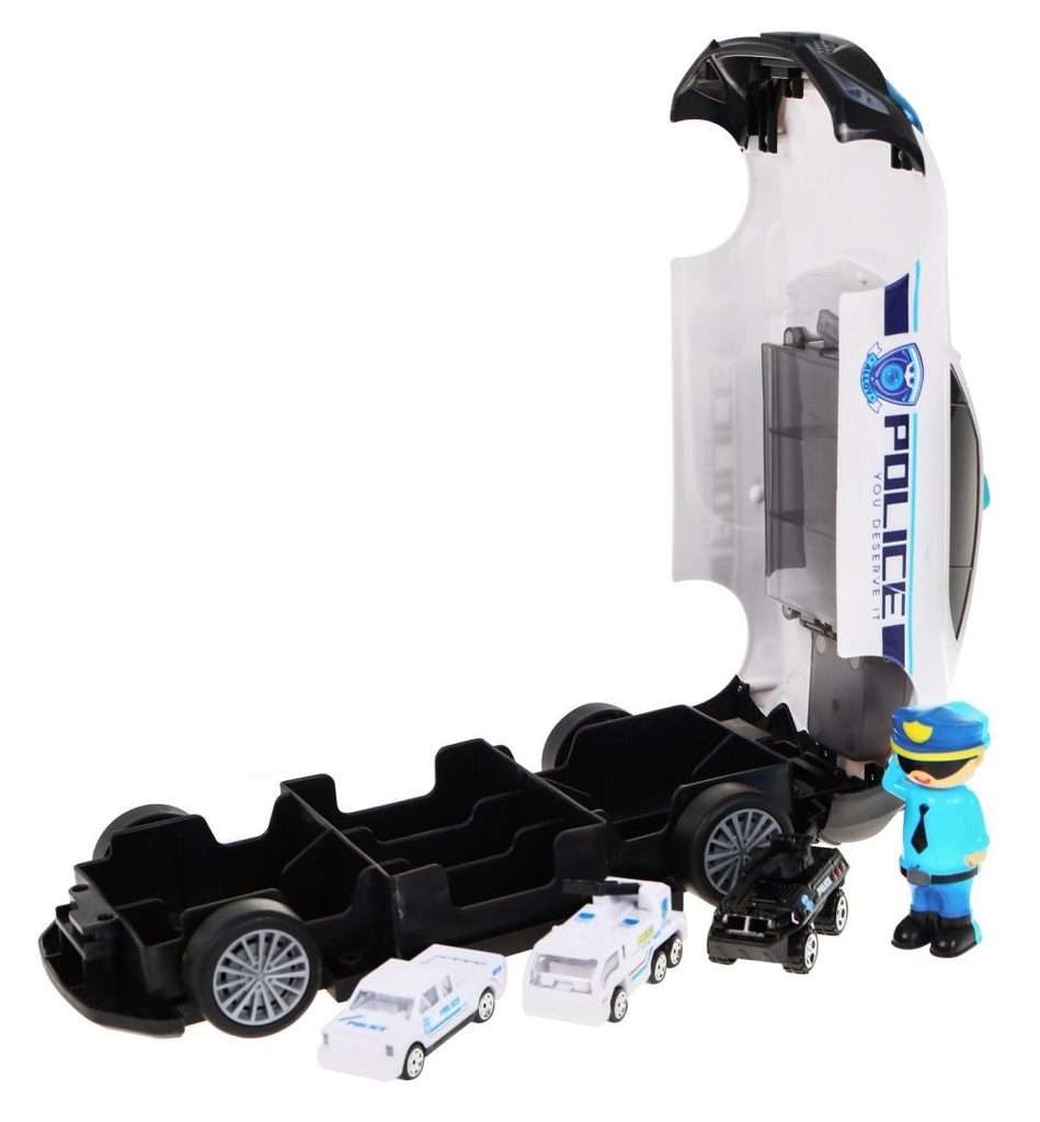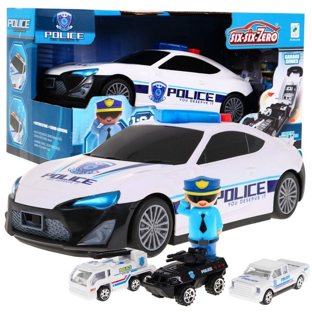 Policejní autíčko na baterie Police Garage je ideální hračkou pro rozvoj manuální zručnosti a logického myšlení. Zvednutím karosérie autíčka se otevře úložný prostor pro malé policejní autíčka. Součástí jsou celkem 3 ale dítě může využít i své další oblíbená autíčka. Prostoru je zde opravdu hodně. Na střeše policejního auta jsou 4 tlačítka, která vydávají různé zvuky, startování motoru a melodie. Během jízdy svítí policejní maják. Hračka je určena pro děti od 36 měsíců věku.