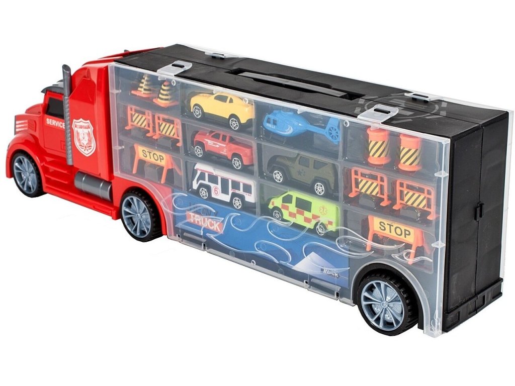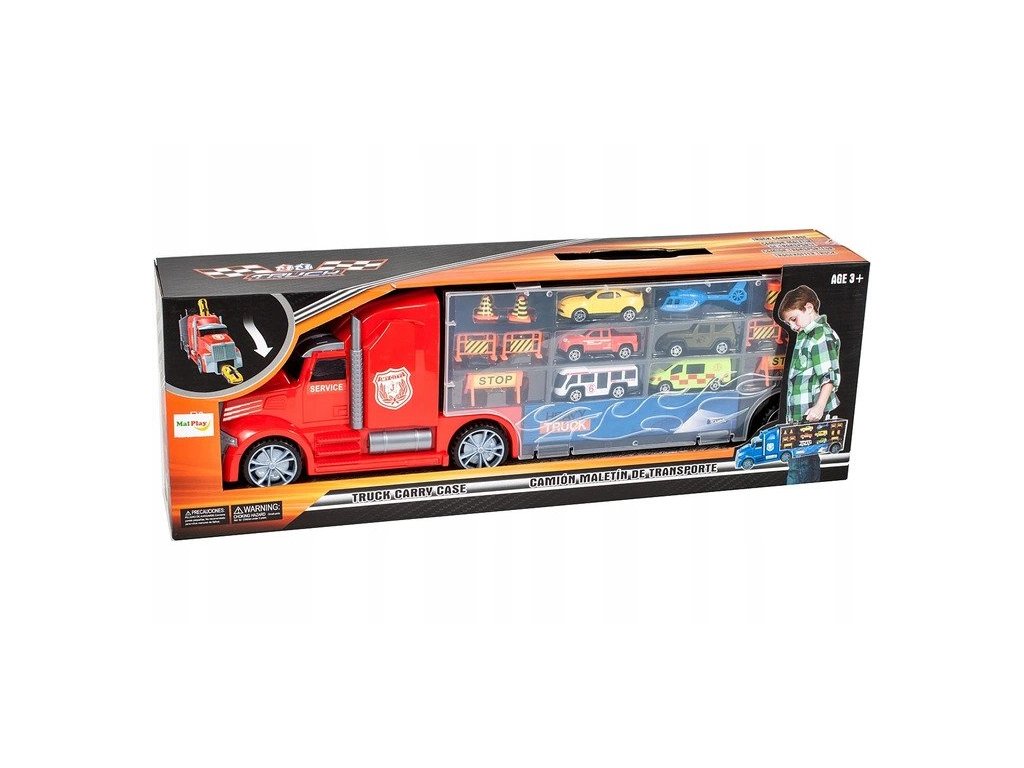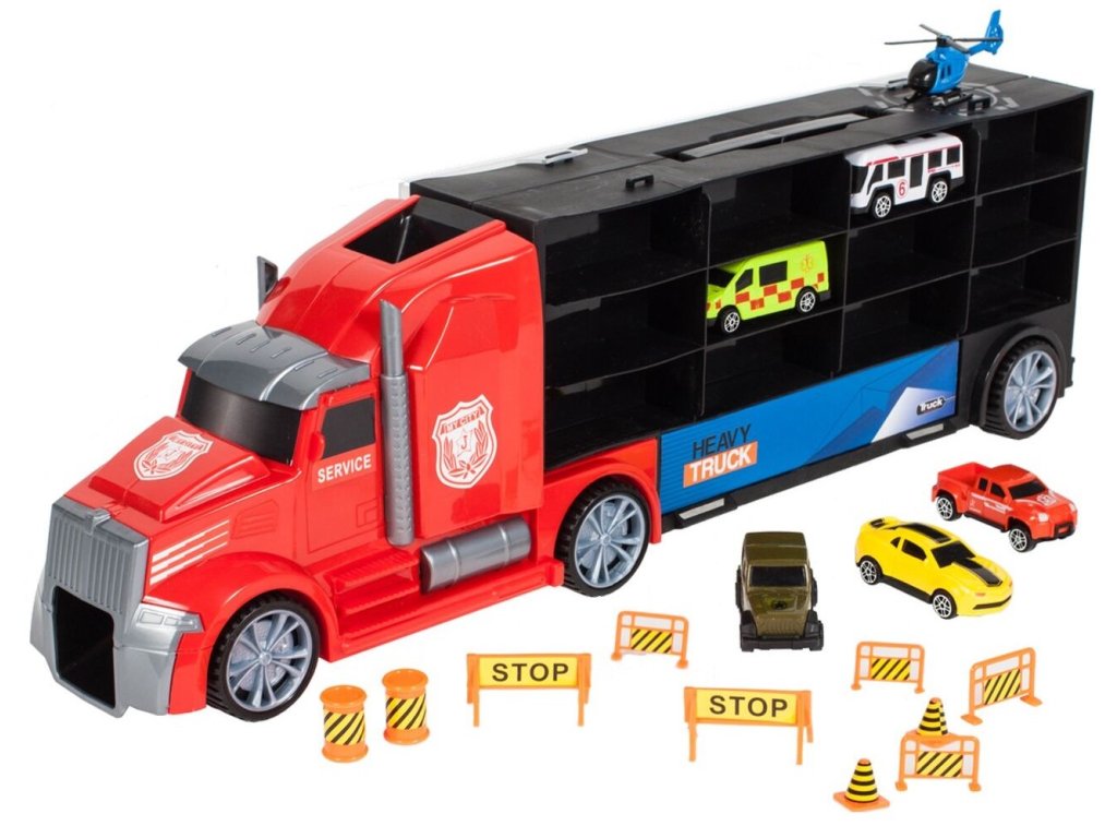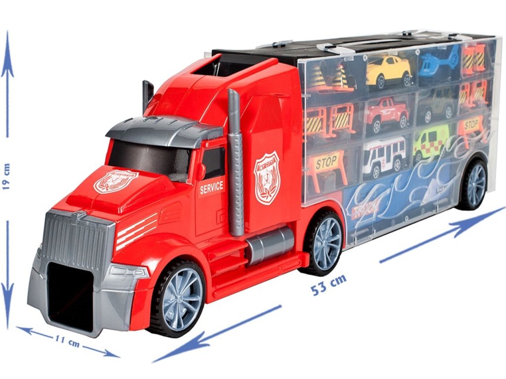 Velké nákladní autíčko Red Truck s autíčky a skluzavkou. Ta je umístěna na střeše auta a končí v přední části. Součástí auta je 5 různých autíček, vrtulník a další příslušenství jako jsou kužely a silniční zábrany. Obě boční strany auta jsou otevírací a jsou rozděleny na 12 menších a 4 velké přihrádky. V horní části je praktický úchyt pro snadné přenášení. Hračka je určena pro děti od 36 měsíců věku.
