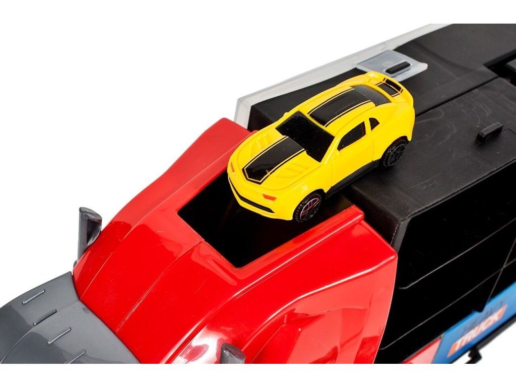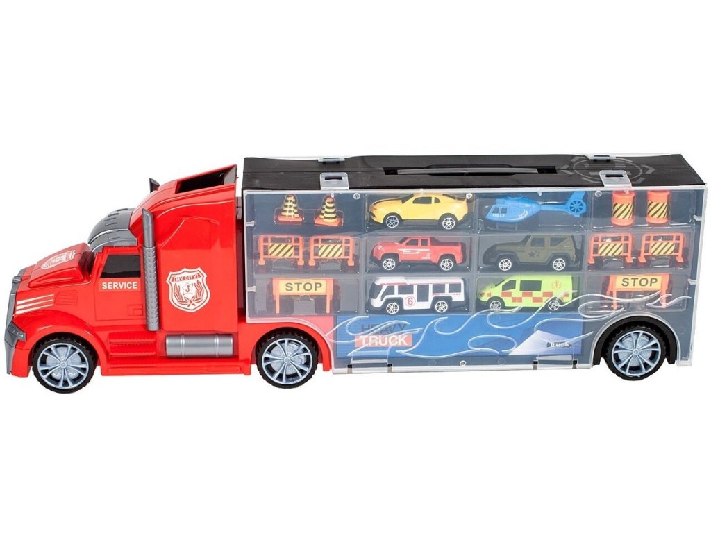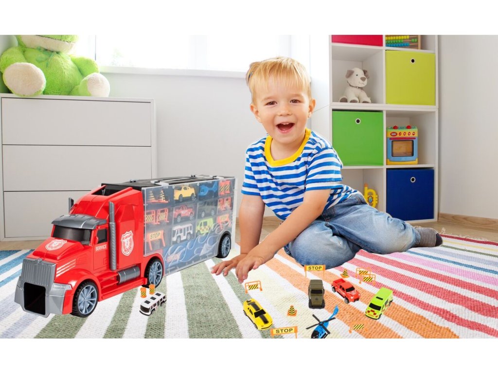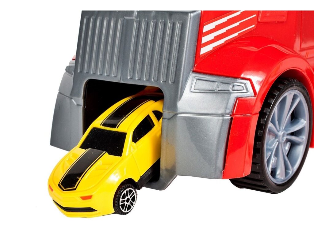 Velké nákladní autíčko Red Truck s autíčky a skluzavkou. Ta je umístěna na střeše auta a končí v přední části. Součástí auta je 5 různých autíček, vrtulník a další příslušenství jako jsou kužely a silniční zábrany. Obě boční strany auta jsou otevírací a jsou rozděleny na 12 menších a 4 velké přihrádky. V horní části je praktický úchyt pro snadné přenášení. Hračka je určena pro děti od 36 měsíců věku.