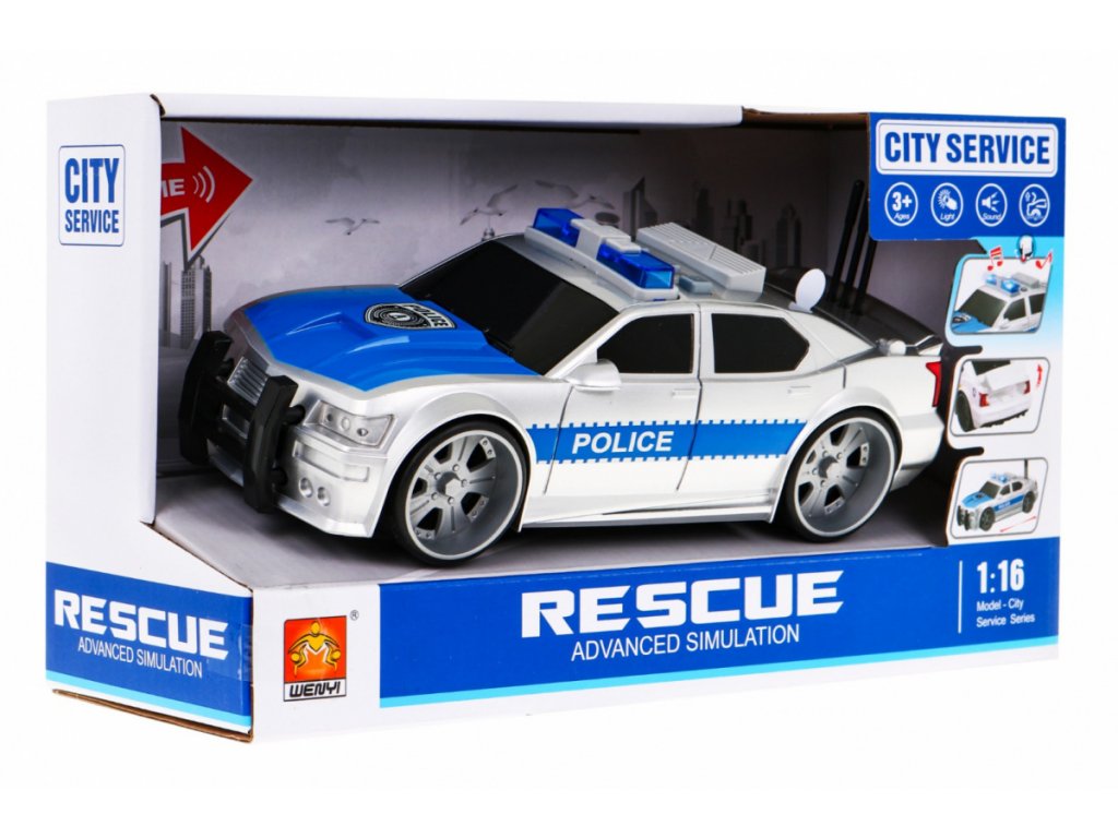 Policejní auto na setrvačník City Service je ideální hračkou pro rozvoj manuální zručnosti a logického myšlení. Je vybaveno tlačítky, které spouští melodie a zvuky. Na střeše je umístěný svítící maják. Pohon zajišťuje setrvačník na předních kolech. Zadní kufr autíčka je otevírací. Hračka je určena pro děti od 36 měsíců věku.