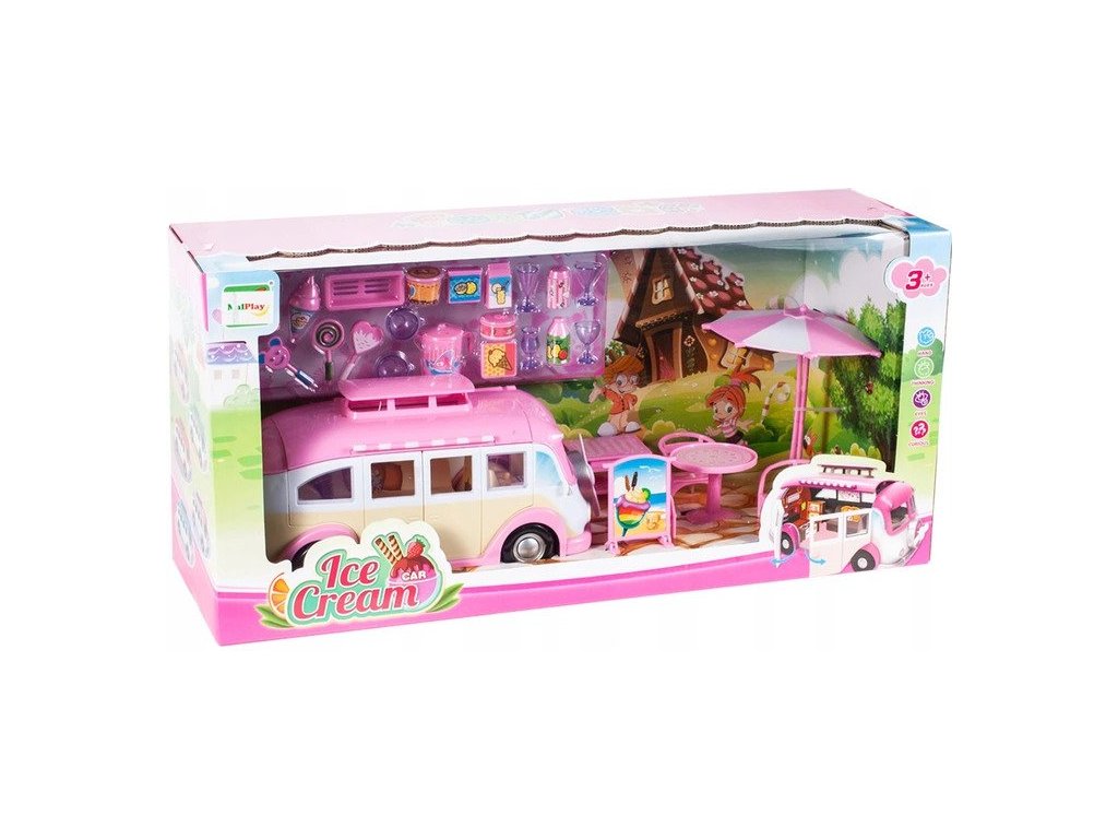 Zmrzlinářské autíčko pro panenky Ice Cream Car obsahuje vše co potřebuje panenka když jede prodávat zmrzlinu. Boční dveře a střecha autíčka jsou otevírací. Kompletní vybavení obsahuje židle, stůl, slunečník, kornouty, imitace potravin a mnoho dalších věcí. Hračka je určena pro děti od 36 měsíců věku.