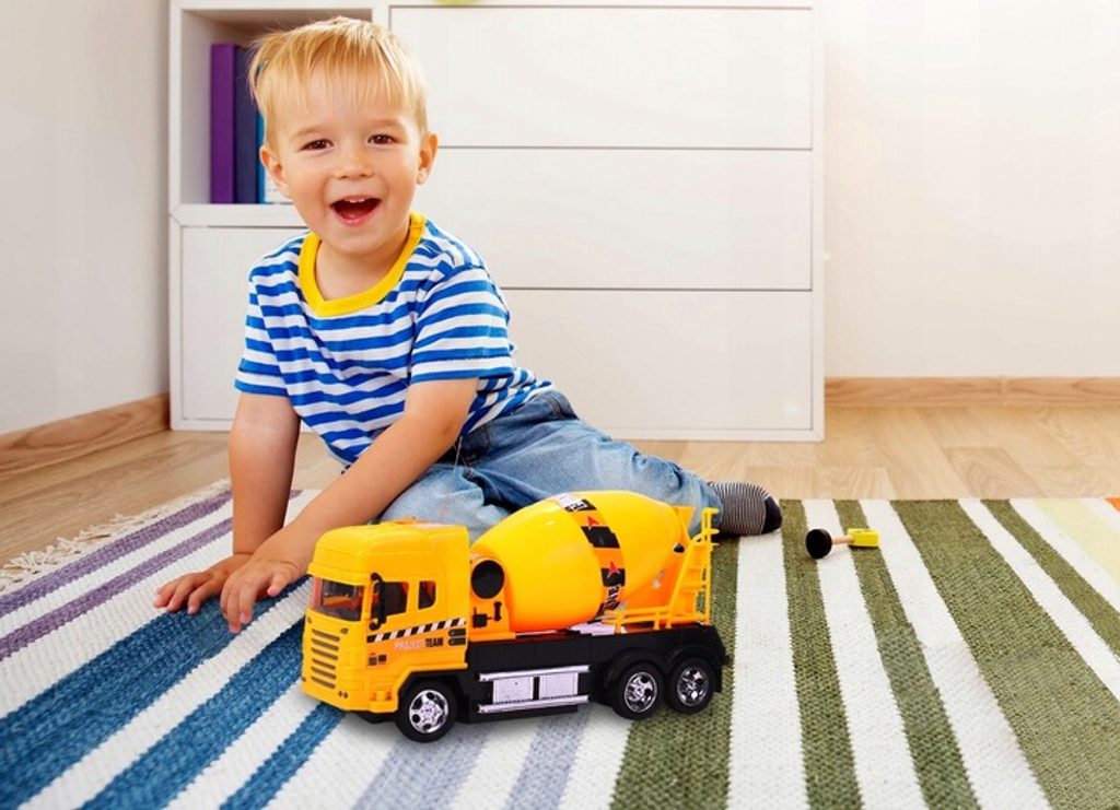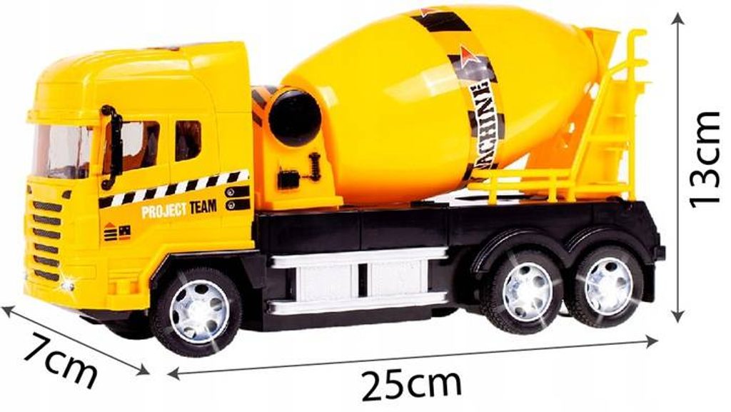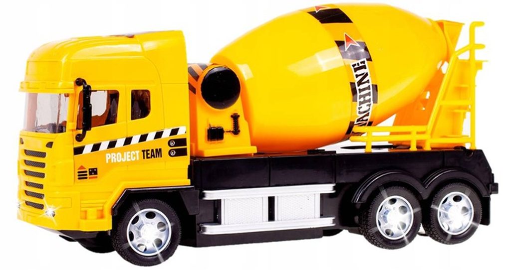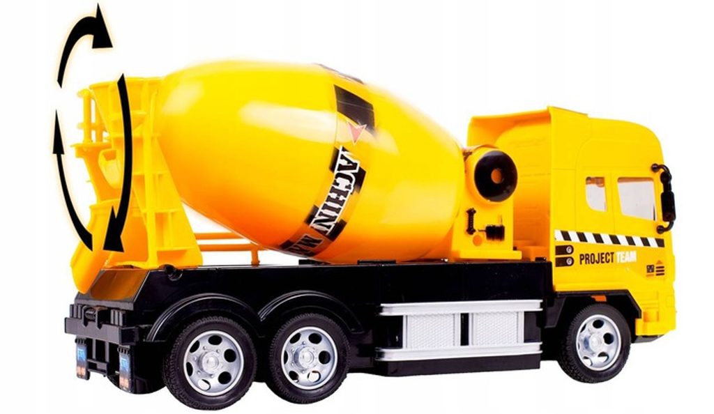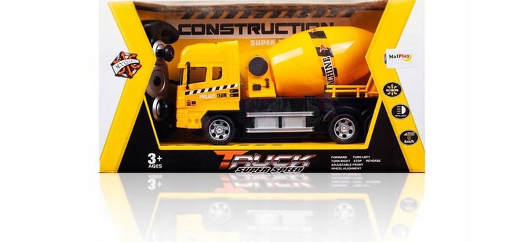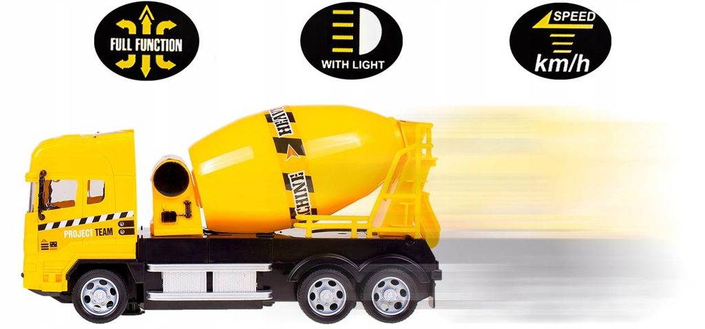Auto s dálkovým ovládáním 27MGz v provedení míchačky na beton umožnuje jízdu dopředu a dozadu, zatáčí doprava a doleva. Během jízdy svítí přední světla. Součástí balení je dálkový ovladač s jednoduchým ovládáním změnu směru a jízdy vpřed a vzad. Ovladač je napájen bateriemi, které nejsou součástí balení. Autíčko je vyrobeno z odolného plastu a má certifikaci CE.