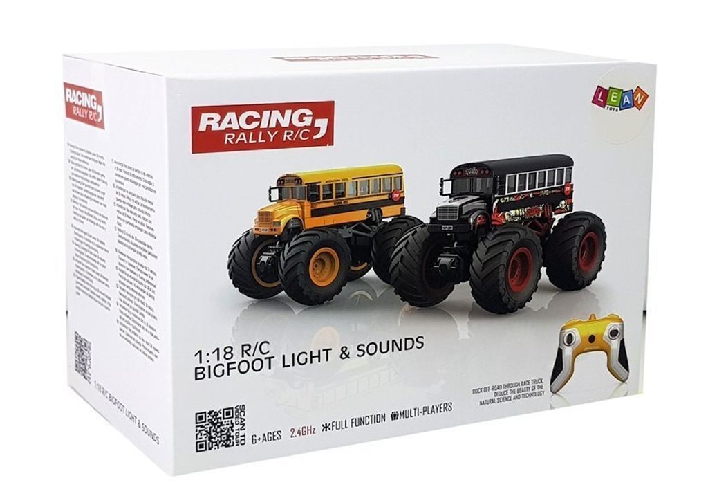 Autobus na dálkové ovládání Bigfoot s dálkovým ovládáním 2,4G se zvýšeným podvozkem umožnuje jízdu dopředu a dozadu, zatáčí doprava a doleva. Je osazeno gumovými koly s velmi dobrou přilnavostí o průměru 8 cm. Součástí balení je dálkový ovladač se 2 páčkami a tlačítkem. Dálkové ovládání je napájeno bateriemi, autíčko je napájeno 3,7V akumulátorem, který je součástí balení spolu s USB nabíječkou. Autobus je vyrobený z odolného plastu a má certifikaci CE.