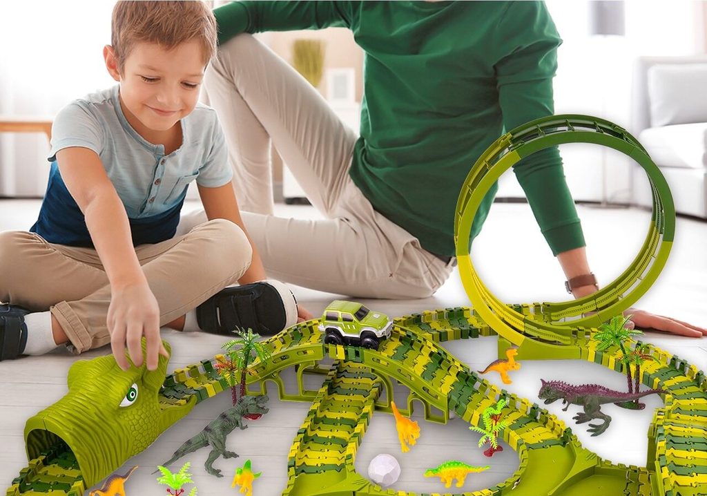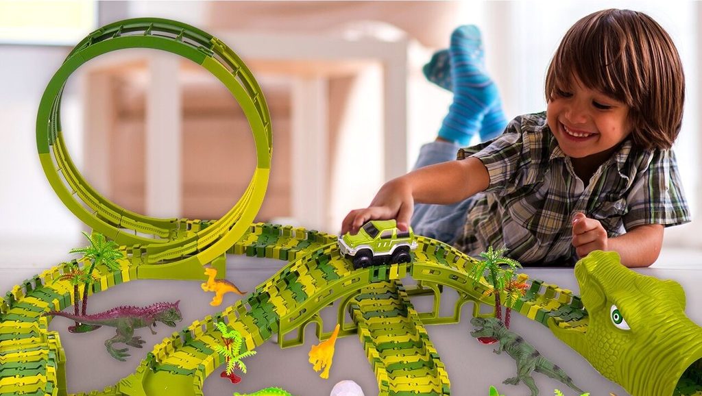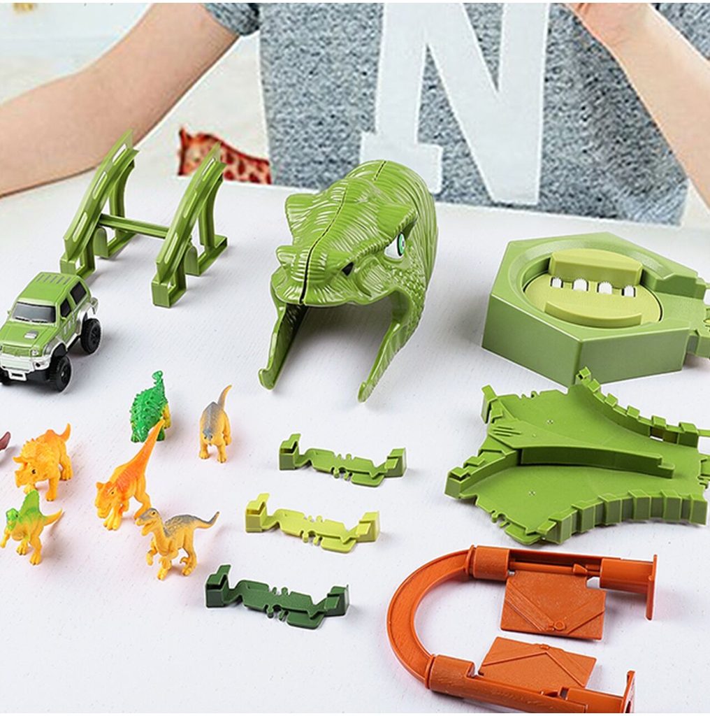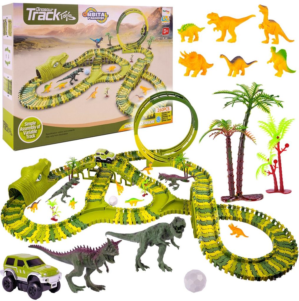 Dětská autodráha Dino Track s 260 elementy pro sestavení dráhy učí dětí představivost a podporuje kreativitu. Dráha je elastická, lze ji tak libovolně otáček a kombinovat. Součástí sady jsou také tunel ve tvaru hlav dinosaurů, stromečky, vyhýbky, elementy pro sestavení mostů a 8 různých dinosaurů. Autíčko, které jsou součástí balení je napájeno baterií. Hračka je určena pro děti od 36 měsíců věku.