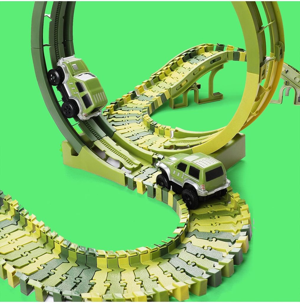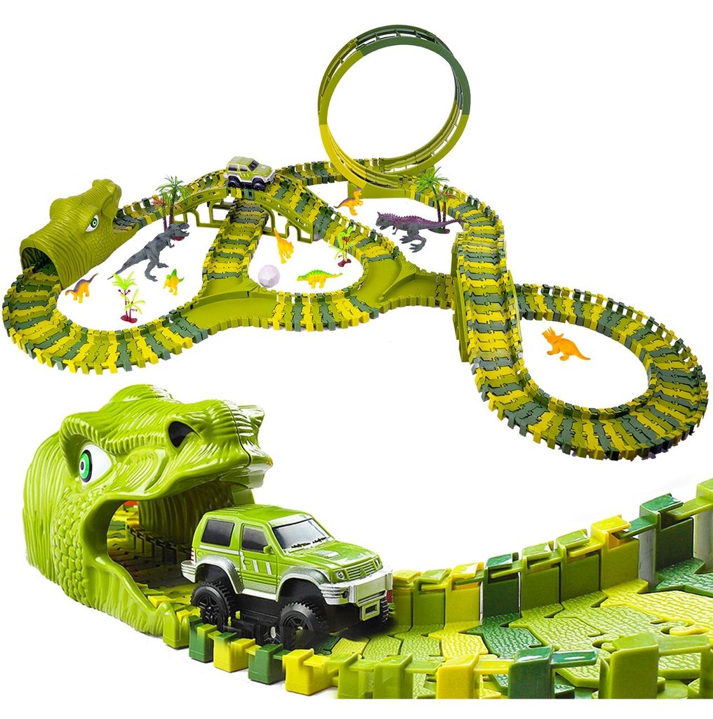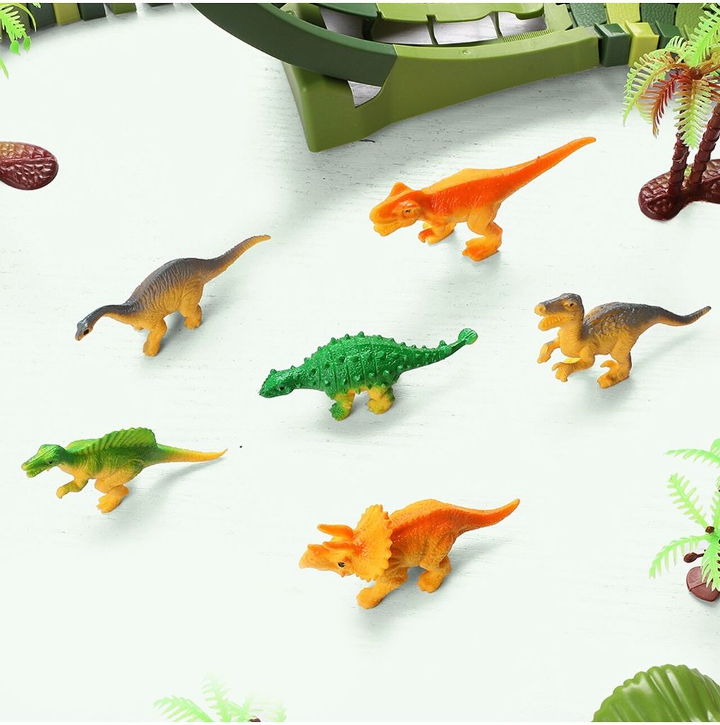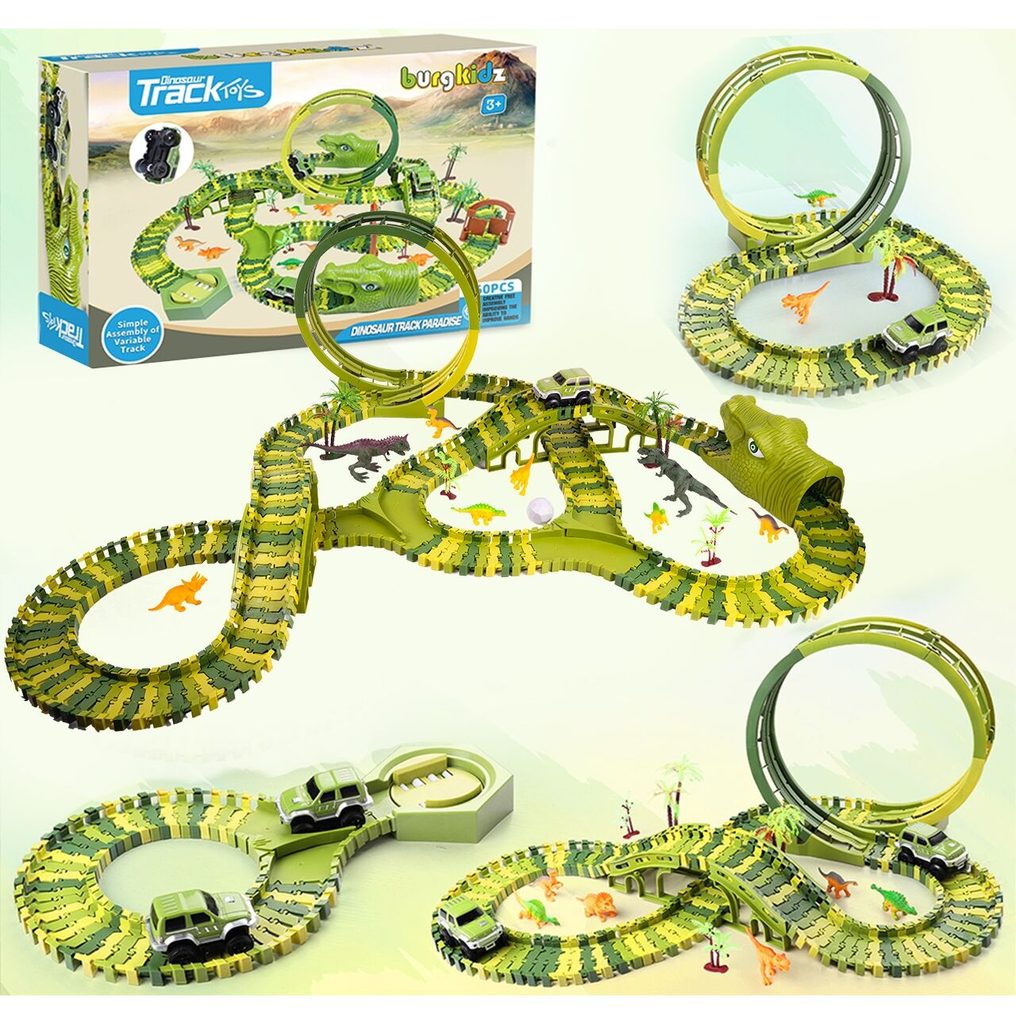 Dětská autodráha Dino Track s 260 elementy pro sestavení dráhy učí dětí představivost a podporuje kreativitu. Dráha je elastická, lze ji tak libovolně otáček a kombinovat. Součástí sady jsou také tunel ve tvaru hlav dinosaurů, stromečky, vyhýbky, elementy pro sestavení mostů a 8 různých dinosaurů. Autíčko, které jsou součástí balení je napájeno baterií. Hračka je určena pro děti od 36 měsíců věku.
