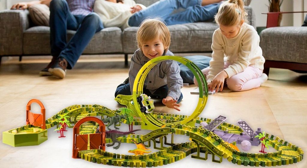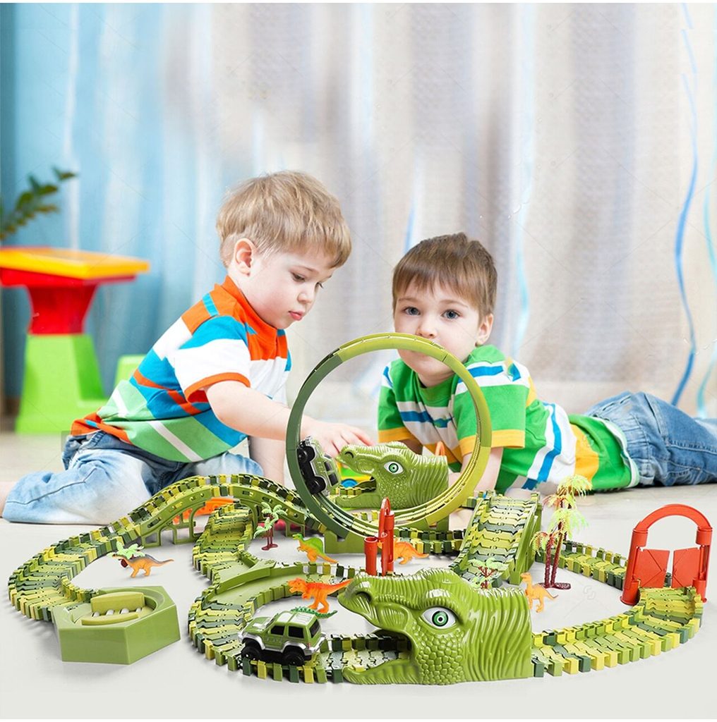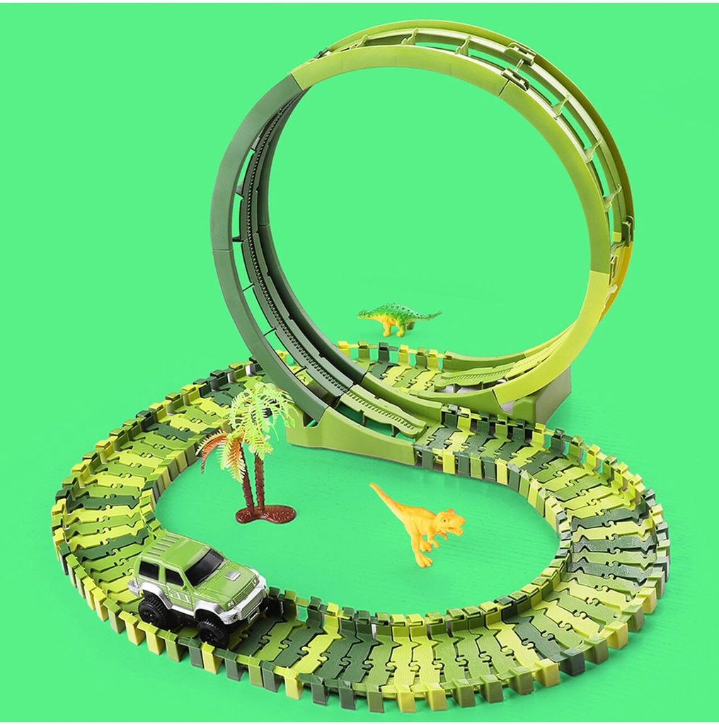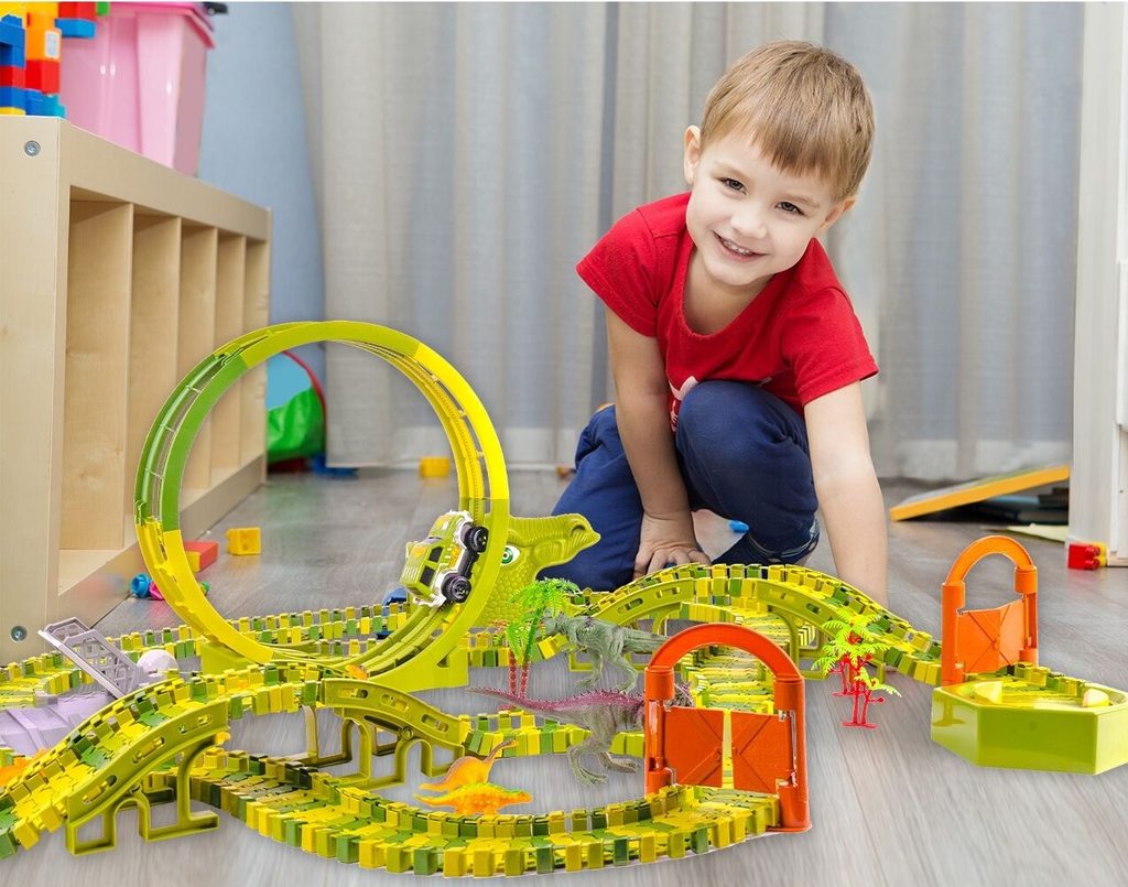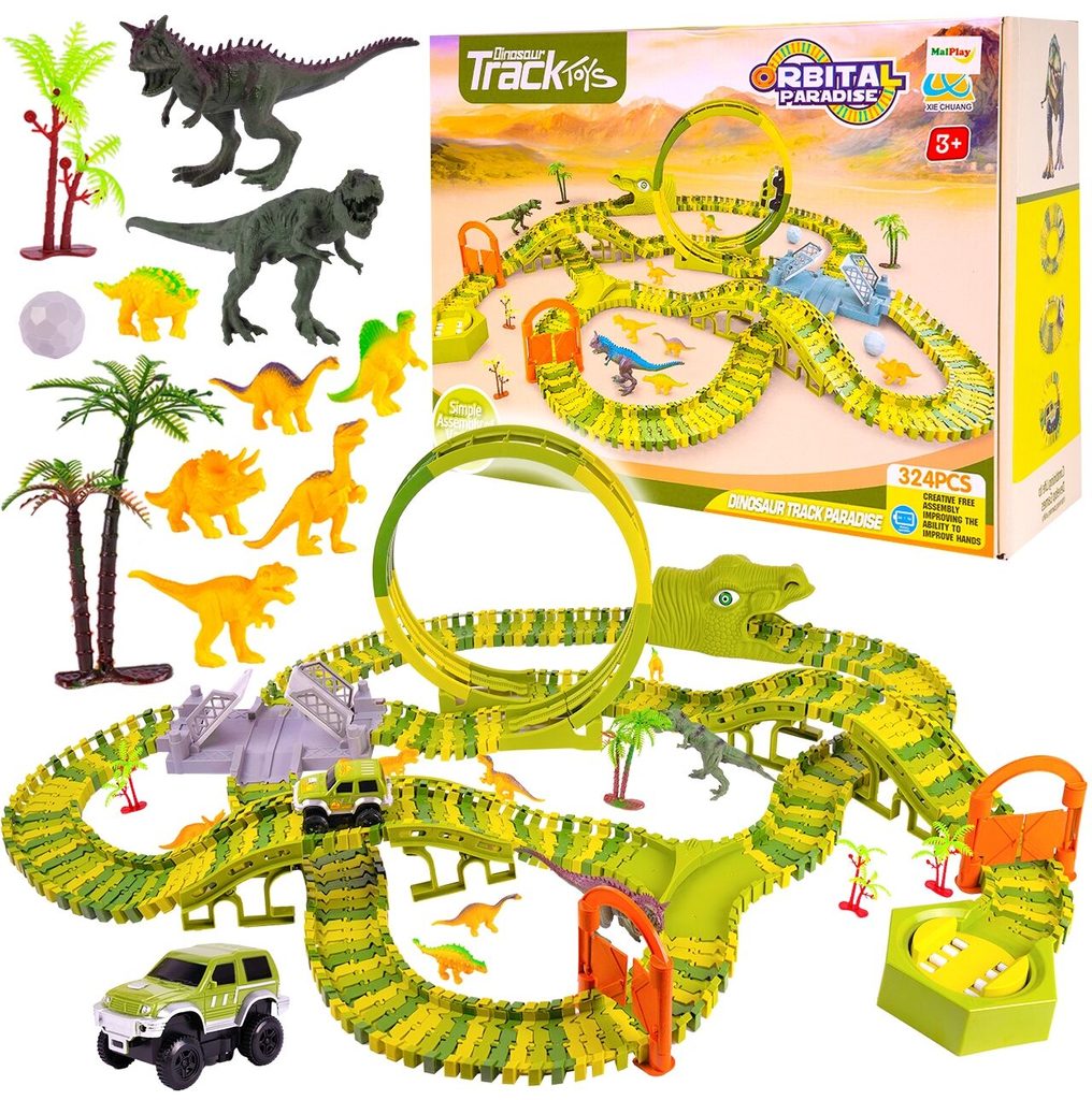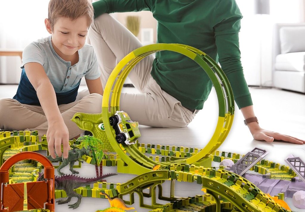 Dětská autodráha Dino Track s 324 elementy pro sestavení dráhy učí dětí představivost a podporuje kreativitu. Dráha je elastická, lze ji tak libovolně otáček a kombinovat. Součástí sady jsou také 2 tunely ve tvaru hlav dinosaurů, stromečky, vyhýbky, elementy pro sestavení mostů a 8 různých dinosaurů. Autíčko, které je součástí balení je napájeno baterií. Hračka je určena pro děti od 36 měsíců věku.