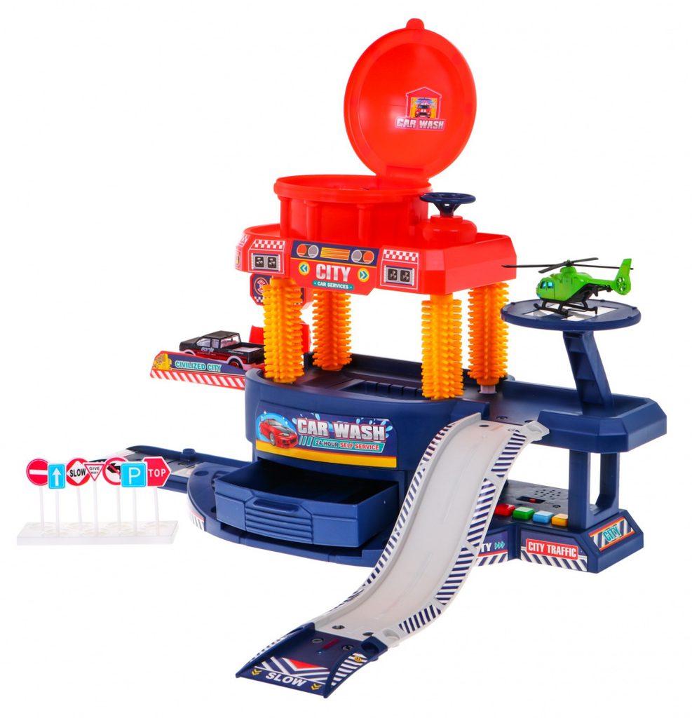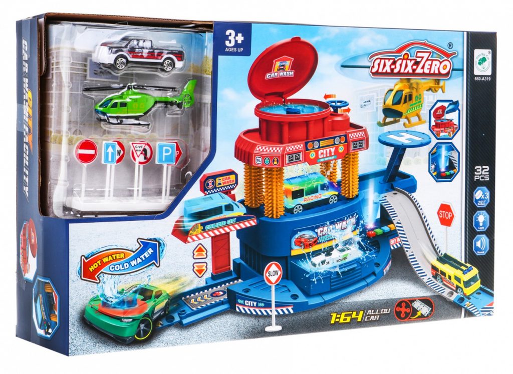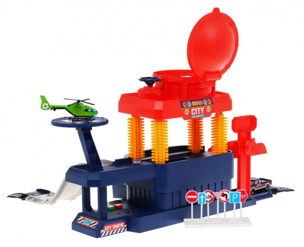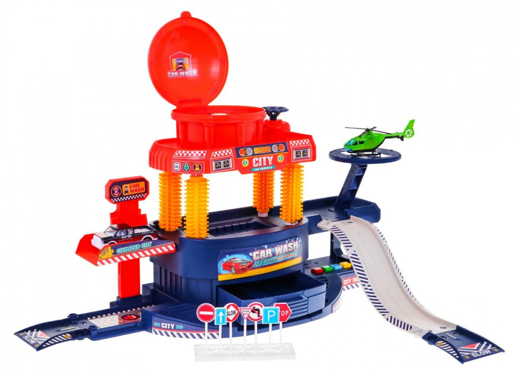Kompletně vybavená automyčka s autíčkem, helikoptérou a příslušenstvím Car Wash. V horní části myčky je umístěna nádrž na vodu, která se pouští otočným kohoutkem. Mytí aut je tak zcela realistické. První a druhé patro je propojeno pohyblivým výtahem. Součástí myčky je také zvukový panel s blikajícím LED světlem. Zmáčknutím tlačítek se ozývají zvuky sirén různých aut a startování. V horní části je také přistávací plocha vrtulníku. Mladý motoristický nadšenec zde nalezne vše co potřebuje. Je vyrobena z kvalitního materiálu bez ostrých hran. Hračka je učena pro děti od 3 let věku.