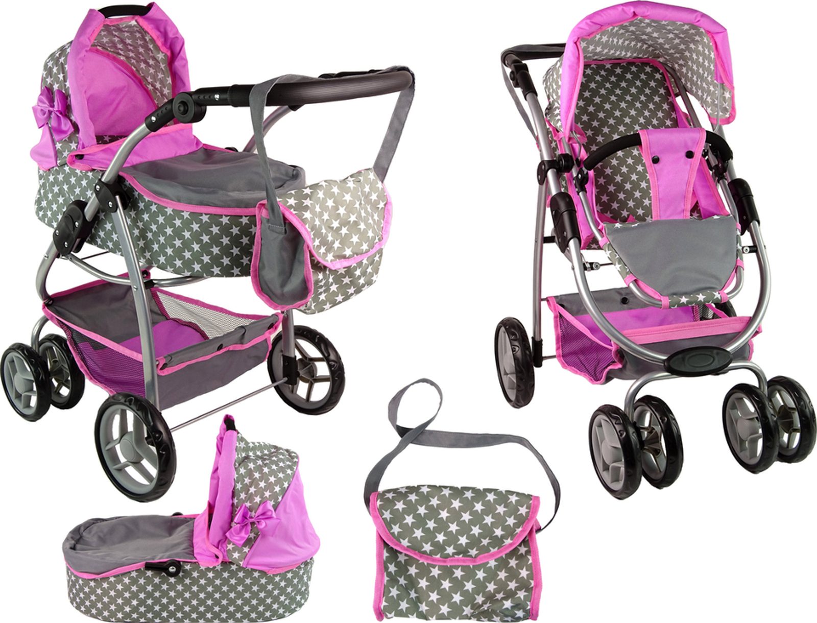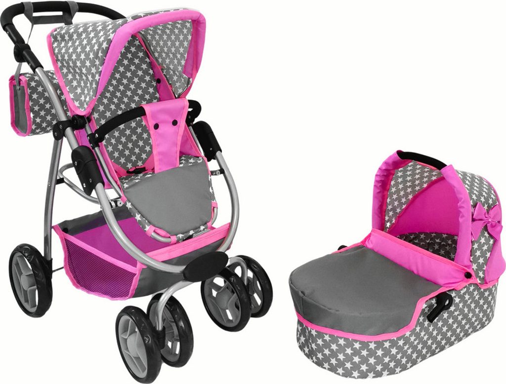 Kombinovaný kočárek pro panenky Alice 3v1 v několika nádherných barevných provedeních. Má velmi lehkou stabilní konstrukci vyrobenou z hliníkových trubek, svrchní část je z impregnované bavlny. Lze ji jednoduše sejmout a kdykoliv vyprat. Rukojeť kočárku je nastavitelná a obalená pěnou. Uvnitř kočárku je korbička sloužící k snadnému přenášení panenky. Před automatickým složením chrání dítě blokace. Panenka je ve sportovní verzi proti vypadnutí zabezpečena bezpečnostním pásem. Jednoduchá změna z hluboké na sportovní verzi.