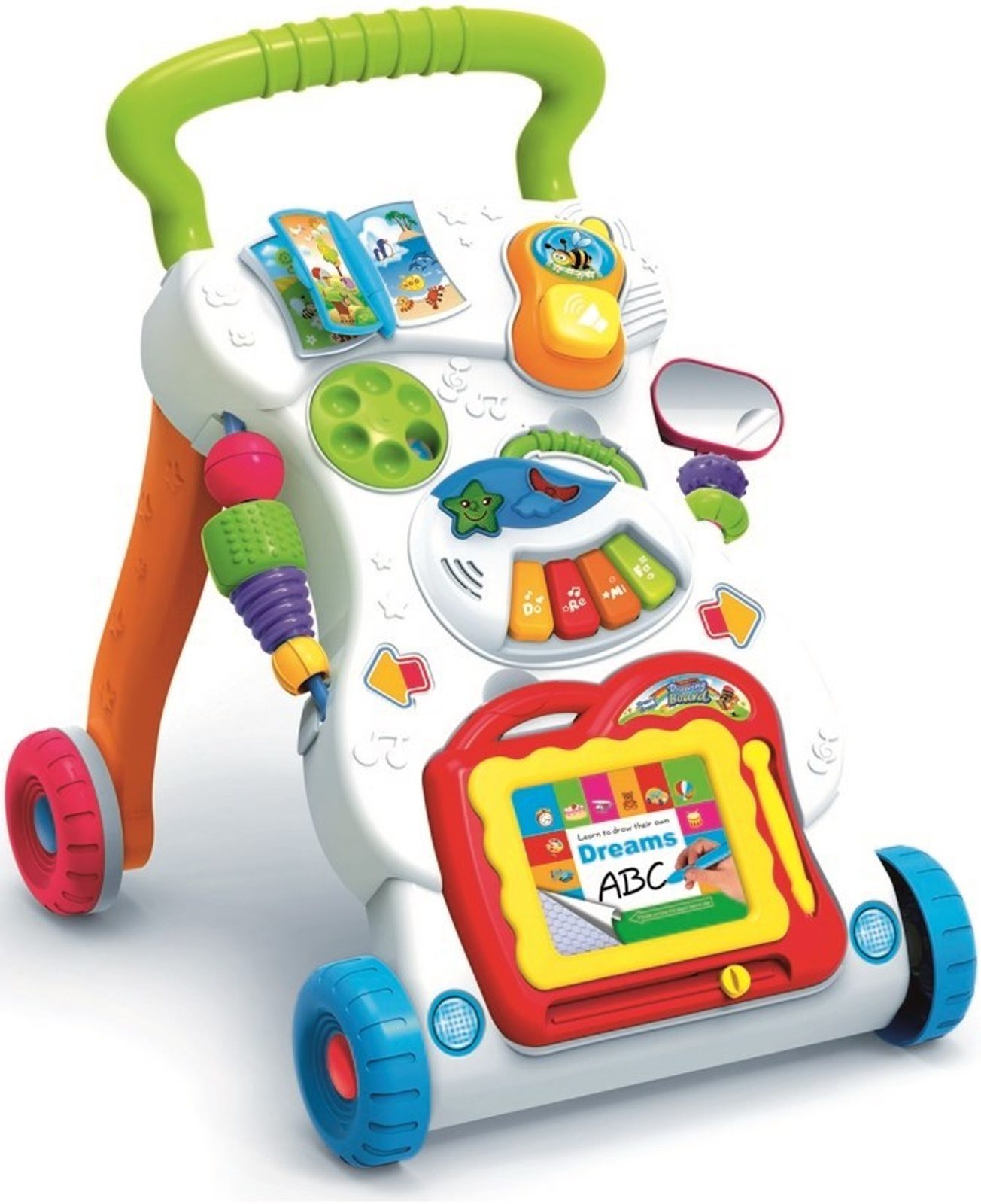 Dětské multifunkční chodítko Baby Mix pro ty nejmenši děti, edukační centrum. Je vyrobeno ve tvaru písmene A se dvěmi rameny, které dítěti pomáhá udržet rovnováhu a stabilitu při chůzi. Chodítko je vybaveno knížkou s obrázky, kulatým číselníkem na vytáčení čísel, mobilním telefonem se zvuky ,kreslící tabulí a malými klávesami. Na pravé straně je umístěno zrcátko pro bezpečnost dítěte. V horní části chodítka je umístěn držák pomocí kterého dítě snadno udrží rovnováhu a nespadne na zem. Chodítko je vhodné pro děti starší 12 měsíců.