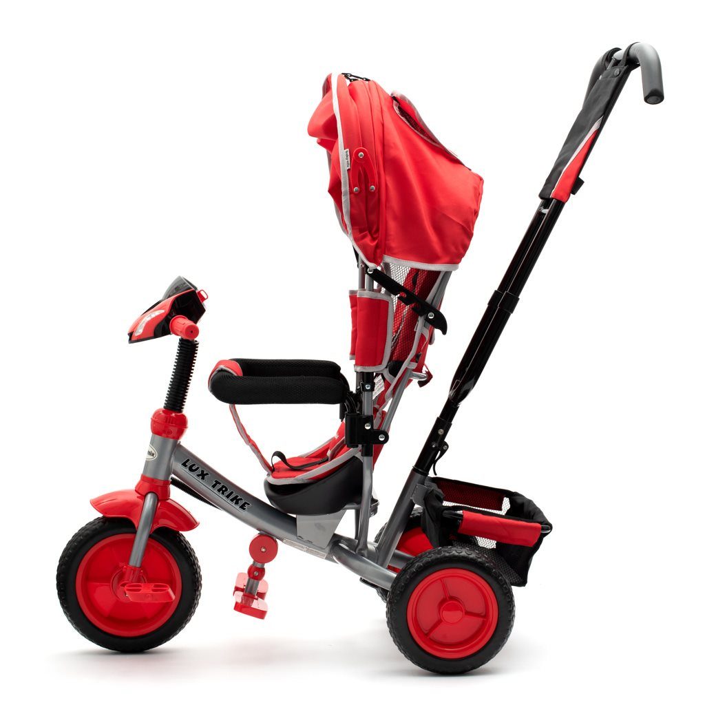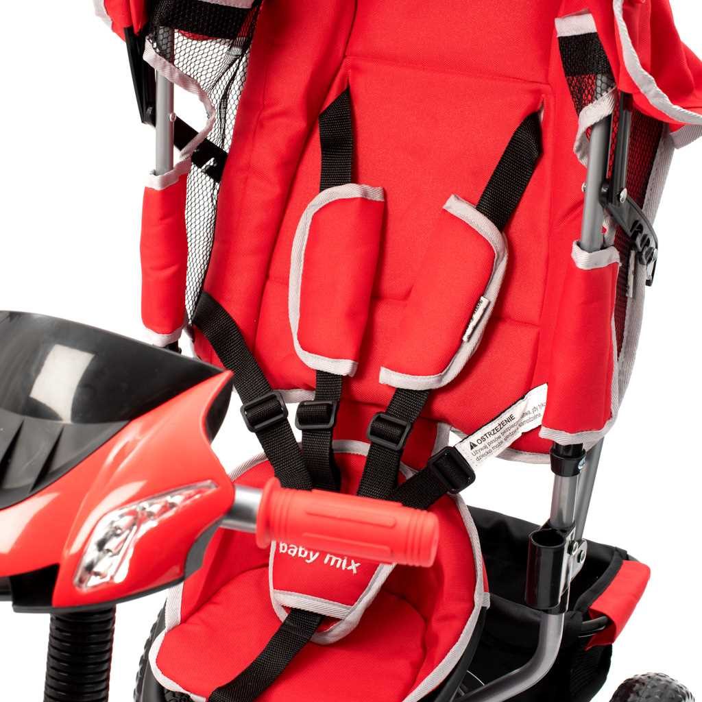 Dětská tříkolka Baby Mix Lux Trike je určena pro děti od 18 do 36 měsíců věku. Je vybavena ovládacím panelem, který je umístěný na řídítkách. Přední část panelu obsahuje LED světla a směrovky. Na zadní straně panelu, směrem k dítěti, jsou pak umístěna tlačítka pro zapínání světel, směrovek, včetně imitace zvuku směrovek, klakson a otočný ovladač po jehož otočení tříkolka vydává zvuk nastartování motoru a rozjezdu závodního auta. Pohodlí a bezpečí během letních procházek pak zajišťuje měkká opěrka, přední madlo a také skládací stříška. Ochranné madlo je snadno odnímatelné. Pro uložení hraček nebo potřeb pro dítě slouží úložný košík a praktická kapsička na zadní straně tříkolky. Tříkolka je určena pro děti od 18 do 36 měsíců věku.