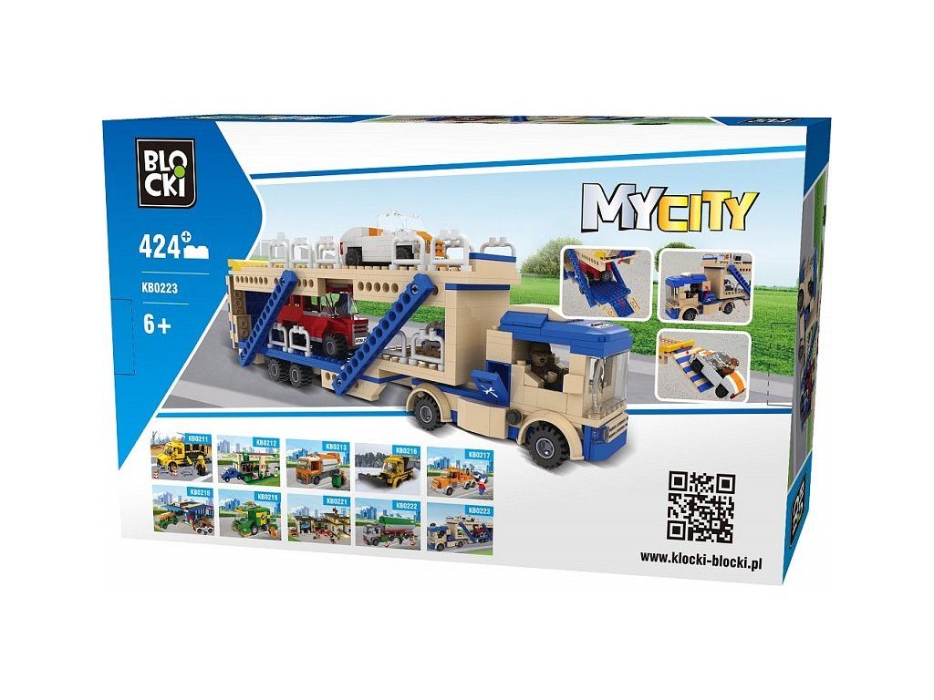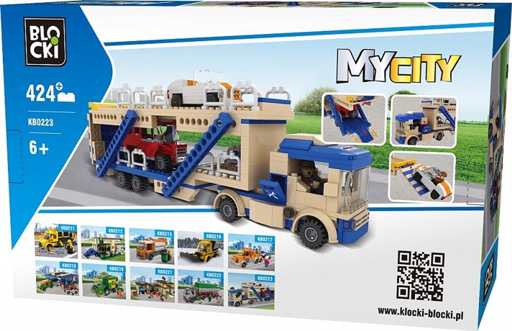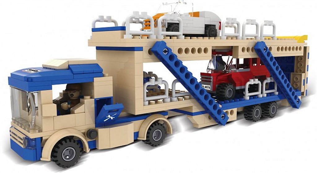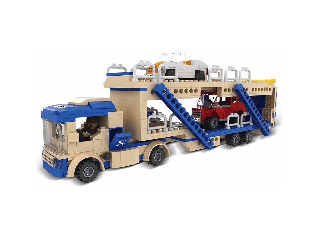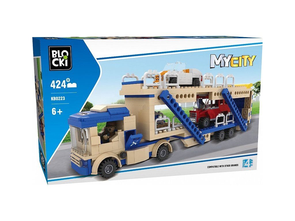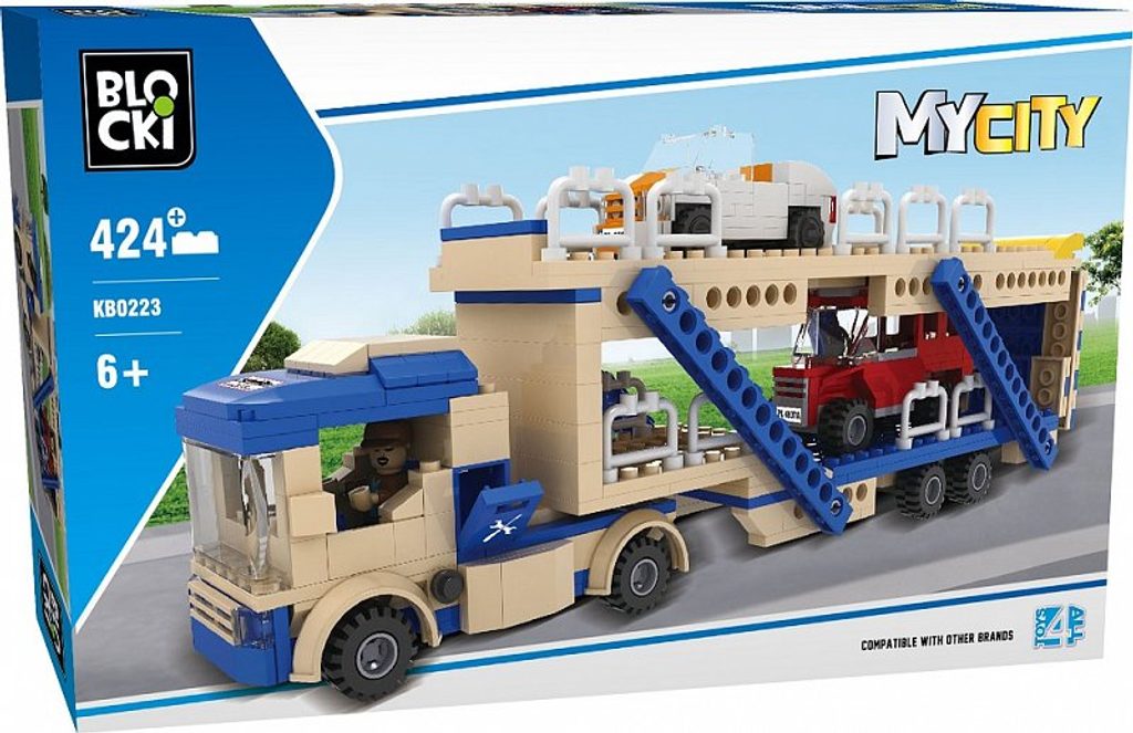 Stavebnice Blocki auto s návěsem umožní Vašemu dítěti stát se skutečným řidičem tahače na převoz aut. Stavebnice se skládá ze 424 dílků, obsahuje nákladní tahač s dvoupatrovým přívěsem, figurku řidiče obsluhy a 2 autíčka. Stavebnice zaručí dětem mnoho hodin zábavy, pomůže jim rozvíjet kreativitu, manuální dovednosti a zlepšuje logické myšlení. Stavebnice je kompatibilní se stavebnicemi ostatních světových značek jako je Lego, Sluban apod. Všechny dílky stavebnice se velmi snadno propojují a jsou vyrobeny z kvalitního plastu.