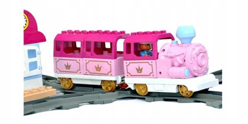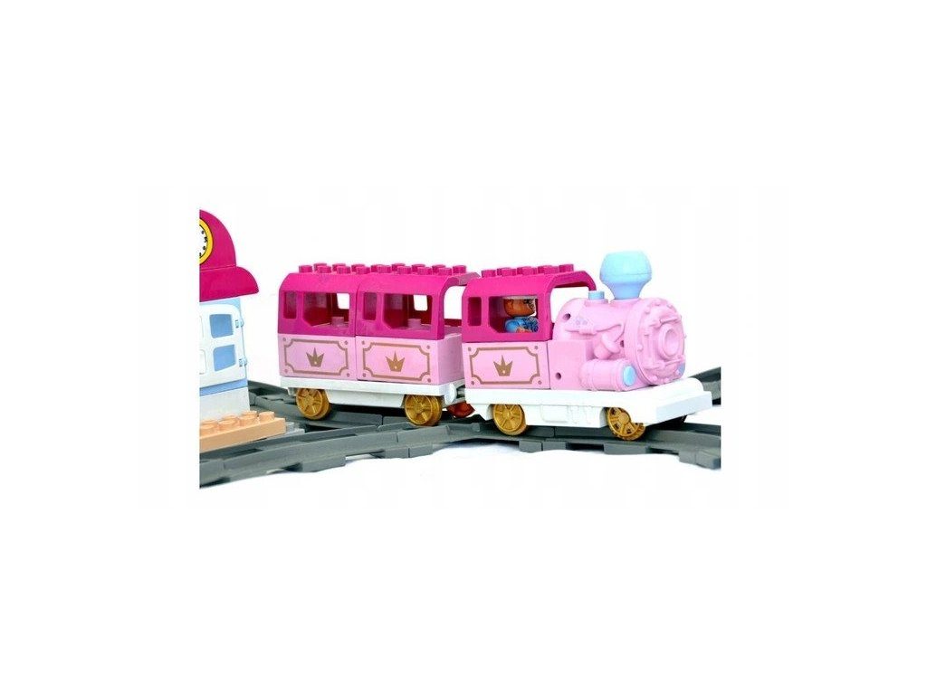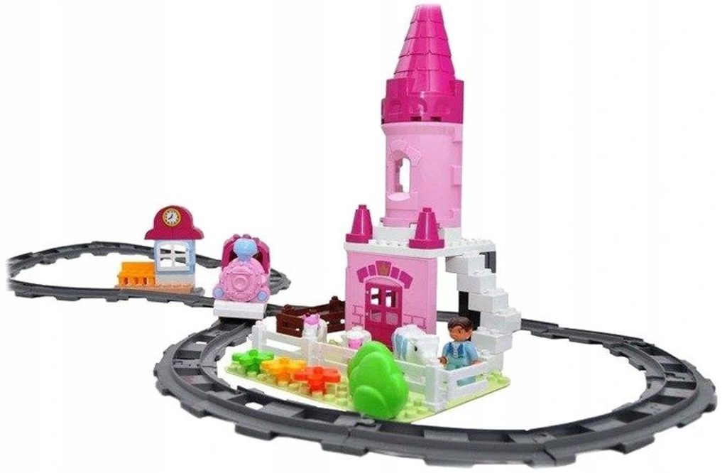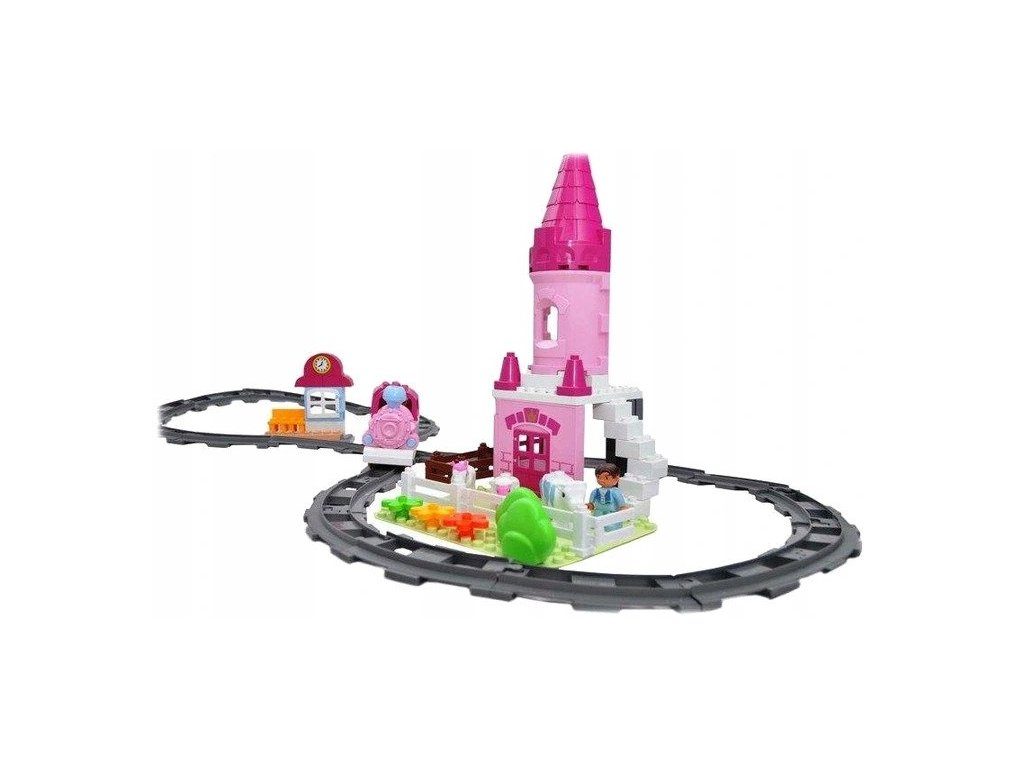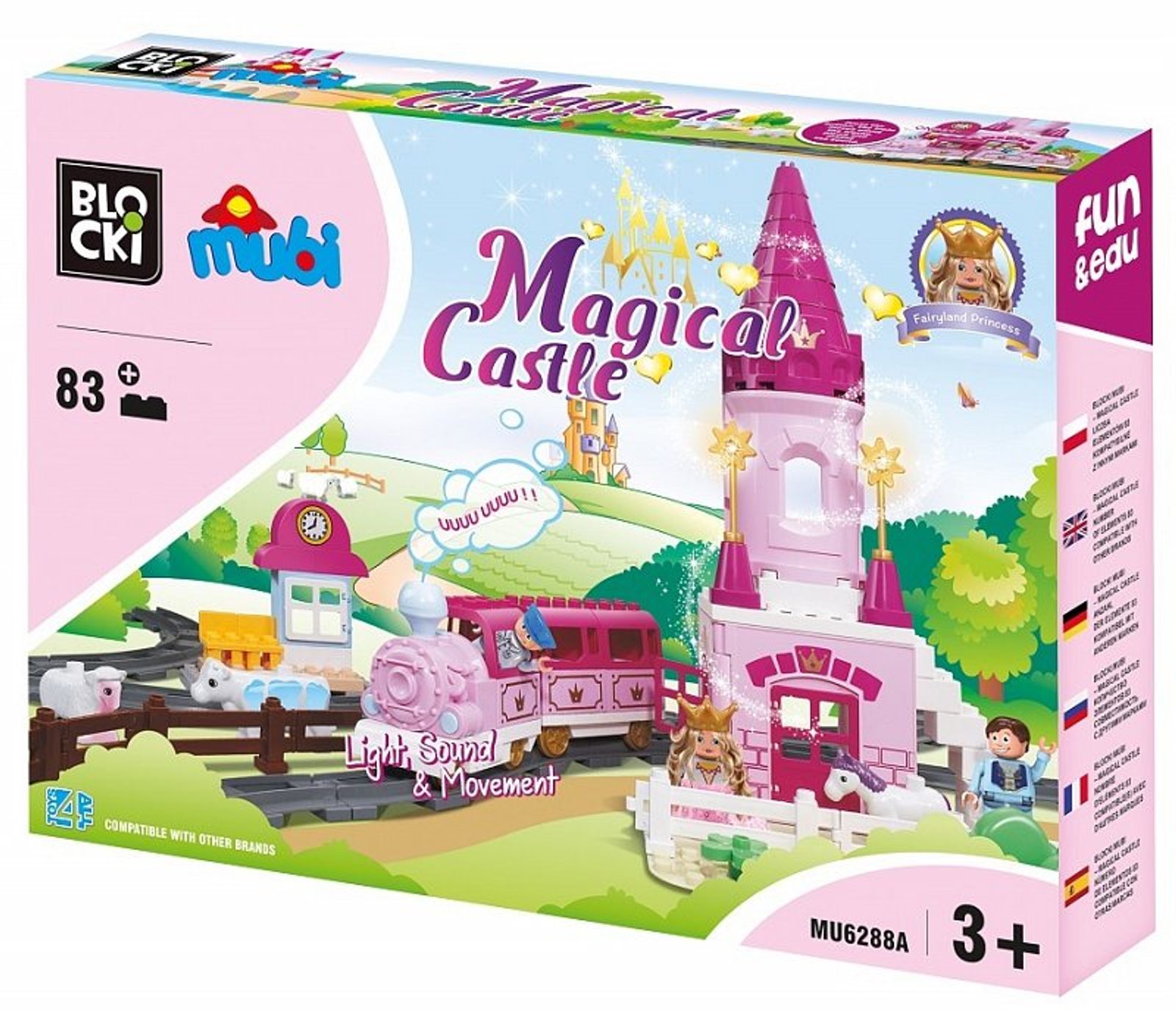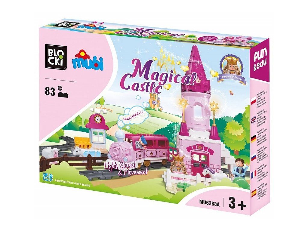 Stavebnice Blocki Mubi Pohádkový zámek se světlem a zvuky udělá z Vašeho dítěte pravou princeznu nebo prince. Pohádkový palác s příslušenstvím v nádherném barevném provedení. Součástí stavebnice je celkem 6 figurek: princ, princezna, strojvůdve, koník, kravička a ovečka. Stavebnice obsahuje celkem 25 kusů kolejových dílů, které spojením vytvoří kolejiště o rozměru 133x58 cm. Lokomotiva je napájena bateriemi a při jízdě po kolejích svítí, hýbe komínkem a vydává zvuky vláčku. Stavebnice zaručí dětem mnoho hodin zábavy, pomůže jim rozvíjet kreativitu, manuální dovednosti a zlepšuje logické myšlení. Stavebnice je kompatibilní se stavebnicemi ostatních světových značek jako je Lego Duplo a další. Všechny dílky stavebnice se velmi snadno propojují a jsou vyrobeny z kvalitního plastu. Tato stavebnice je určena pro děti od 3 let věku.