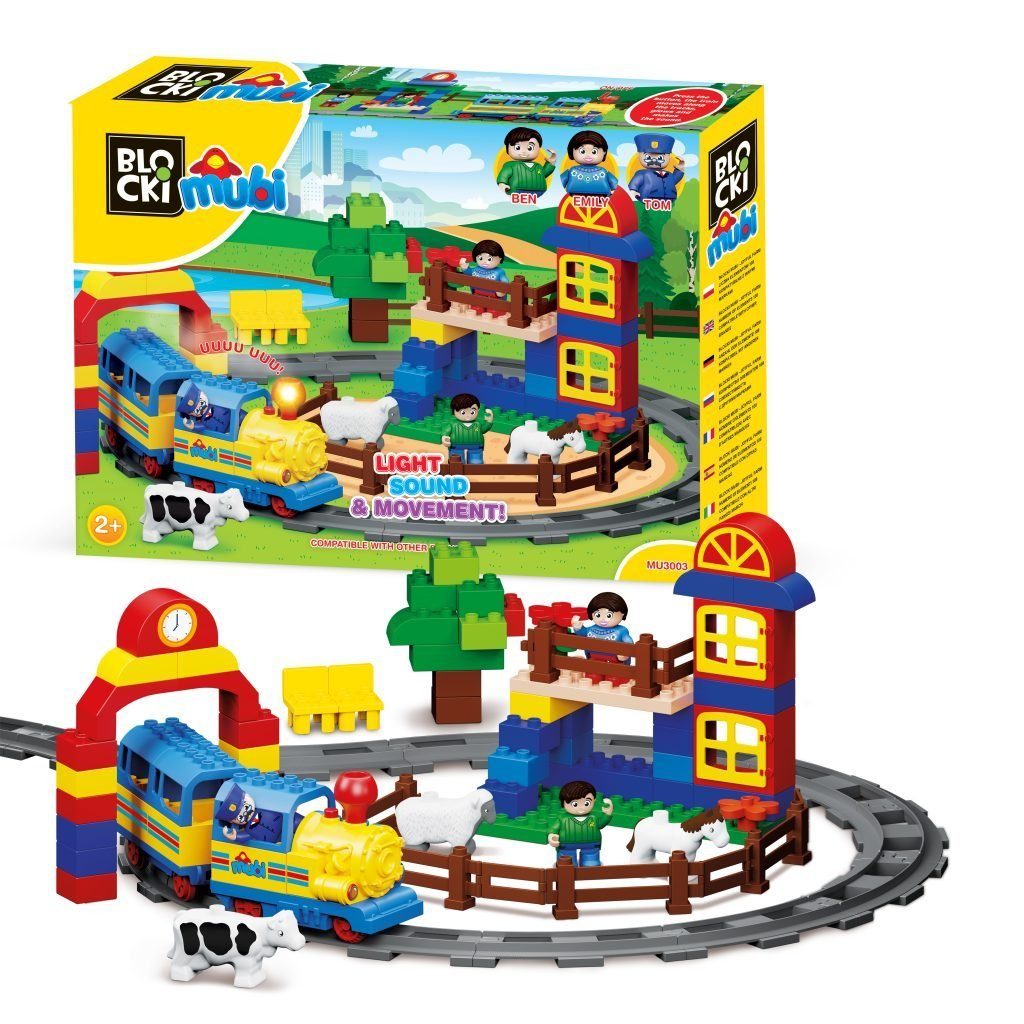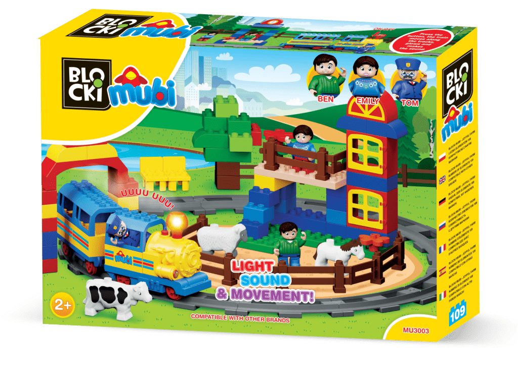 Stavebnice Blocki Mubi Veselá farma se světlem a zvuky udělá z Vašeho dítěte pravého farmáře nebo farmářku. Budova farmy s příslušenstvím v nádherném barevném provedení. Součástí stavebnice je celkem 6 figurek: farmář Ben, farmářka Emily, strojvůdce Tom, koník, kravička a ovečka. Stavebnice obsahuje celkem 29 kusů kolejových dílů, které spojením vytvoří kolejiště o rozměru 133x58 cm. Lokomotiva je napájena bateriemi a při jízdě po kolejích svítí a vydává zvuky vláčku. Stavebnice zaručí dětem mnoho hodin zábavy, pomůže jim rozvíjet kreativitu, manuální dovednosti a zlepšuje logické myšlení. Stavebnice je kompatibilní se stavebnicemi ostatních světových značek jako je Lego Duplo a další. Všechny dílky stavebnice se velmi snadno propojují a jsou vyrobeny z kvalitního plastu. Tato stavebnice je určena pro děti od 3 let věku.