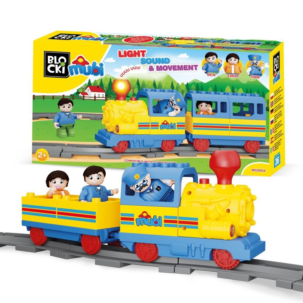 Stavebnice Blocki Mubi Veselý vláček se světlem a zvuky udělá z Vašeho dítěte pravého strojvůdce ve vláčku. Součástí stavebnice jsou celkem 3 figurky: farmář, farmářka a strojvůdce. Stavebnice obsahuje celkem 25 kusů kolejových dílů, které spojením vytvoří kolejiště o rozměru 133x58 cm. Lokomotiva je napájena bateriemi a při jízdě po kolejích svítí, hýbe komínkem a vydává zvuky vláčku. Stavebnice zaručí dětem mnoho hodin zábavy, pomůže jim rozvíjet kreativitu, manuální dovednosti a zlepšuje logické myšlení. Stavebnice je kompatibilní se stavebnicemi ostatních světových značek jako je Lego Duplo a další. Všechny dílky stavebnice se velmi snadno propojují a jsou vyrobeny z kvalitního plastu. Tato stavebnice je určena pro děti od 3 let věku.
