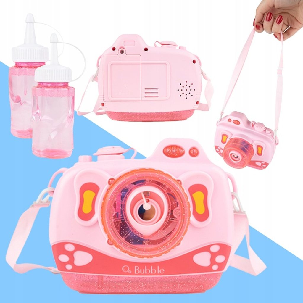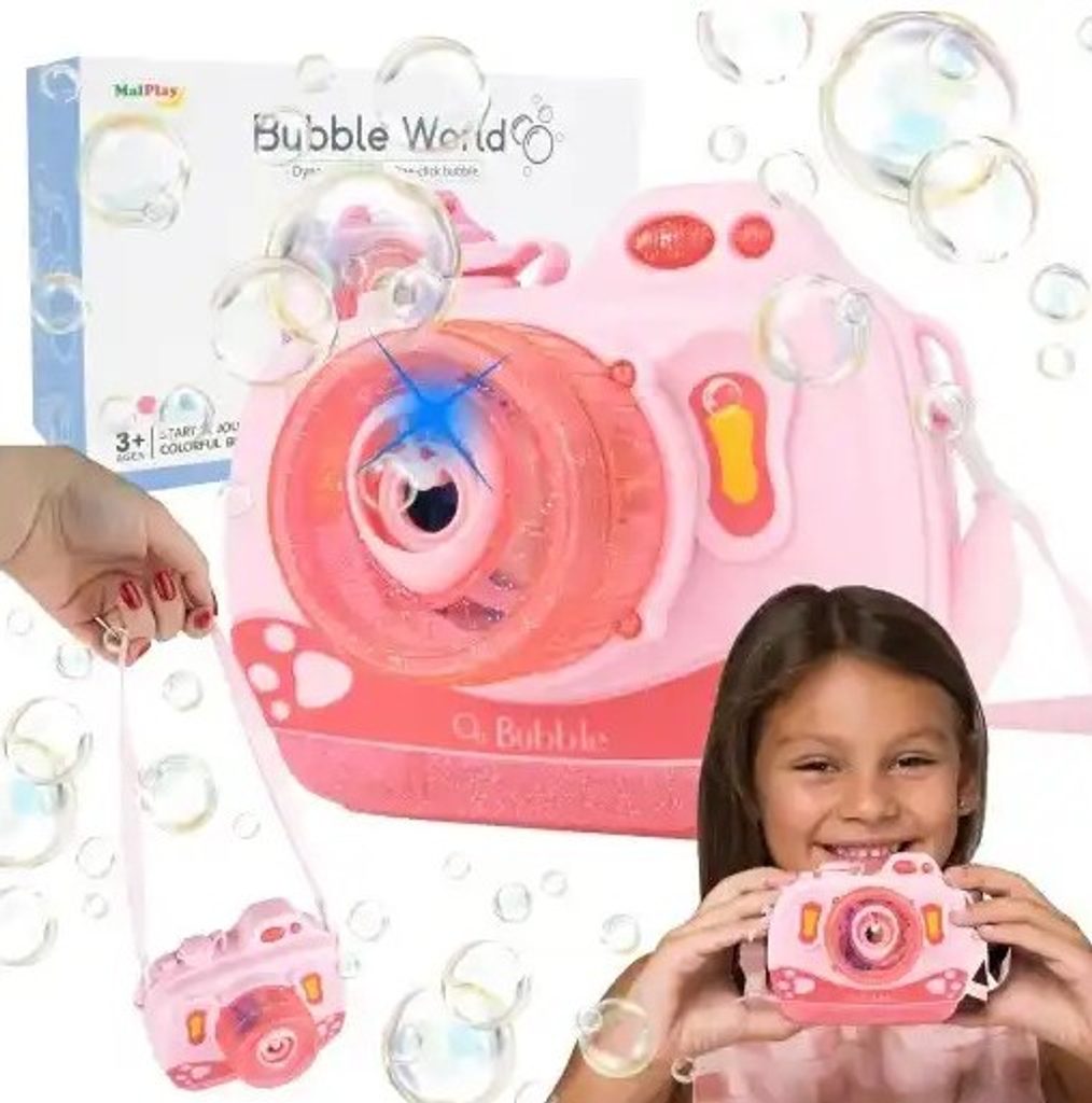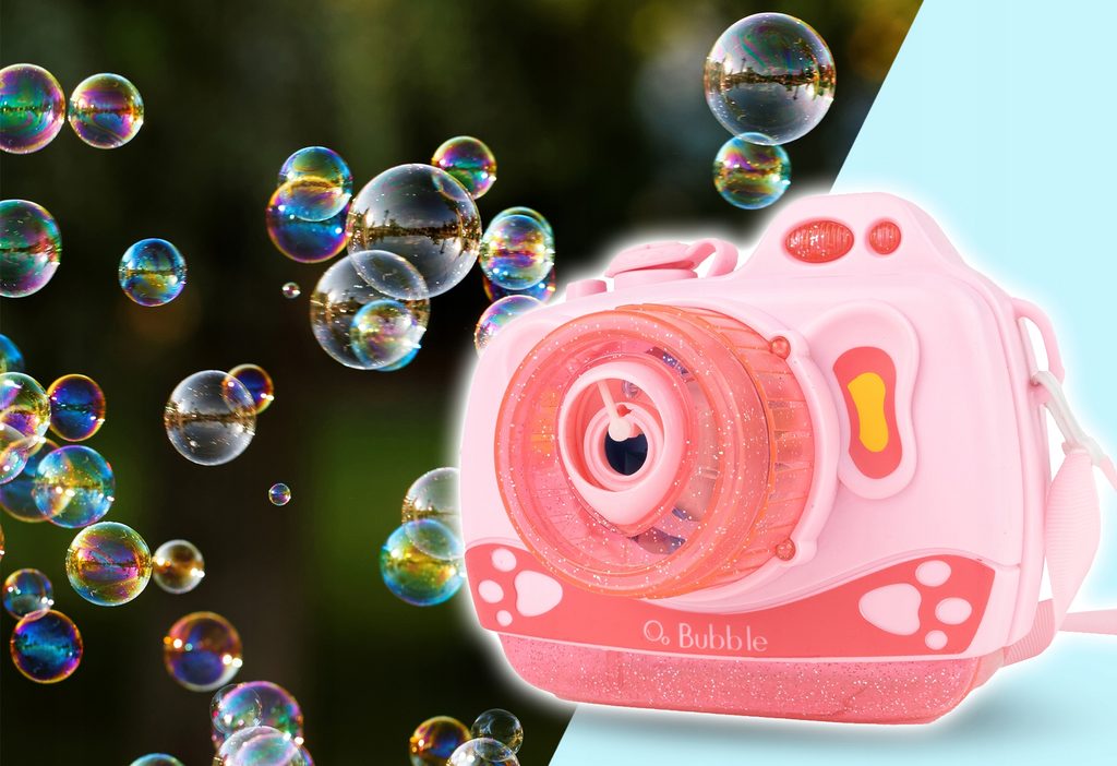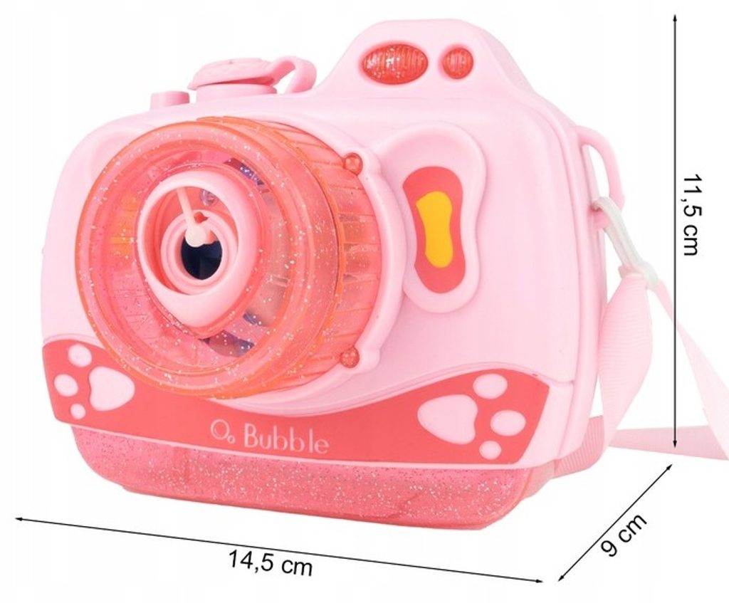 Dětský bublifuk ve tvaru fotoaparátu Bubble Cam dokáže vytvořit nekonečné množství bublin. Nejdříve je třeba nasadit lahvičku s mýdlovým roztokem přímo do boční části bublifuku. Zmáčknutím spouště fotoaparátu se začnou z přední části generovat bubliny za současného zvuku písničky a dětského smíchu. Součástí balení je i popruh o délce 70 cm k zavěšení fotoaparátu kolem krku. Hračka je vyrobena z plastu a je určena pro děti od 36 měsíců věku.
