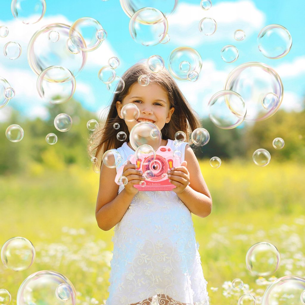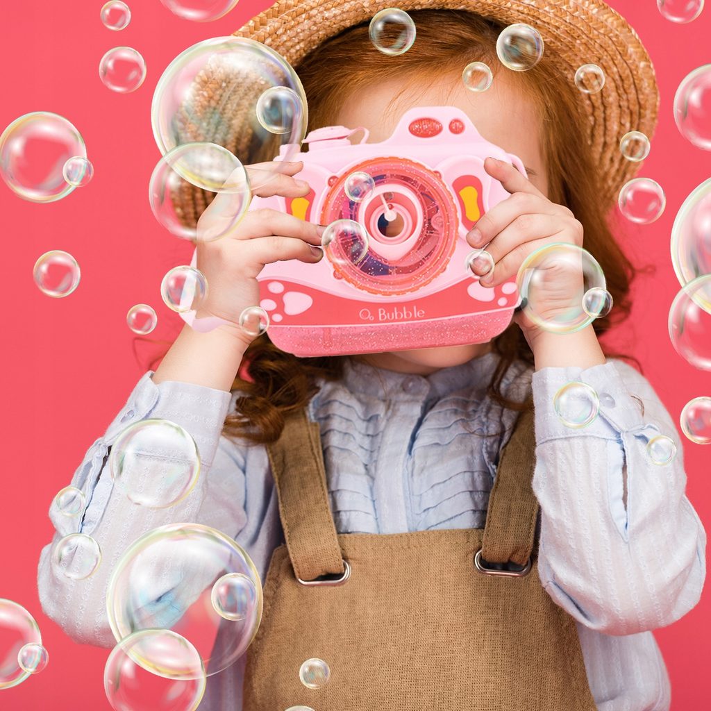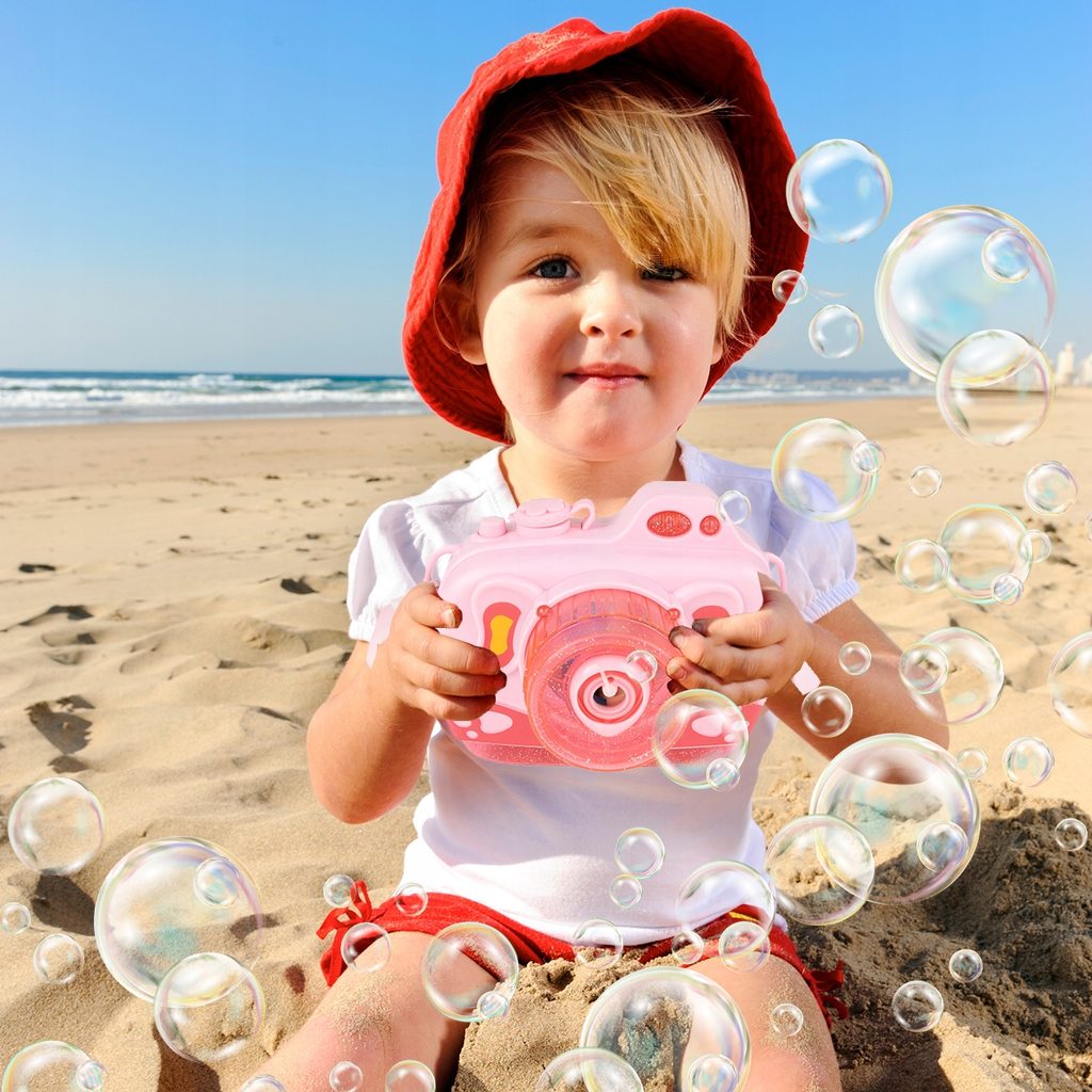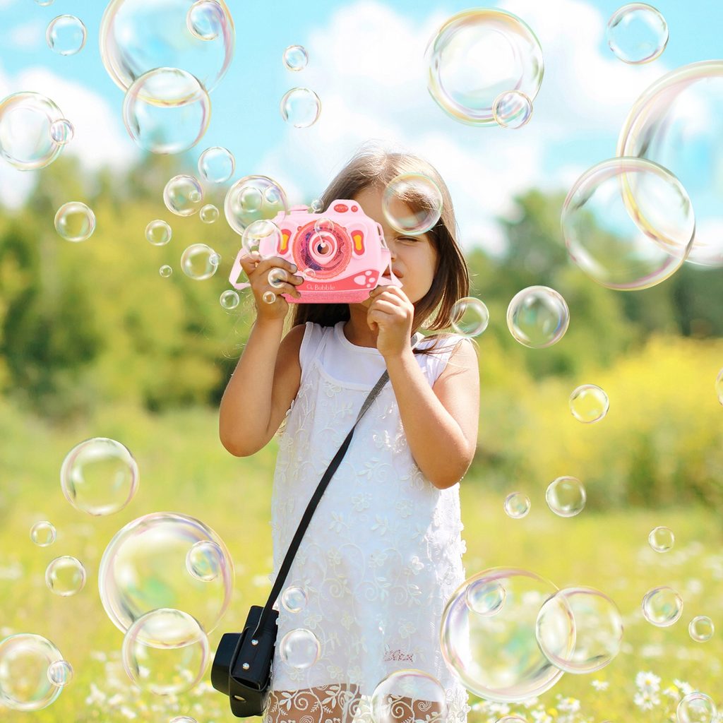 Dětský bublifuk ve tvaru fotoaparátu Bubble Cam dokáže vytvořit nekonečné množství bublin. Nejdříve je třeba nasadit lahvičku s mýdlovým roztokem přímo do boční části bublifuku. Zmáčknutím spouště fotoaparátu se začnou z přední části generovat bubliny za současného zvuku písničky a dětského smíchu. Součástí balení je i popruh o délce 70 cm k zavěšení fotoaparátu kolem krku. Hračka je vyrobena z plastu a je určena pro děti od 36 měsíců věku.