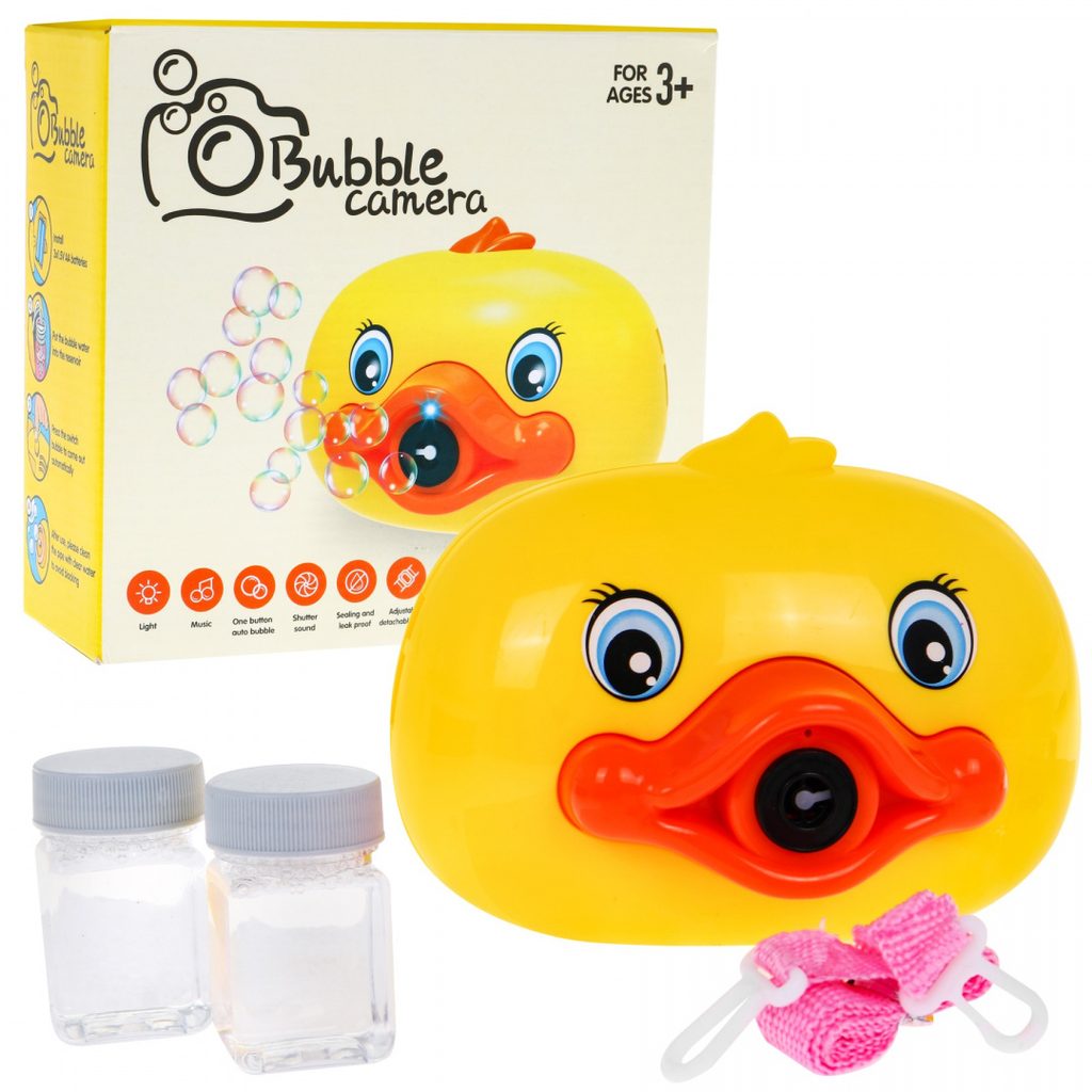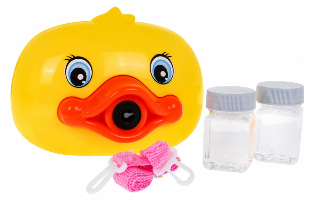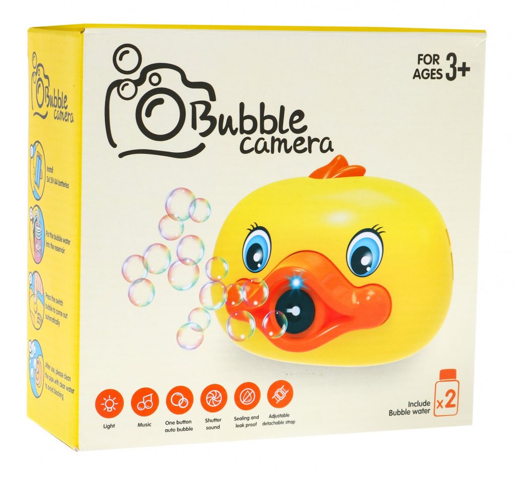 Dětský bublifuk ve tvaru fotoaparátu Kačenka dokáže vytvořit nekonečné množství bublin. Nejdříve je třeba nasadit lahvičku s mýdlovým roztokem přímo do zadní části bublifuku. Zmáčknutím spouště fotoaparátu se začnou z přední části generovat bubliny za současného zvuku melodie. Součástí balení je i popruh k zavěšení fotoaparátu kolem krku. Hračka je vyrobena z plastu a je určena pro děti od 36 měsíců věku.
