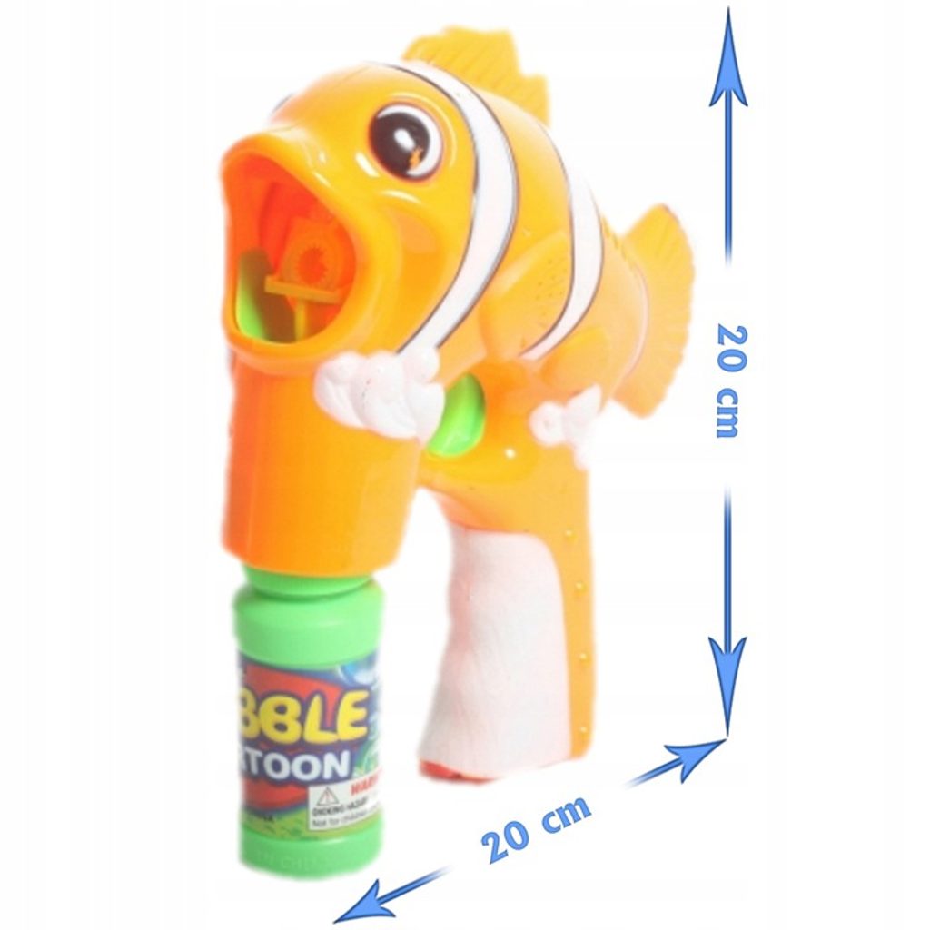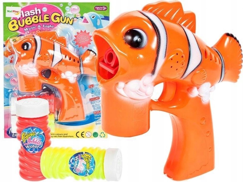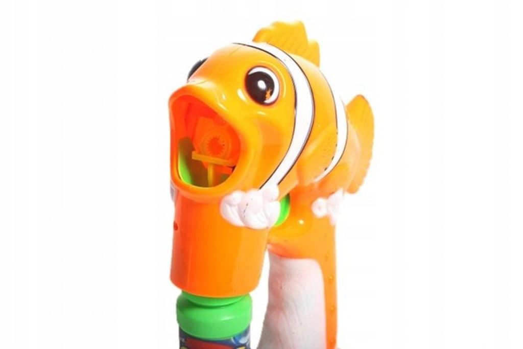 Dětský bublifuk ve tvaru oranžové rybky dokáže vytvořit nekonečné množství bublin. Nejdříve je třeba nasadit lahvičku s mýdlovým roztokem přímo do bublifuku. Zmáčknutím spouště se spouští generátor bublin za současného zvuku. Po ukončení hry je třeba lahvičku z bublifuku demontovat a otřít ho suchým hadříkem. Hračka je vyrobena z plastu a je určena pro děti od 36 měsíců věku.