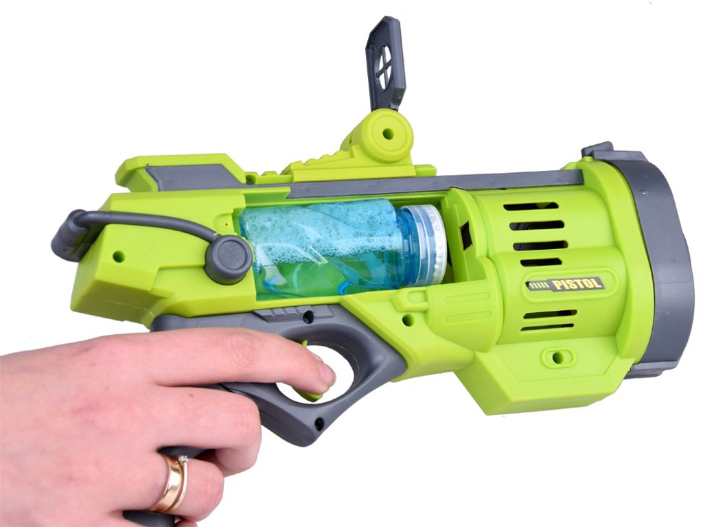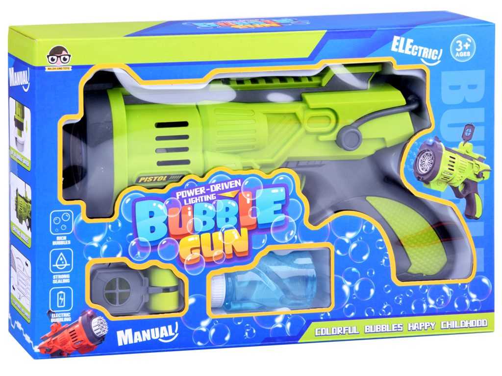 Dětský bublifuk ve tvaru pistole se zaměřovačem Bubble Gun dokáže vytvořit nekonečné množství bublin za velmi krátkou dobu. Nejdříve je třeba nasadit lahvičku s mýdlovým roztokem přímo do bublifuku. Poté už jen stačí zmáčknout spoušť a začnou se generovat bubliny. Po ukončení hry je třeba lahvičku z bublifuku demontovat a otřít ho suchým hadříkem. Hračka je vyrobena z plastu a je určena pro děti od 36 měsíců věku.