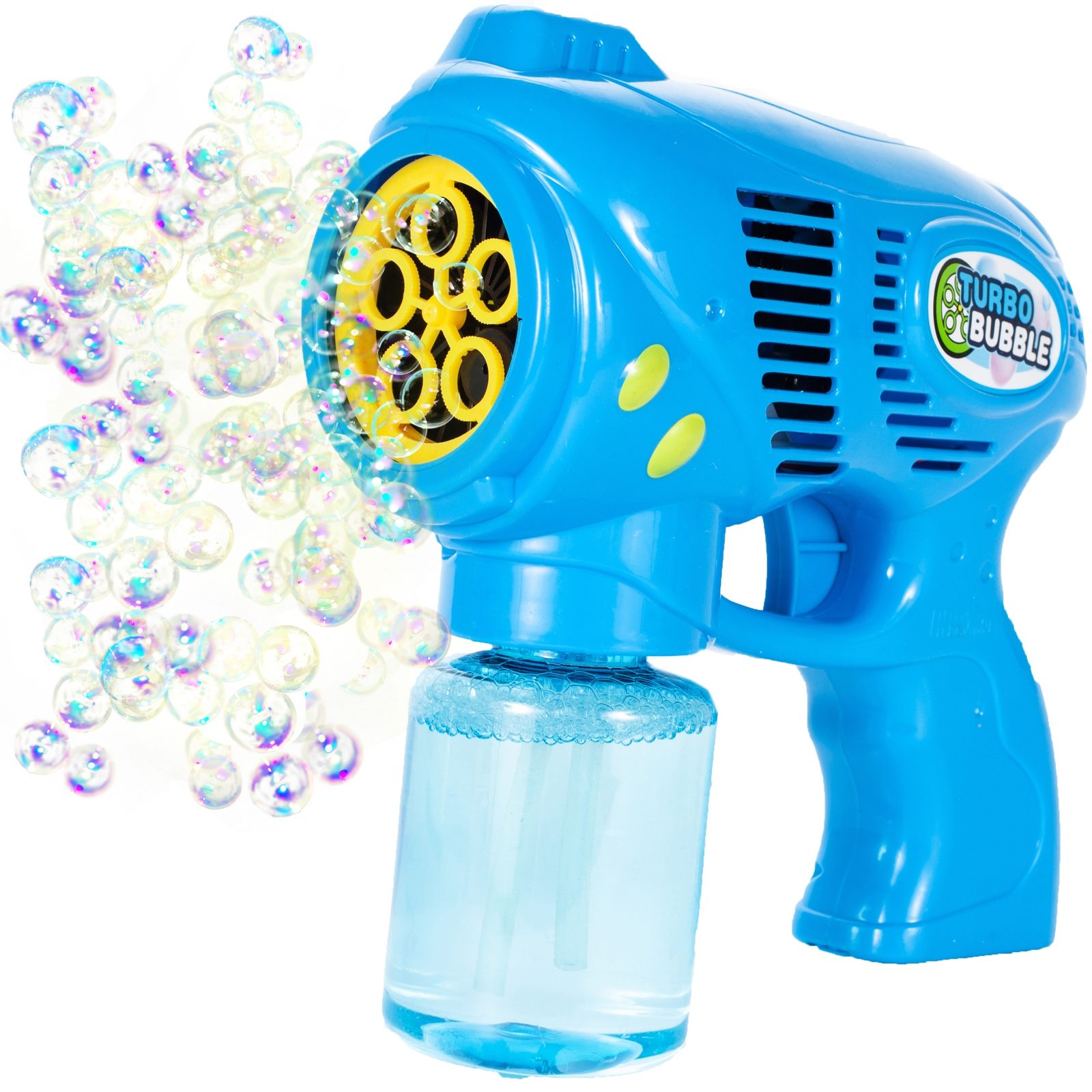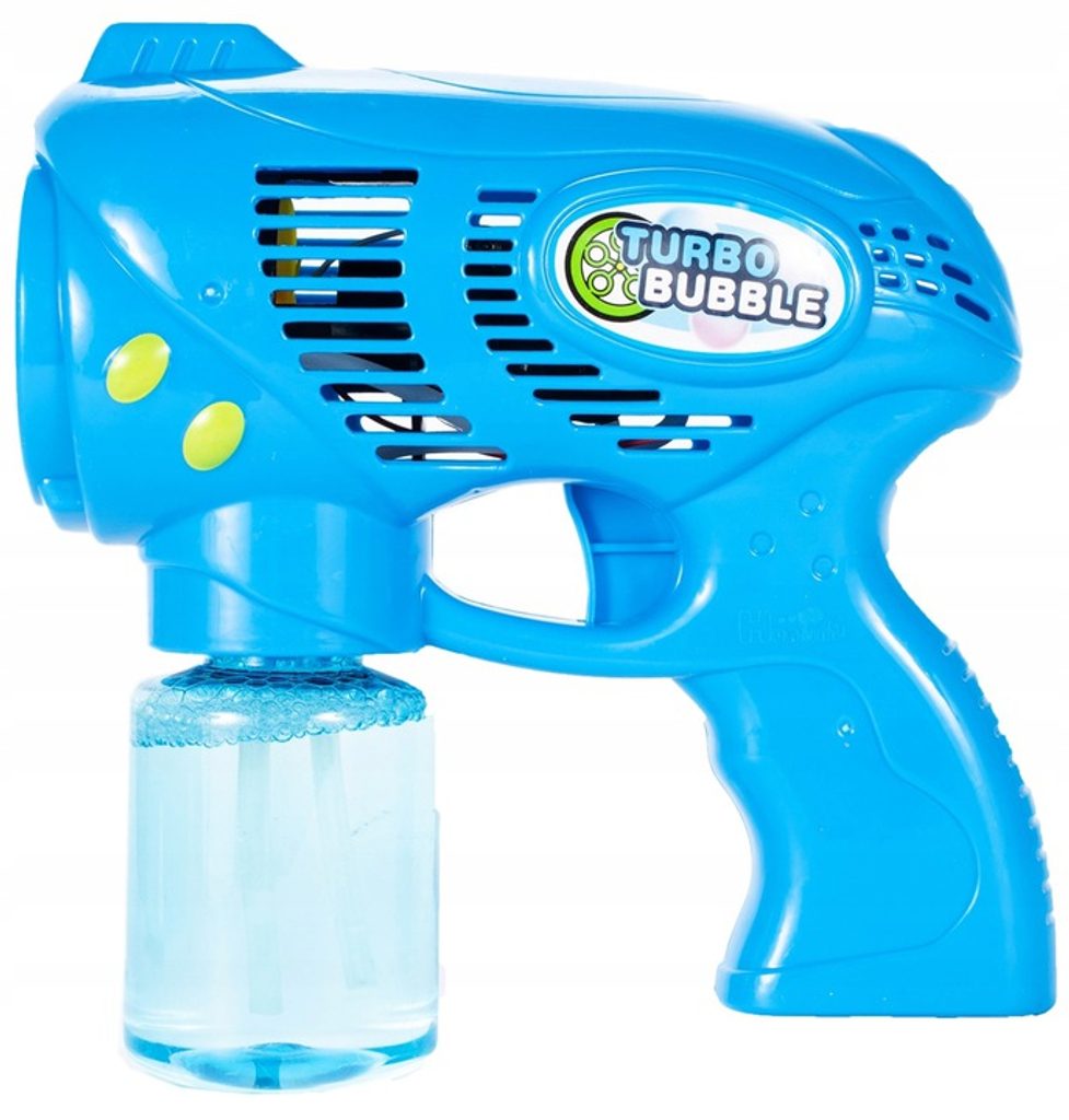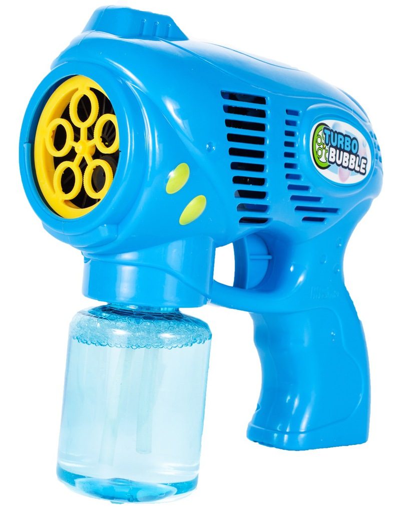 Dětský bublifuk ve tvaru pistole Turbo Bubble dokáže vytvořit nekonečné množství bublin za velmi krátkou dobu. Nejdříve je třeba nasadit lahvičku s mýdlovým roztokem přímo do spodní části bublifuku. Poté už jen stačí zmáčknout spoušť a začnou se generovat bubliny. Po ukončení hry je třeba lahvičku z bublifuku demontovat a otřít ho suchým hadříkem. Hračka je vyrobena z plastu a je určena pro děti od 36 měsíců věku.