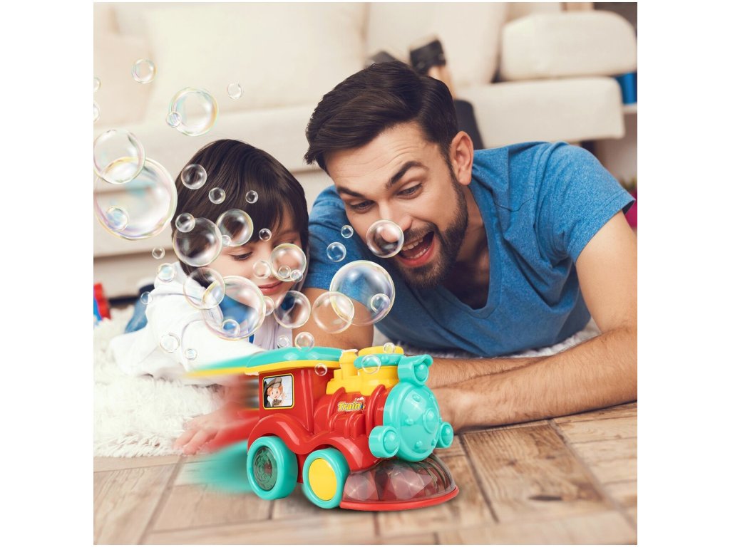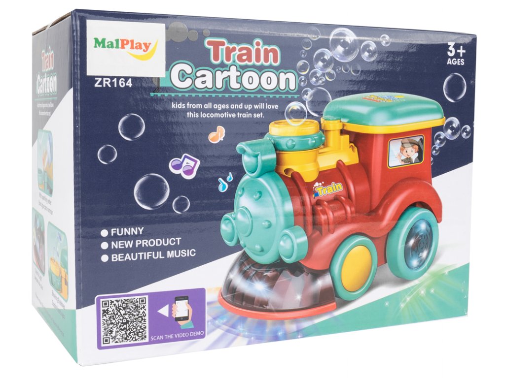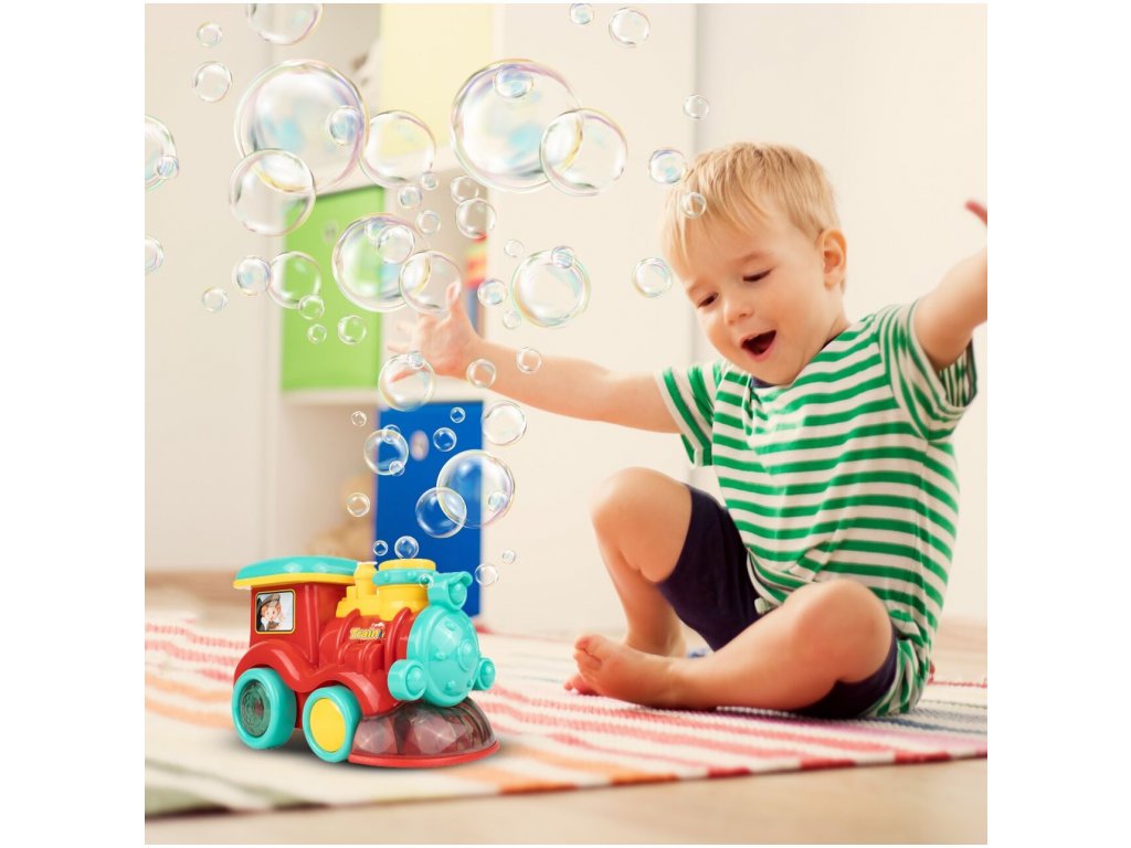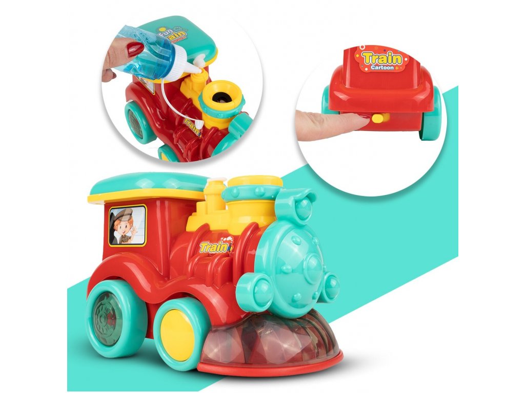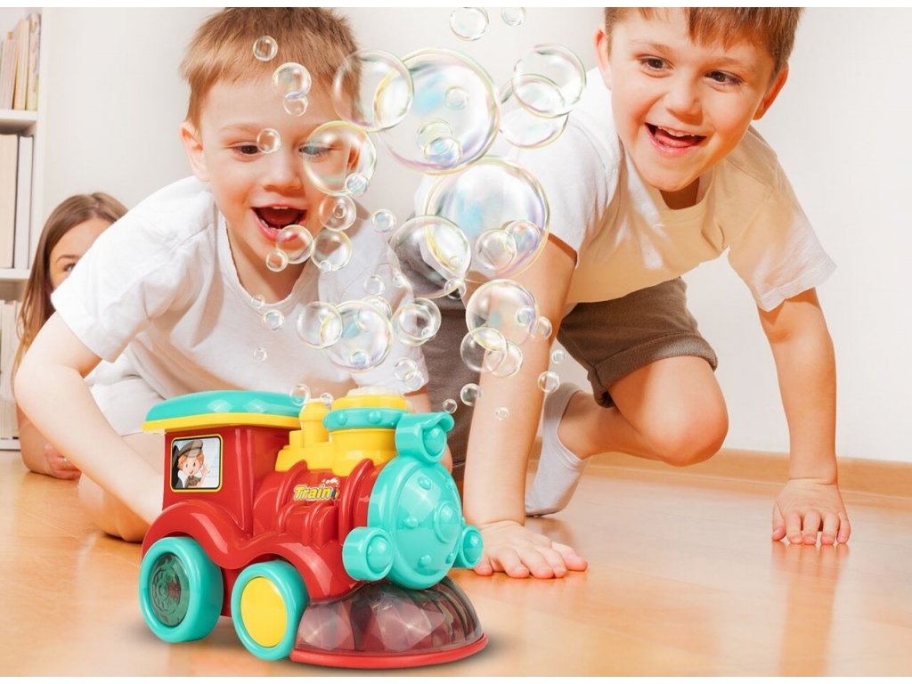 Dětská lokomotiva s bublifukem Happy Train dokáže vytvořit nekonečné množství bublin. Má nádrž umístěnou v motoru do které se nalévá mýdlový roztok. Bubliny vychází s komínu lokomotivy. Během jízdy se spustí melodie a rozsvítí zadní kola. Lokomotiva jezdí všemi směra. Hračka je vyrobena z plastu a je určena pro děti od 36 měsíců věku.