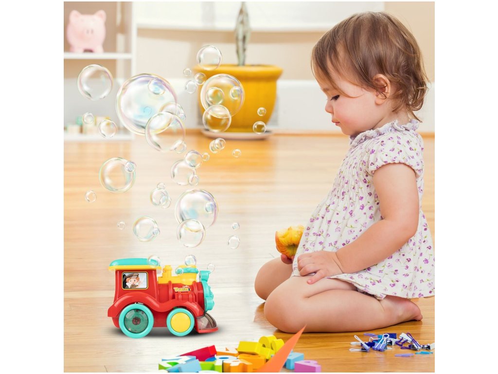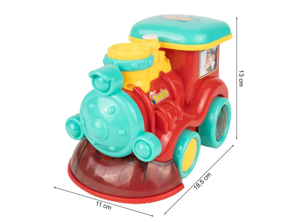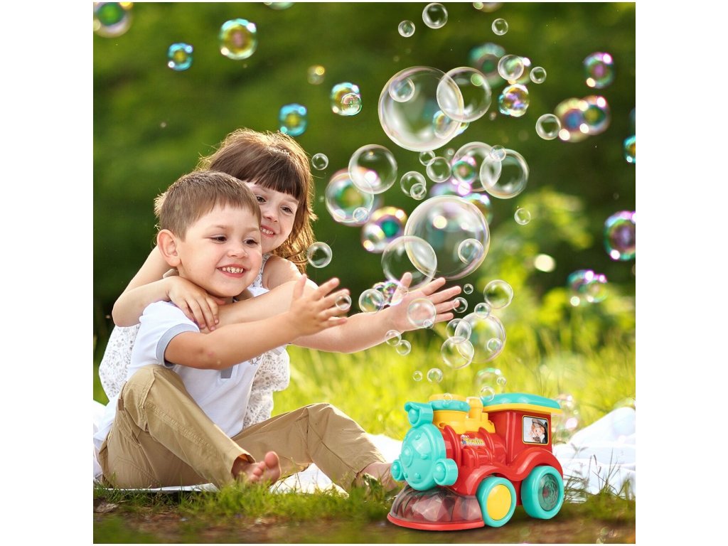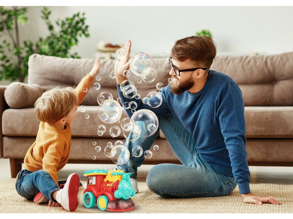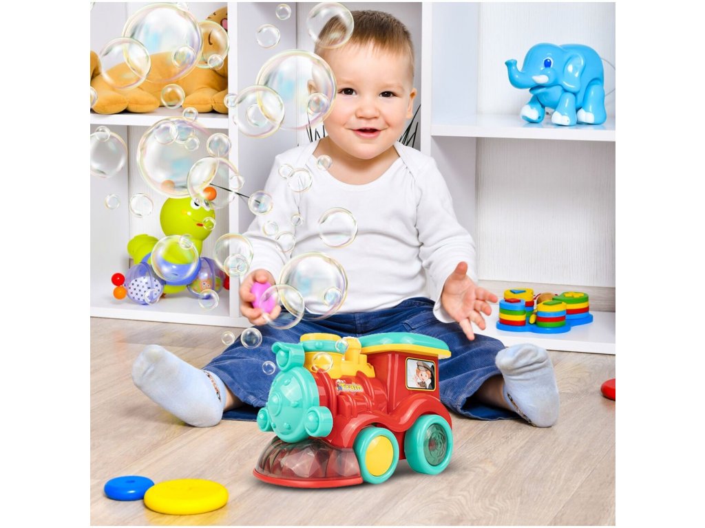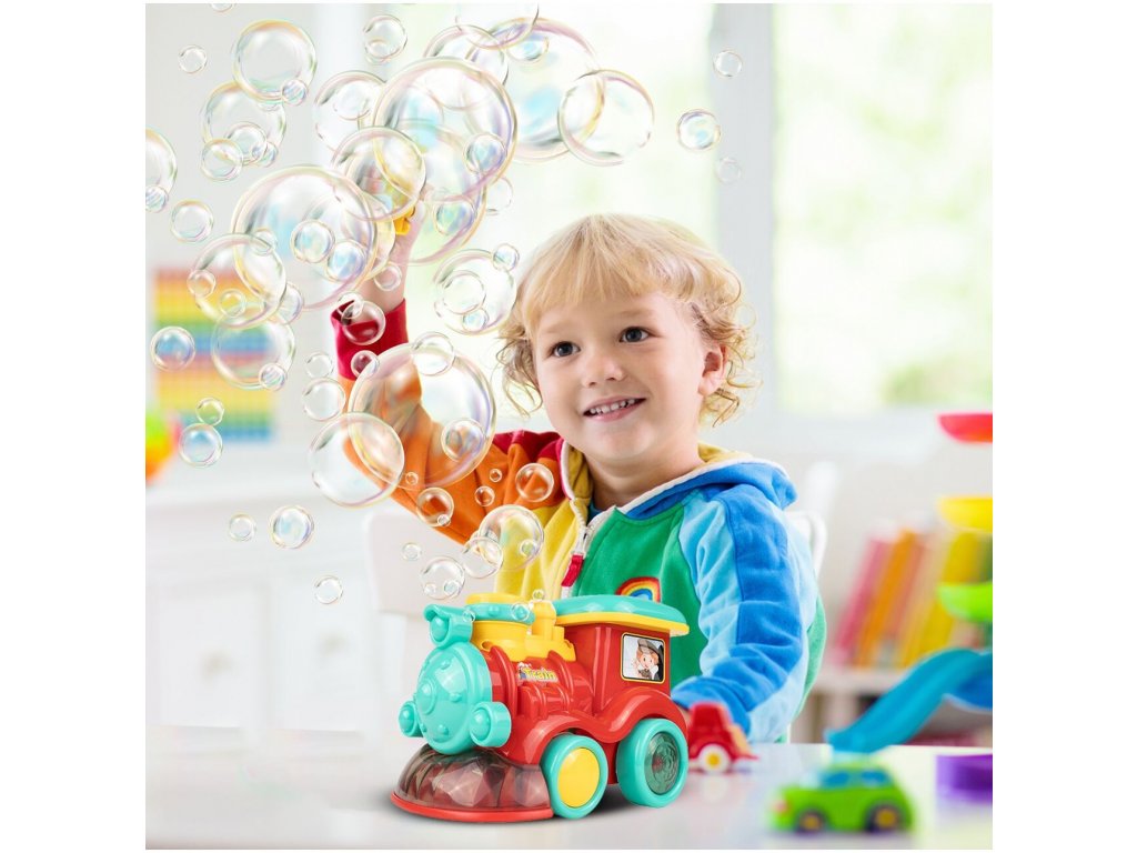 Dětská lokomotiva s bublifukem Happy Train dokáže vytvořit nekonečné množství bublin. Má nádrž umístěnou v motoru do které se nalévá mýdlový roztok. Bubliny vychází s komínu lokomotivy. Během jízdy se spustí melodie a rozsvítí zadní kola. Lokomotiva jezdí všemi směra. Hračka je vyrobena z plastu a je určena pro děti od 36 měsíců věku.