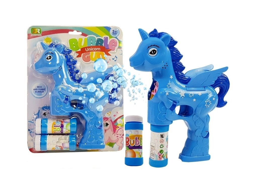 Dětský bublifuk ve tvaru modrého jednorožce dokáže vytvořit nekonečné množství bublin. Nejdříve je třeba nasadit lahvičku s mýdlovým roztokem přímo do bublifuku. Zmáčknutím spouště se spouští generátor bublin za současného zvuku řehtání. Po ukončení hry je třeba lahvičku z bublifuku demontovat a otřít ho suchým hadříkem. Hračka je vyrobena z plastu a je určena pro děti od 36 měsíců věku.