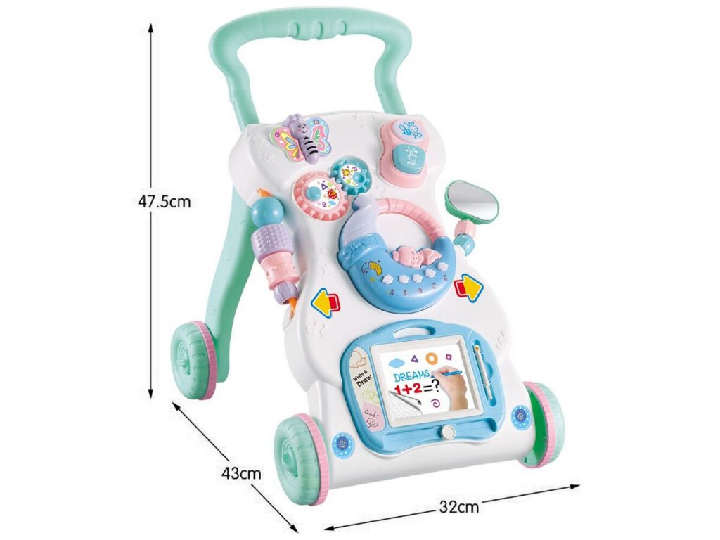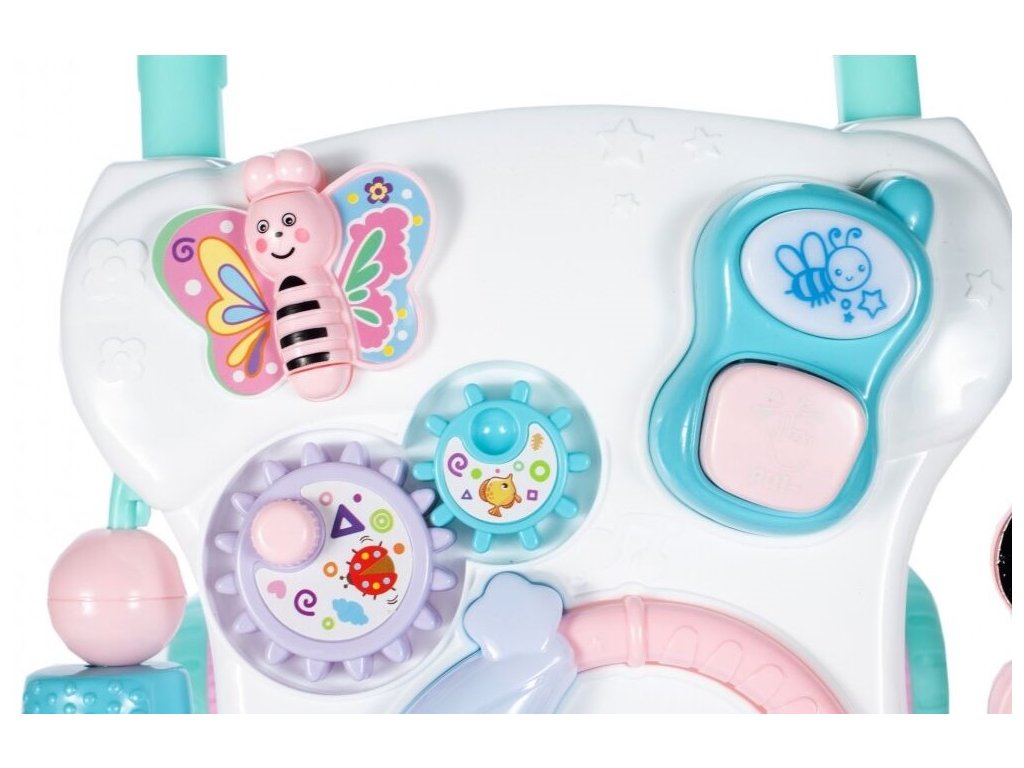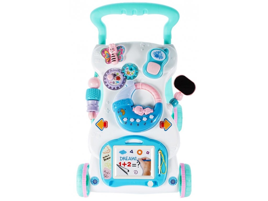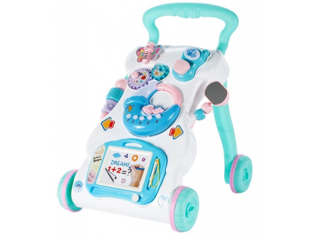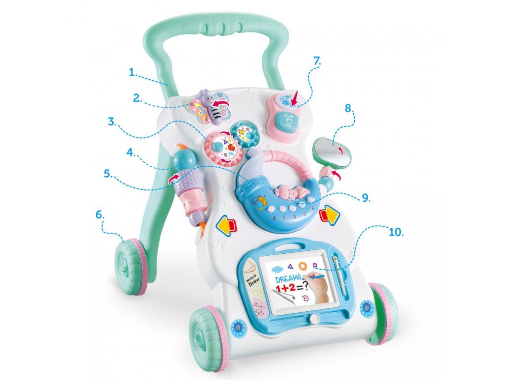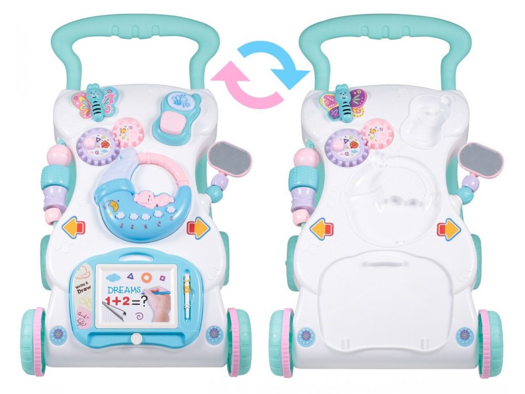 Dětské multifunkční chodítko 2v1 White Walker pro ty nejmenší děti, edukační centrum. Je vyrobeno ve tvaru písmene A se dvěma rameny, které dítěti pomáhá udržet rovnováhu a stabilitu při chůzi. Chodítko je vybaveno motýlkem s křidélky, ozubenými kolečky, mobilním telefonem s tlačítkem, kreslící tabulí a malým piánkem s melodiemi a zvuky. Na pravé straně je umístěno zrcátko pro bezpečnost dítěte. V horní části chodítka je umístěn držák pomocí kterého dítě snadno udrží rovnováhu a nespadne na zem. Určeno pro děti od 6 měsíců věku.