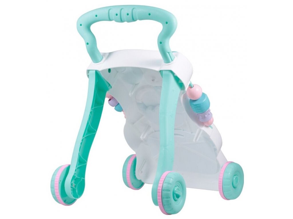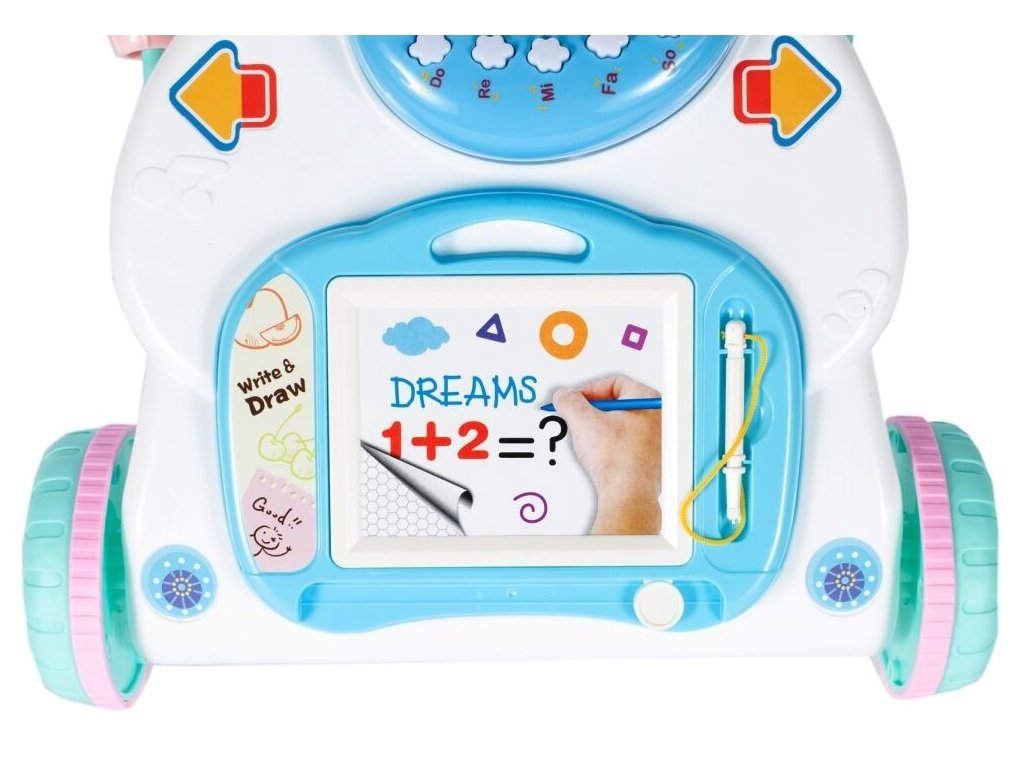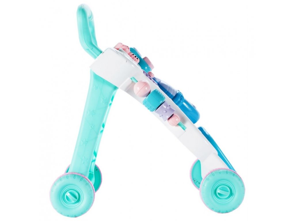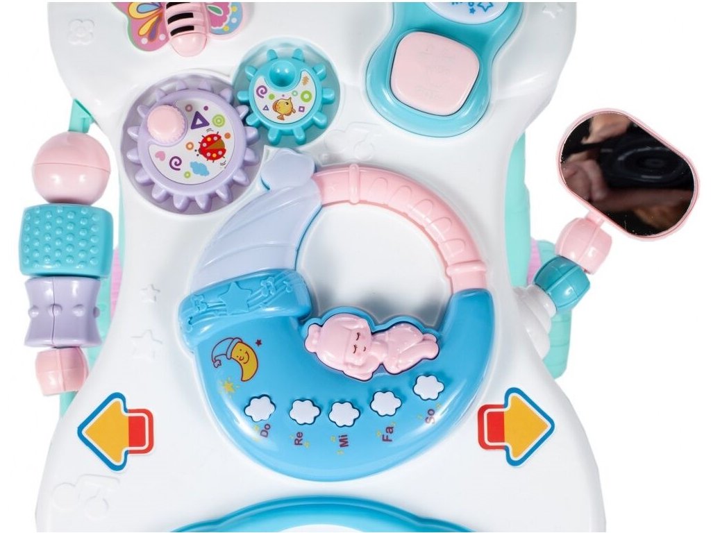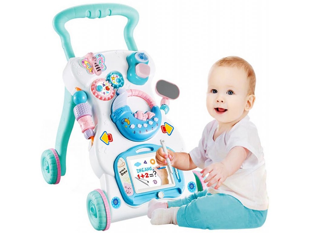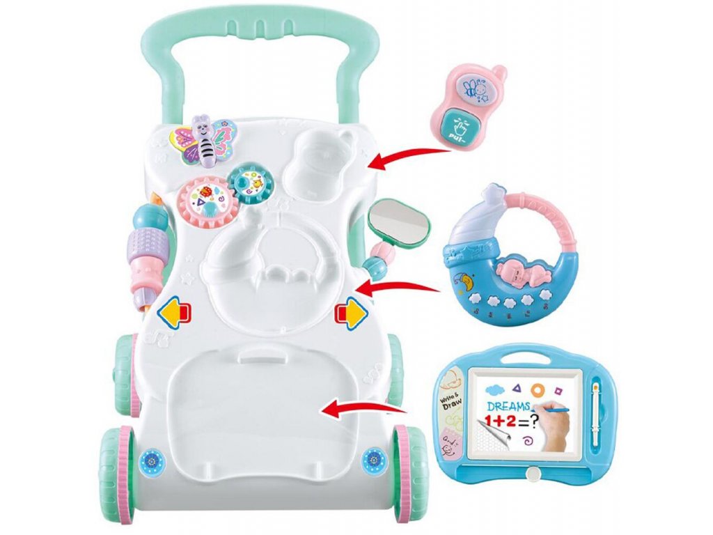 Dětské multifunkční chodítko 2v1 White Walker pro ty nejmenší děti, edukační centrum. Je vyrobeno ve tvaru písmene A se dvěma rameny, které dítěti pomáhá udržet rovnováhu a stabilitu při chůzi. Chodítko je vybaveno motýlkem s křidélky, ozubenými kolečky, mobilním telefonem s tlačítkem, kreslící tabulí a malým piánkem s melodiemi a zvuky. Na pravé straně je umístěno zrcátko pro bezpečnost dítěte. V horní části chodítka je umístěn držák pomocí kterého dítě snadno udrží rovnováhu a nespadne na zem. Určeno pro děti od 6 měsíců věku.