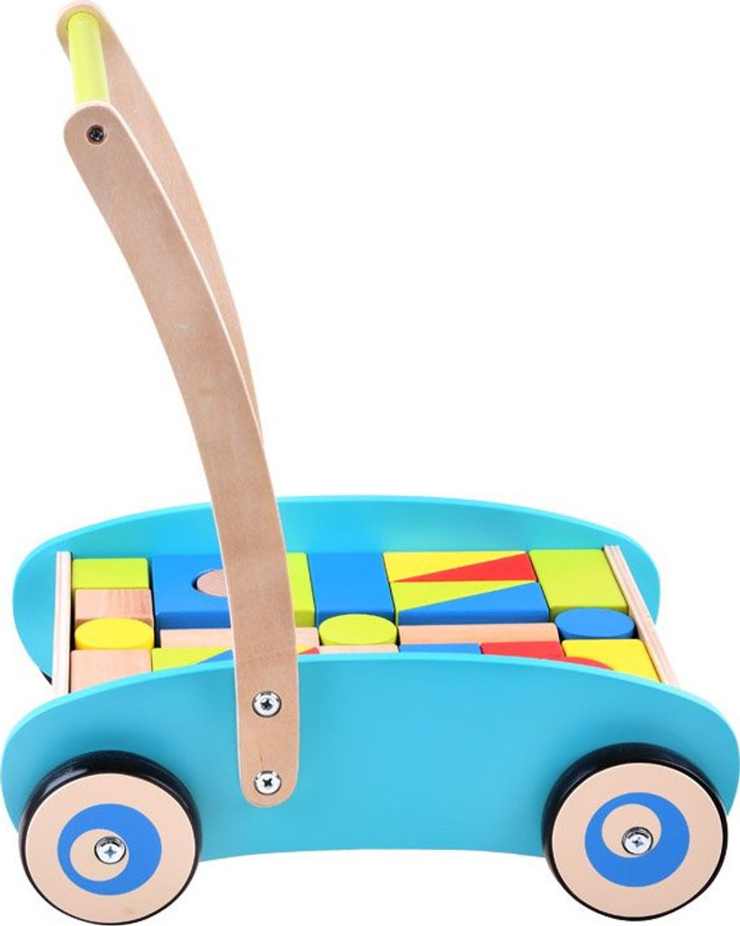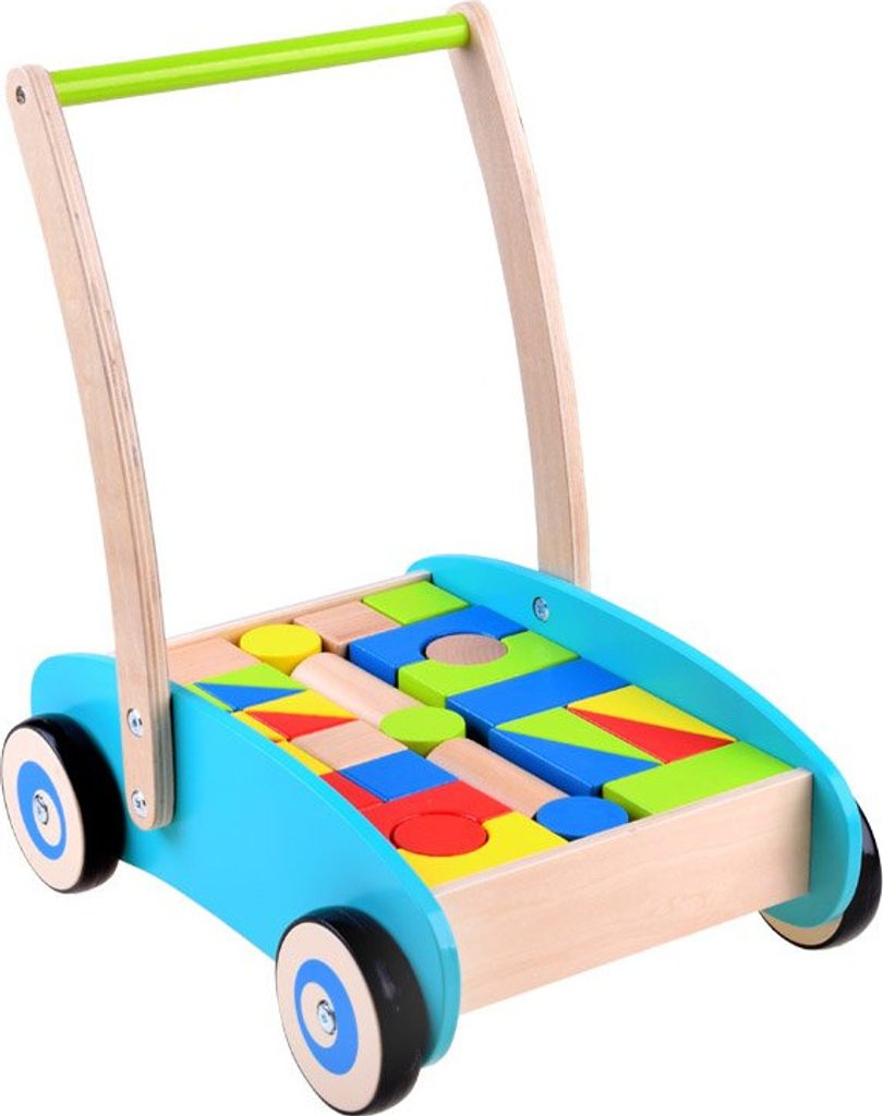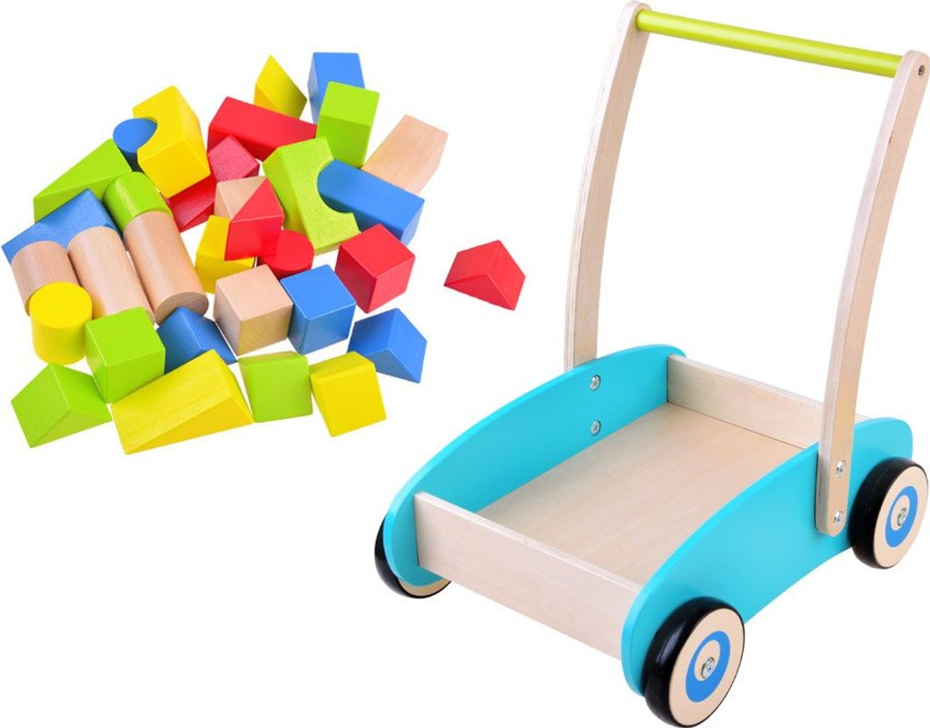 Dřevěné chodítko, odrážedlo, kočárek s barevnými, velkými dřevěnými kostkami jistě poskytne spoustu zábavy těm nejmenším dětem, které rády přemisťují své věci z místa na místo. Kostky byly přizpůsobeny ručičkám nejmenších dětí, osvědčí se při hrách na zahradě, terase i na pláži. Vozík má gumové povrchy. obroučky na kolečkách, které zajišťují tichý a lehký pohyb po zemi. Dřevěné kostky jsou i přes svou jednoduchost jednou z nejlepších forem hry pro každé dítě. Nejen proto, že se nikdy nenudí, ale také proto, že dokonale přispívají k vývoji našeho miminka. Kočárek lze také použít k přenášení panenek nebo plyšáků. zvířata, to jistě poskytne spoustu zábavy každému dítěti.