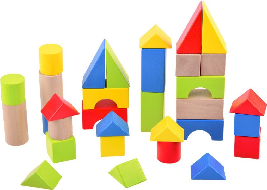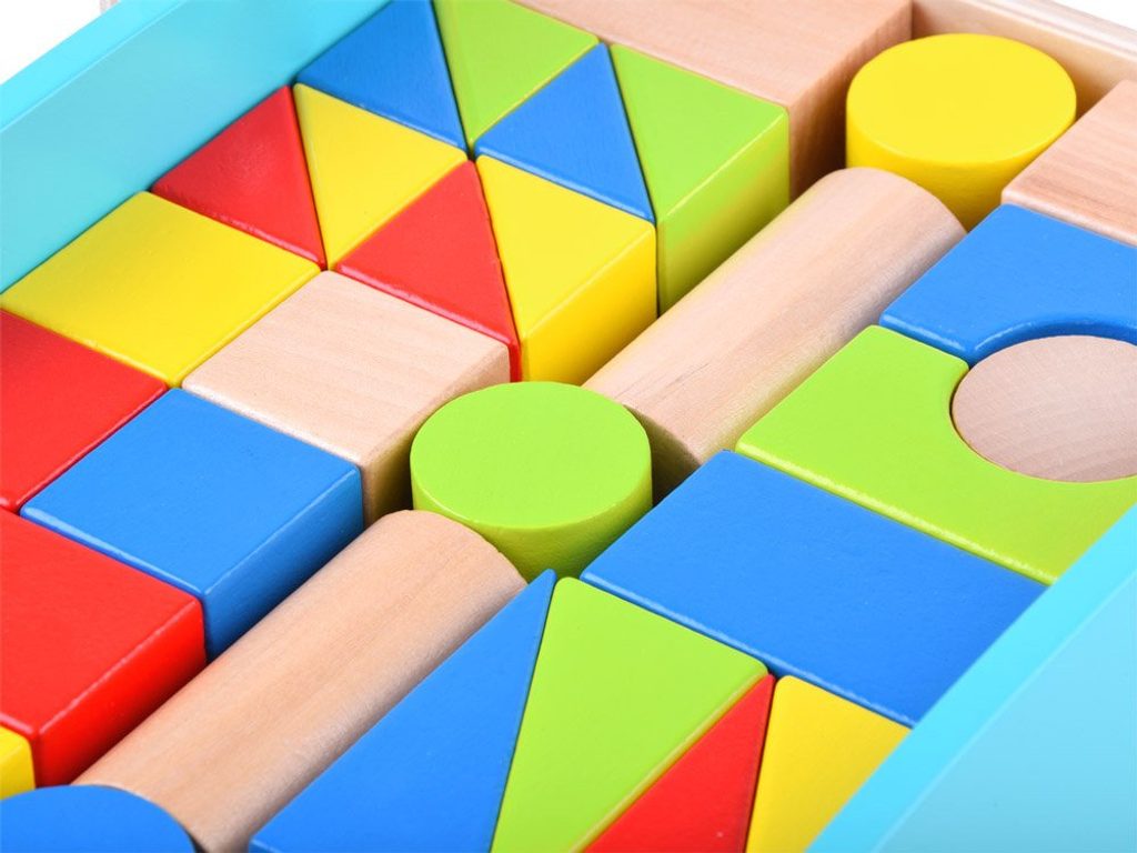 Sada obsahuje 32 různobarevných kostek mnoha zajímavých tvarů a velikostí, které jsou umístěny na dřevěném vozíku s rukojetí na kolečkách.