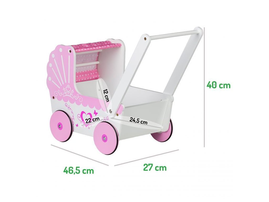 Dětské dřevěné chodítko Ecotoys ve tvaru kočárku pro panenky je ideální hračkou pro děti již od 12 měsíců věku. Pro menší děti slouží jako chodítko kdy rukojeť je v takové výšce, že dítěti umožňuje vozíček tlačit a zároveň udržovat rovnováhu. Pro větší děti slouží jako kočárek pro panenku nebo v něm může vozit hračky. Kolečka mají protiskluzovou úpravu, proto je kočárek vhodný pro hru doma i venku. Přední roletka se dá odejmout. Vše je vyrobeno ze dřeva tak, že vozítko nemá žádné ostré hrany a je pro dítě absolutně bezpečné.