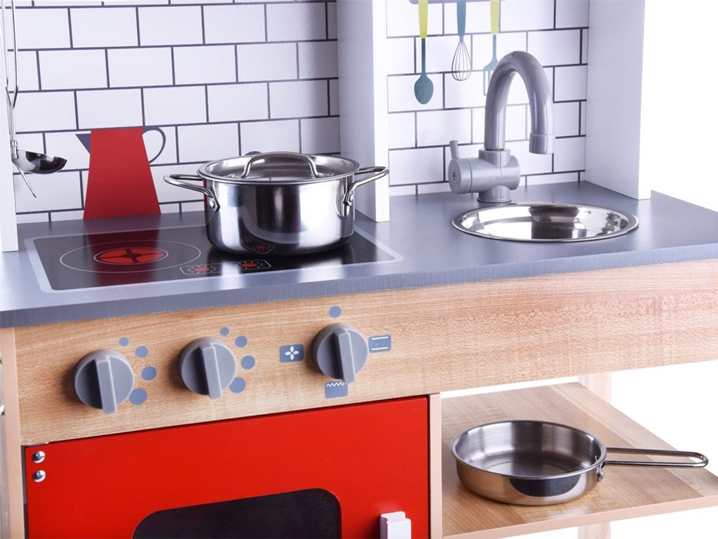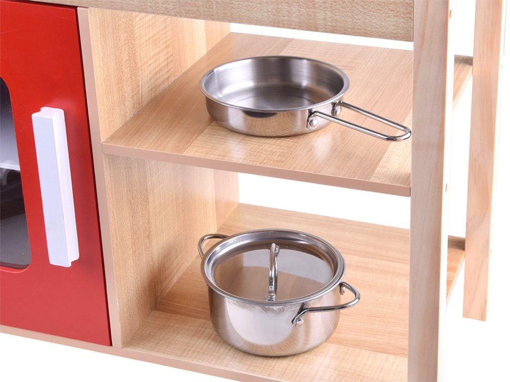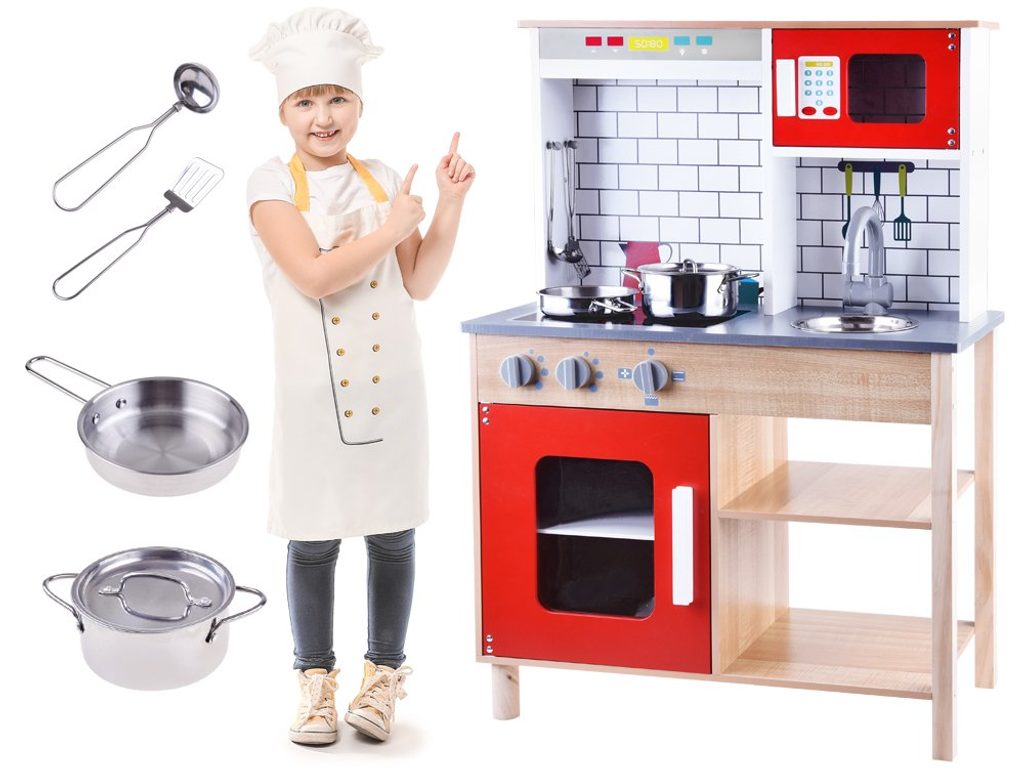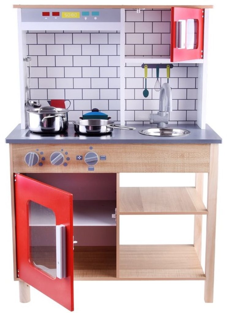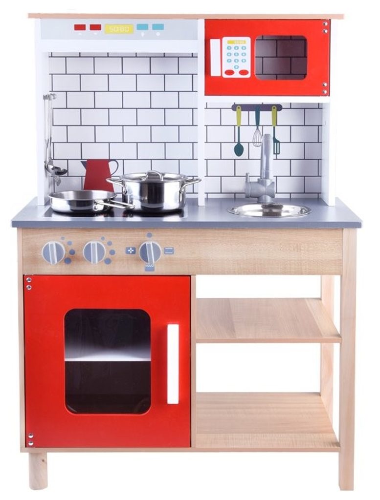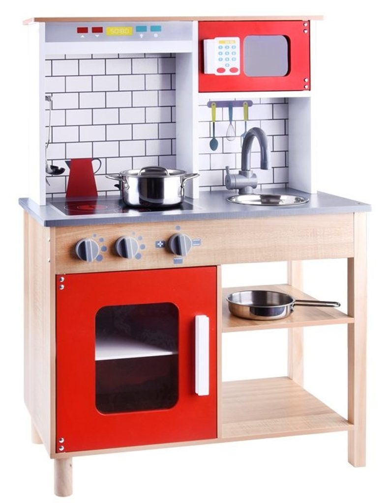 Dřevěná dětská kuchyňka Red Kitchen s příslušenstvím je určena pro děti od 3 let věku. Je vybavena celkem 5 kusy hliníkového nádobí. Najdete zde hrnec, poklici, pánev, naběračku a obracečku. Vaše dítě se určitě s touto velkou kuchyňkou nudit nebude. Mikrovlnná trouba a spodní skříňka jsou otevírací. Otočné jsou také vypínače u sporáku. Je vyrobena ze dřeva v pestrobarevném provedení.