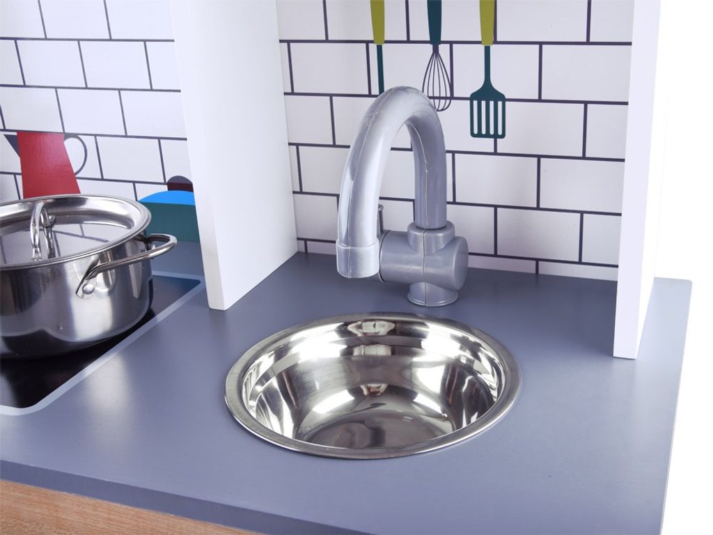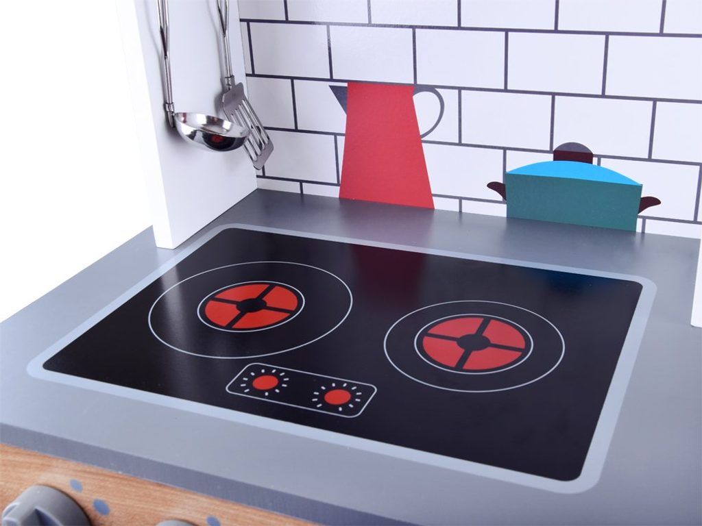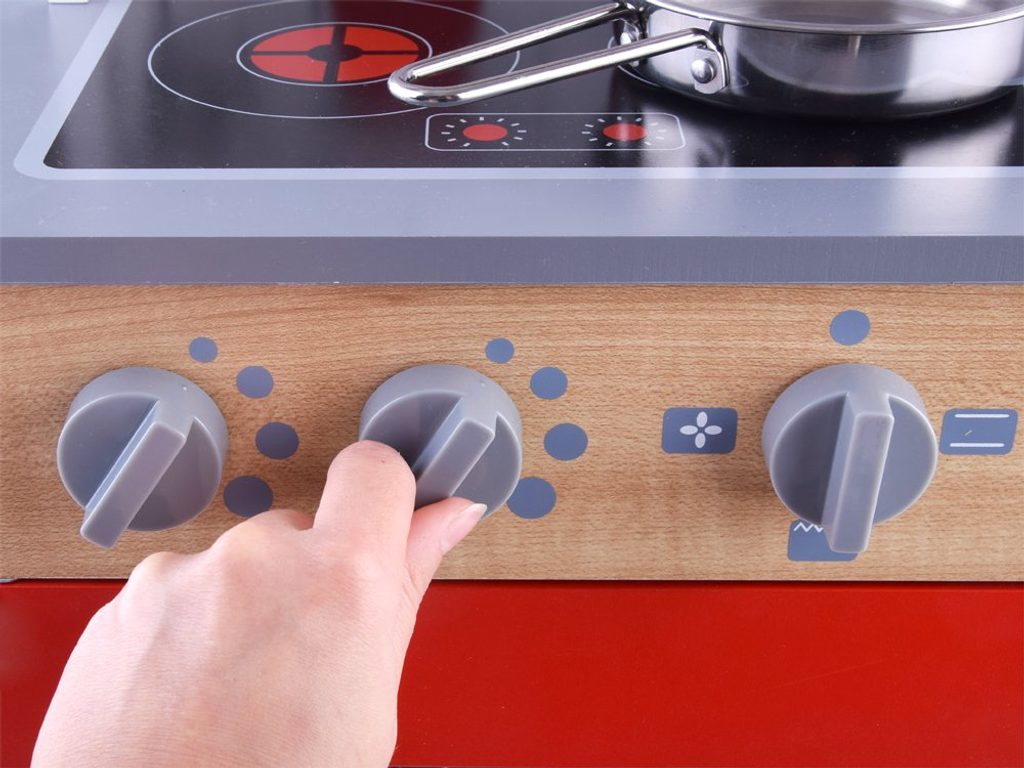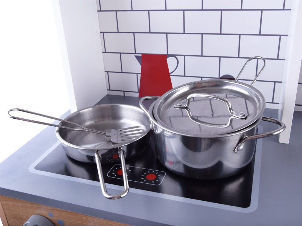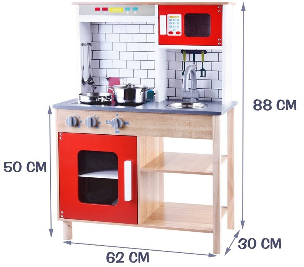 Dřevěná dětská kuchyňka Red Kitchen s příslušenstvím je určena pro děti od 3 let věku. Je vybavena celkem 5 kusy hliníkového nádobí. Najdete zde hrnec, poklici, pánev, naběračku a obracečku. Vaše dítě se určitě s touto velkou kuchyňkou nudit nebude. Mikrovlnná trouba a spodní skříňka jsou otevírací. Otočné jsou také vypínače u sporáku. Je vyrobena ze dřeva v pestrobarevném provedení.