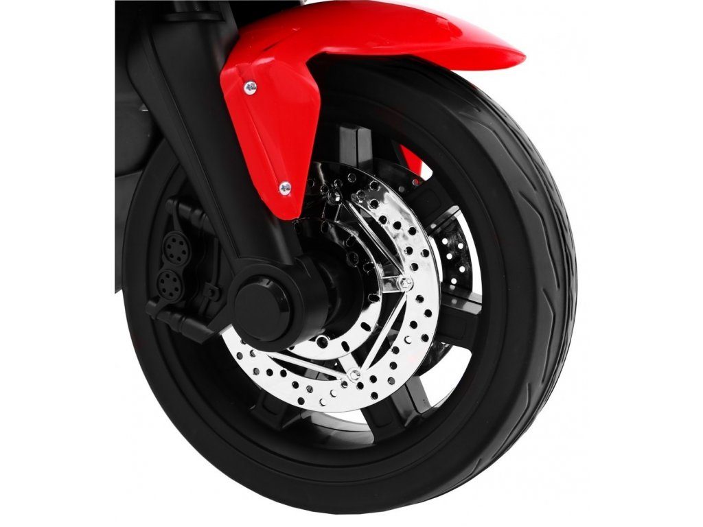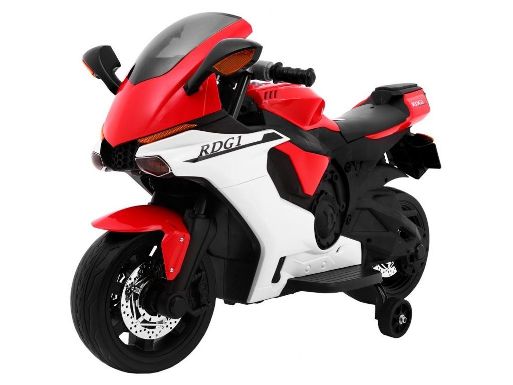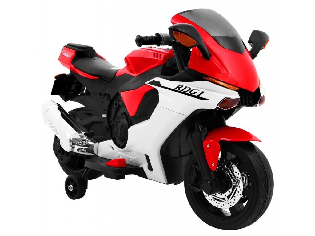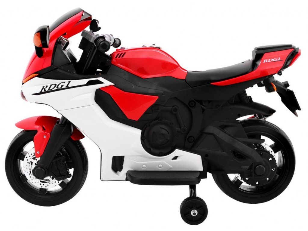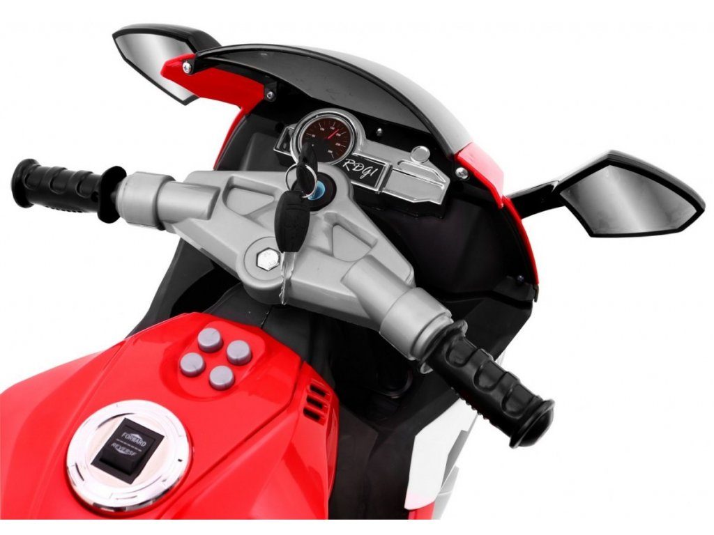 Dětská elektrická motorka Superbike s možností sundání podpůrných kol. Efektní startování pomocí klíčku. Velká plastová kola s gumovým páskem o průměru 28 cm. Poháněna motorem 1x20W. Pohon je aktivován plynovým pedálem umístěným v opěrce nohy. Po uvolnění se motorka zastaví. Pokud již dítě udrží rovnováhu lze kolečka sundat. Vybavena předním LED světlem a zadním světlem. Motorka je dodávána v rozloženém stavu.