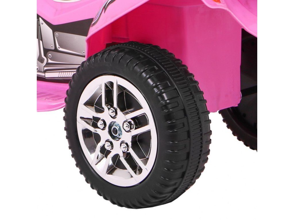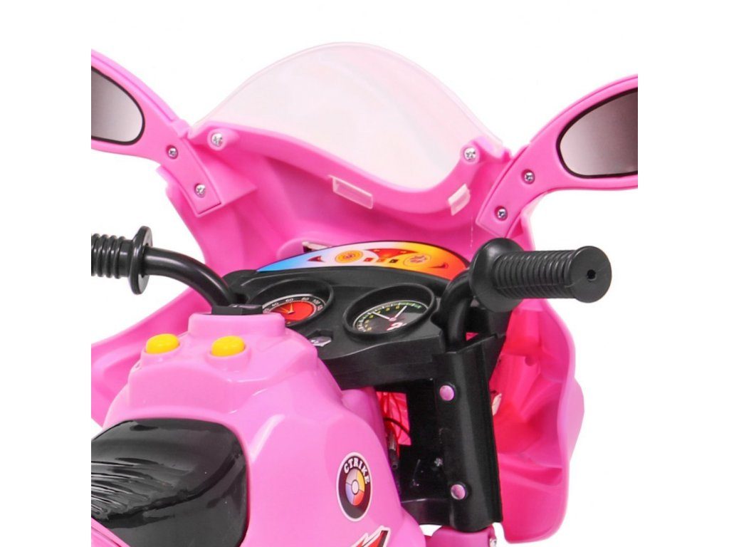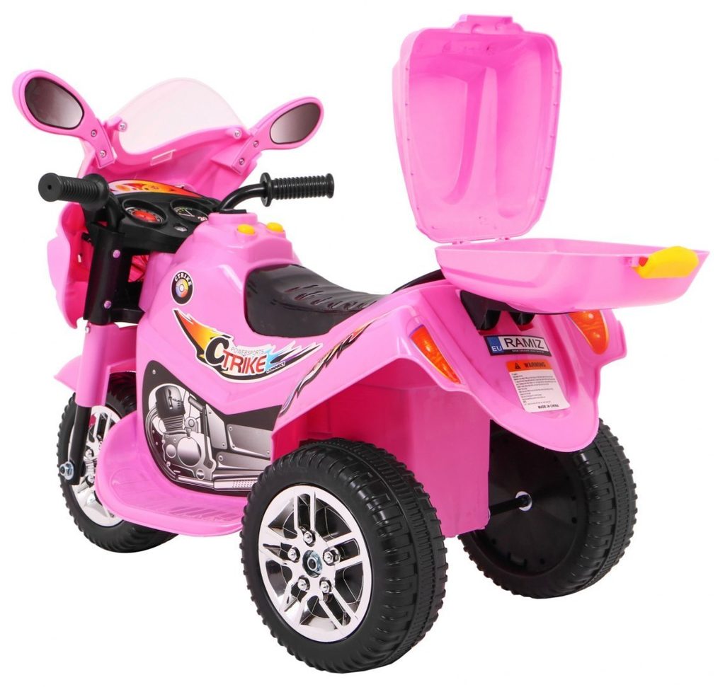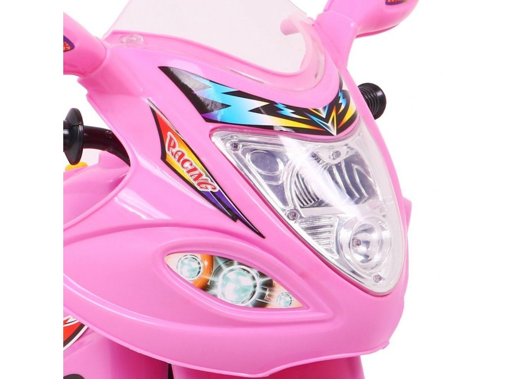 Dětská elektrická tříkolka Racing Pink s atraktivním vzhledem. Směr jízdy se mění pomocí tlačítka umístěného na předním panelu. Rychlost jízdy 3 - 4 km/h. Světelné a zvukové efekty. Kola snižující hlučnost jsou opatřena gumovým páskem a mají průměr 19 cm. Tříkolka je vyrobena z kvalitního materiálu a je velmi stabilní. Hrát si s ní je absolutně bezpečné. Určena pro děti od 3 let věku a nosnosti do 20 kg.