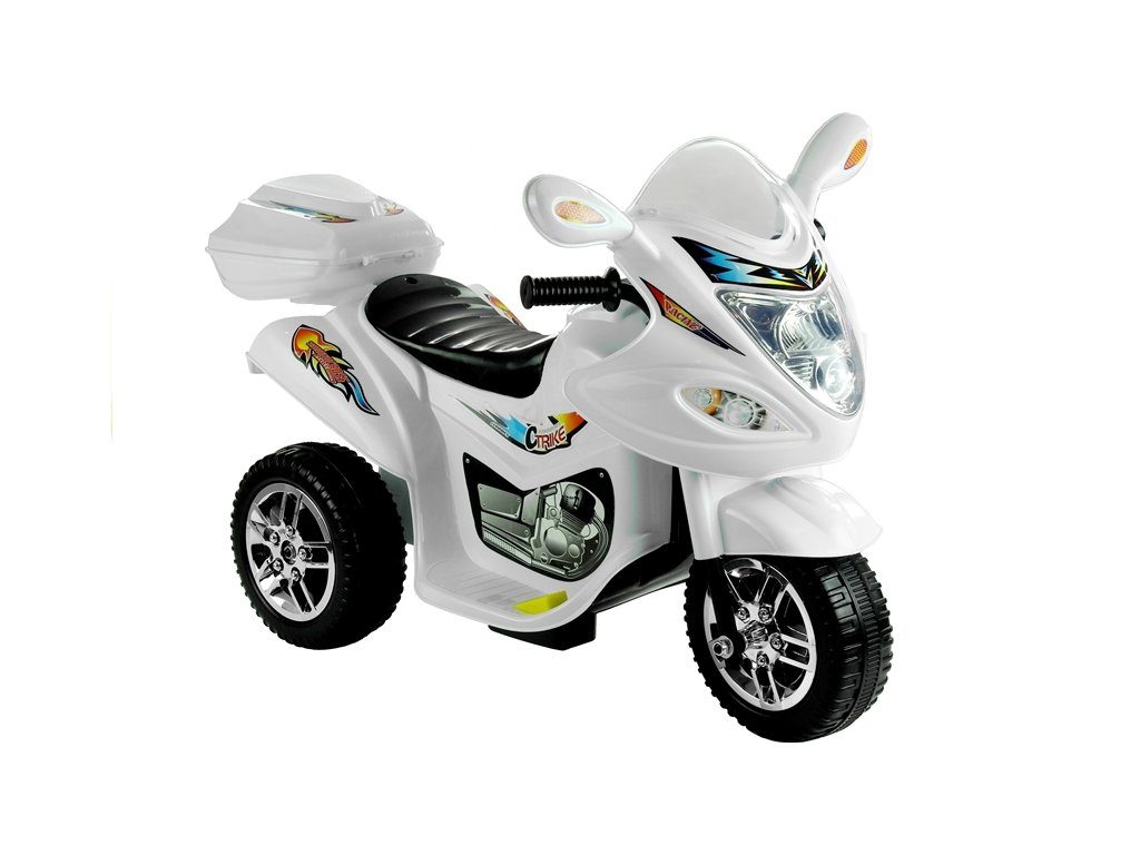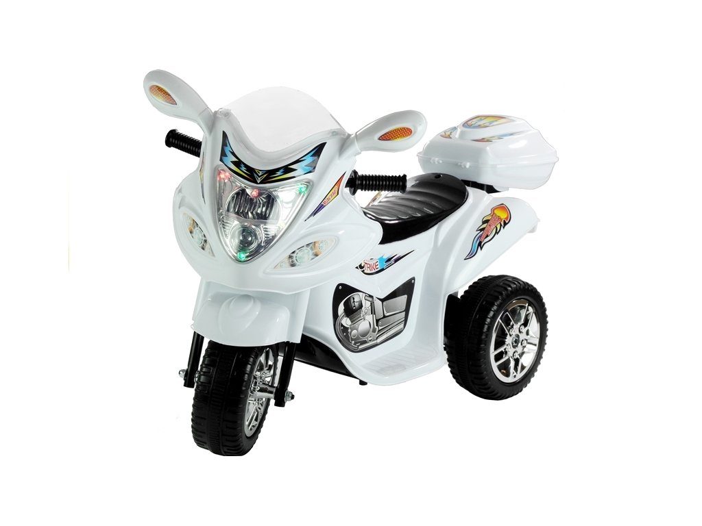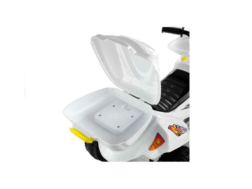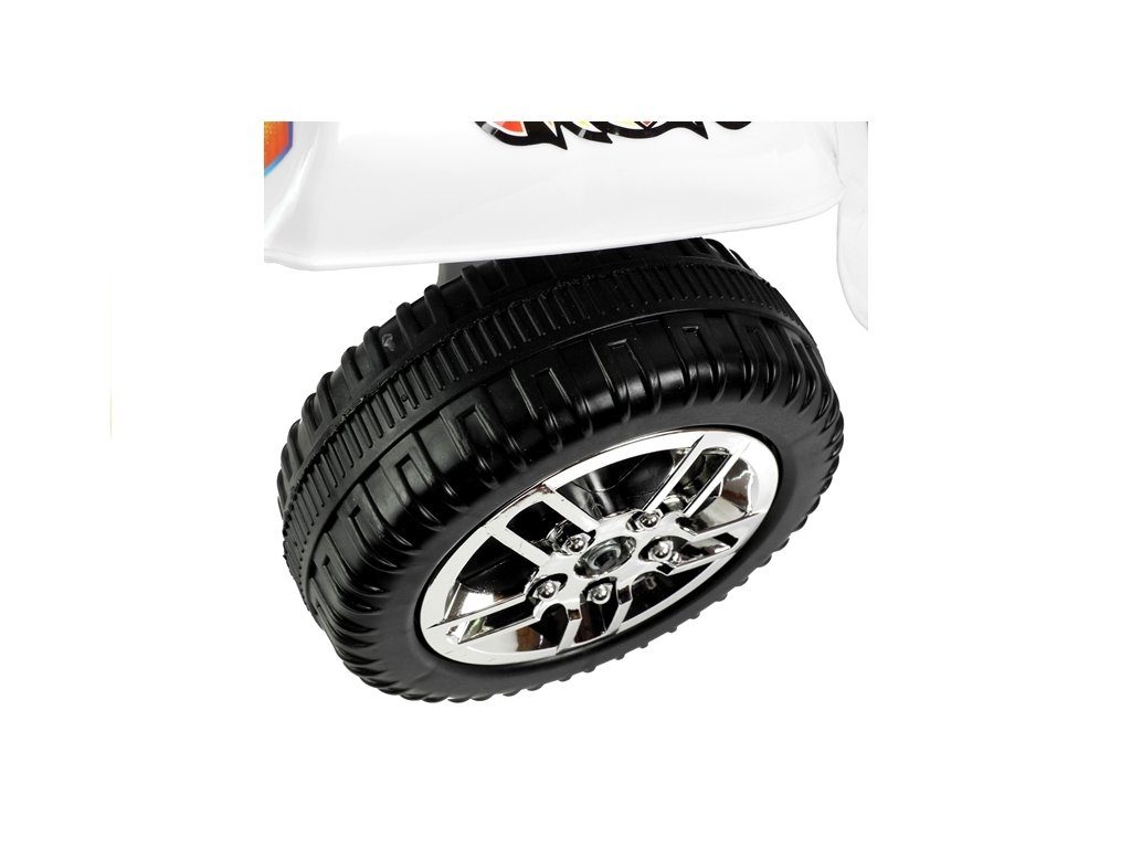 Dětská elektrická tříkolka Racing White s atraktivním vzhledem. Směr jízdy se mění pomocí tlačítka umístěného na předním panelu. Rychlost jízdy 3 - 4 km/h. Světelné a zvukové efekty. Kola snižující hlučnost jsou opatřena gumovým páskem a mají průměr 19 cm. Tříkolka je vyrobena z kvalitního materiálu a je velmi stabilní. Hrát si s ní je absolutně bezpečné. Určena pro děti od 3 let věku a nosnosti do 20 kg.