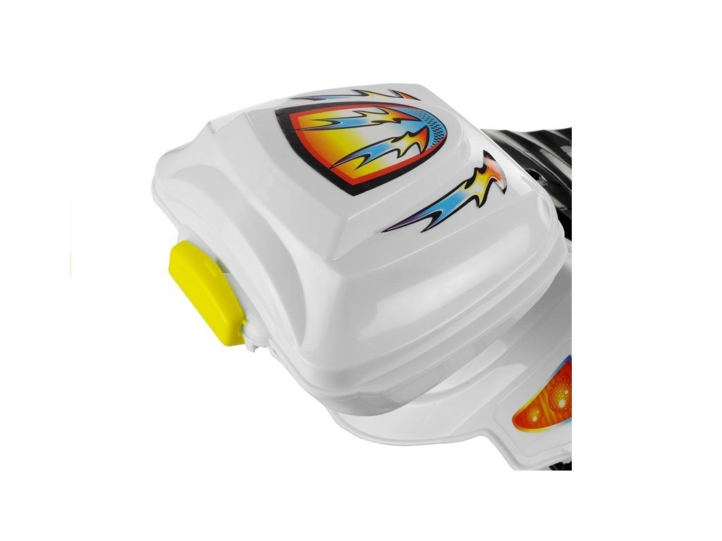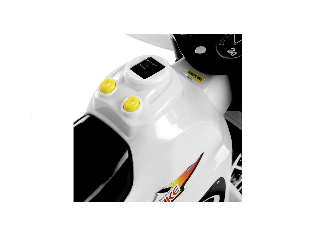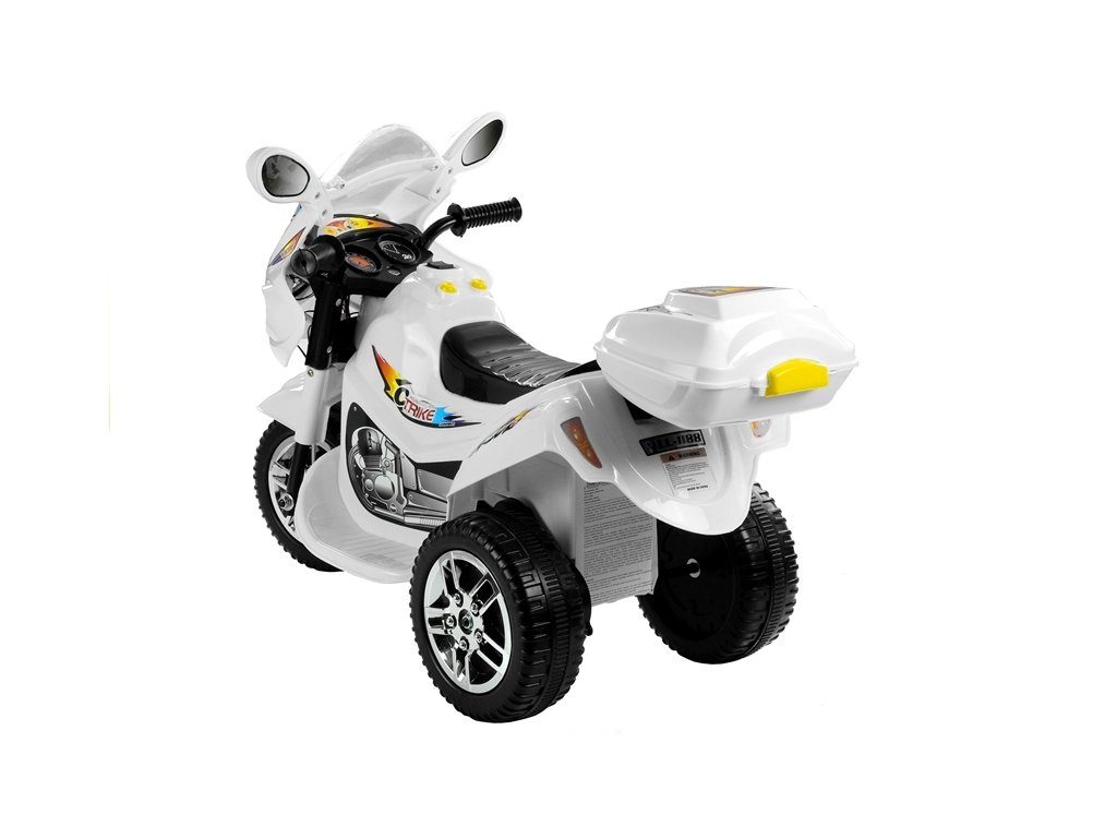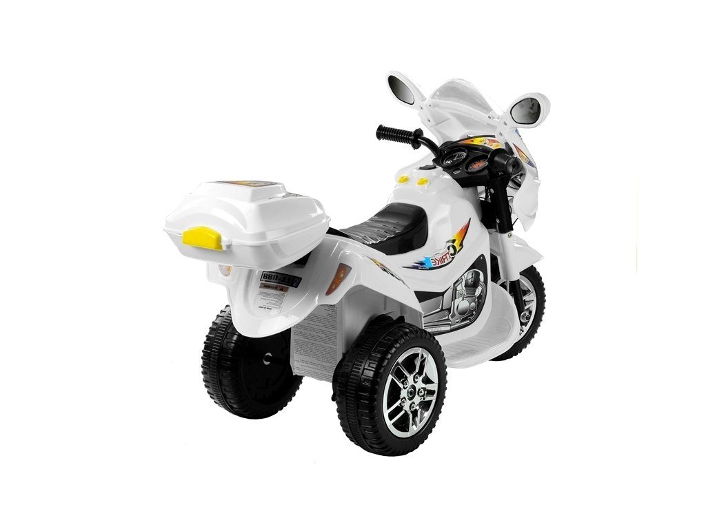 Dětská elektrická tříkolka Racing White s atraktivním vzhledem. Směr jízdy se mění pomocí tlačítka umístěného na předním panelu. Rychlost jízdy 3 - 4 km/h. Světelné a zvukové efekty. Kola snižující hlučnost jsou opatřena gumovým páskem a mají průměr 19 cm. Tříkolka je vyrobena z kvalitního materiálu a je velmi stabilní. Hrát si s ní je absolutně bezpečné. Určena pro děti od 3 let věku a nosnosti do 20 kg.
