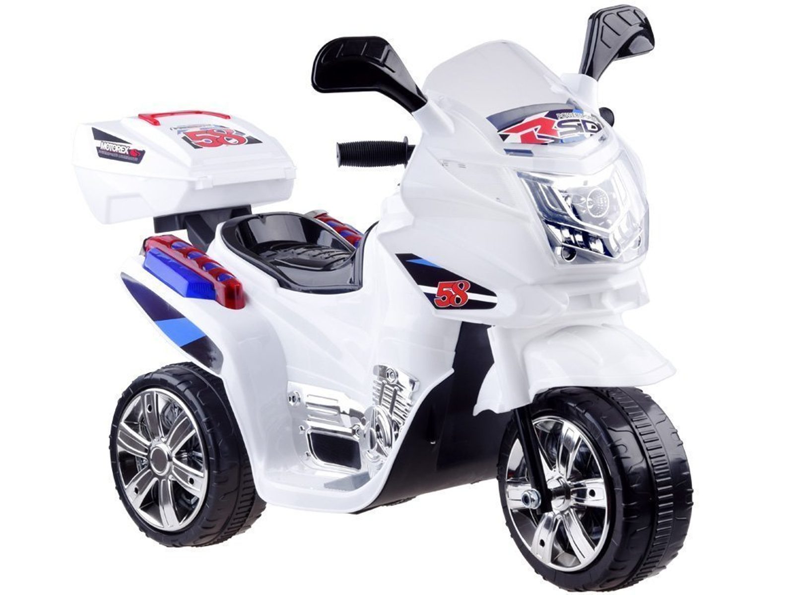 Dětská elektrická tříkolka Speed Star s atraktivním vzhledem je určena pro ty nejmenší děti. Směr jízdy se mění pomocí tlačítka umístěného na předním panelu. Rychlost jízdy je 2 km/h. Motorka je vybavena osvětlením přední části, boků a kol (nutno dokoupit LR44 baterie). Tlačítka ovládají melodie a zvuk motoru. Plastová kola jsou opatřena zubatým páskem a mají průměr 19 cm. Tříkolka je vyrobena z kvalitního materiálu a je velmi stabilní. Hrát si s ní je absolutně bezpečné.