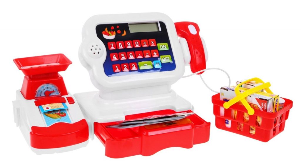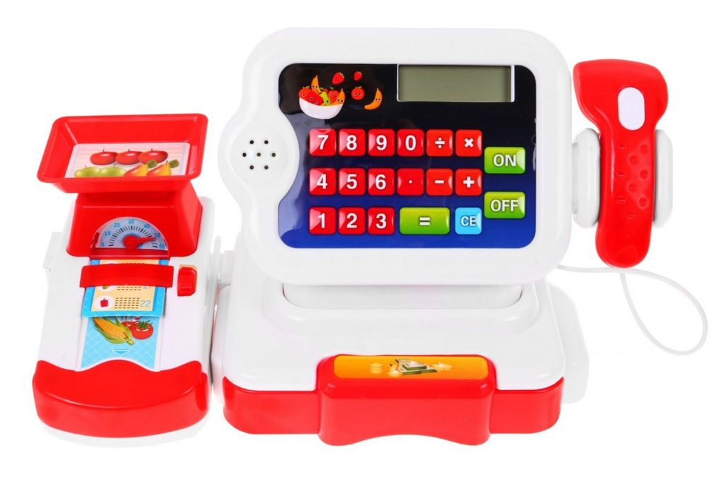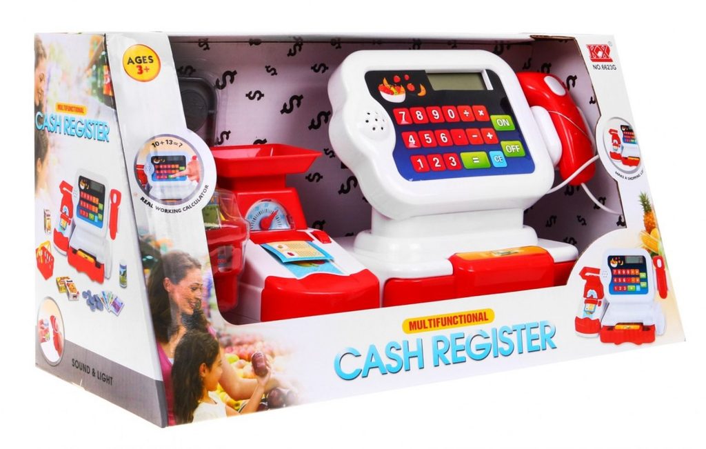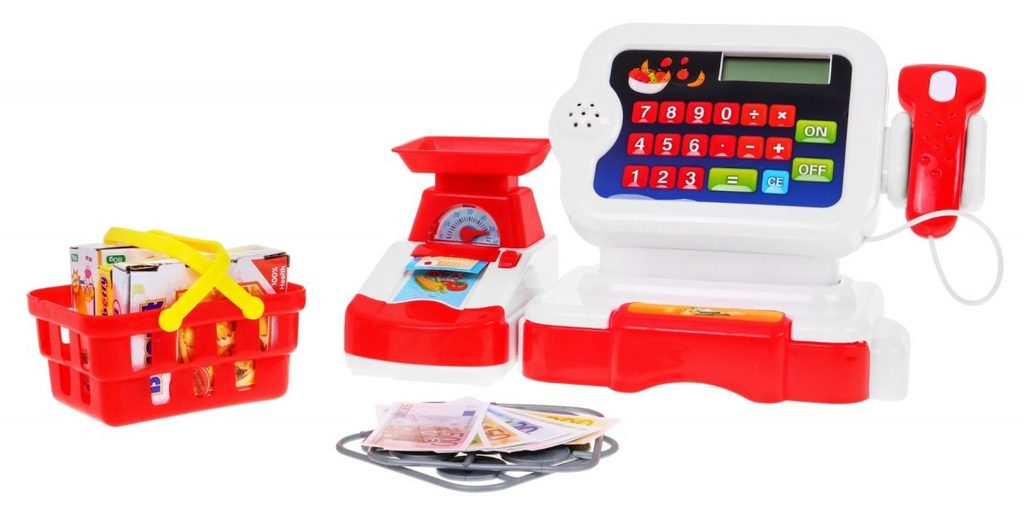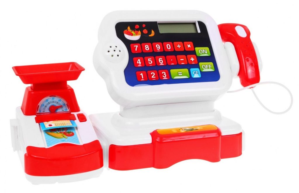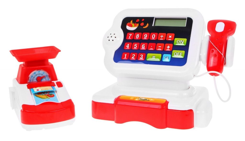 Dětská elektronická pokladna Happy Cashier s váhou a displejem přemění Vaše dítě ve skutečnou pokladní. Je vybavena displejem, který má funkci kalkulačky. Ve spodní části je umístěna výsuvná přihrádka na bankovky a mince, které jsou také součástí balení. Pomocí funkčního skeneru lze skenovat zboží, po stisknutí tlačítka se rozsvítí červená dioda a ozve se charakteristické pípnutí. Součástí balení je také nákupní košíček s imitacemi potravin. V levé části pokladny je umístěna váha. Hračka je určena pro děti od 36 měsíců věku.