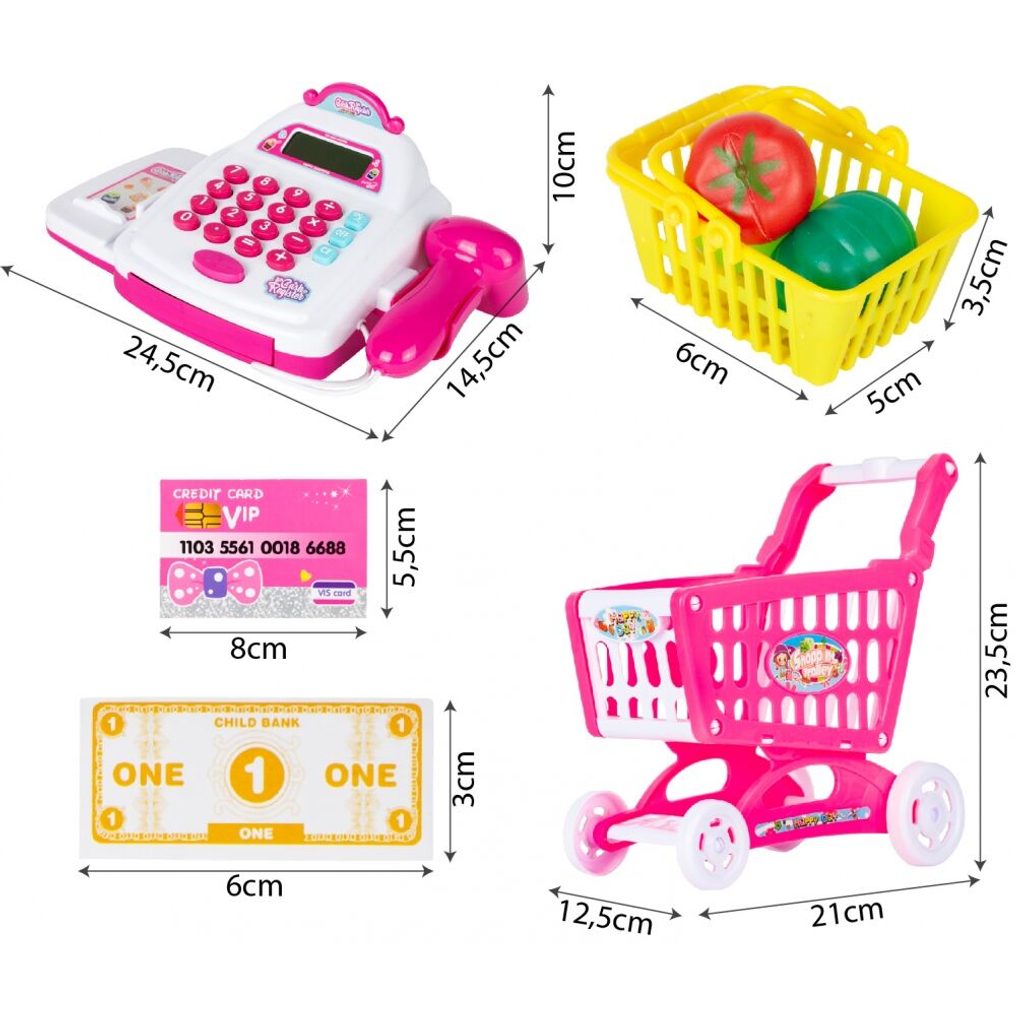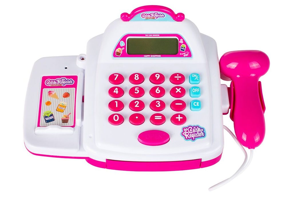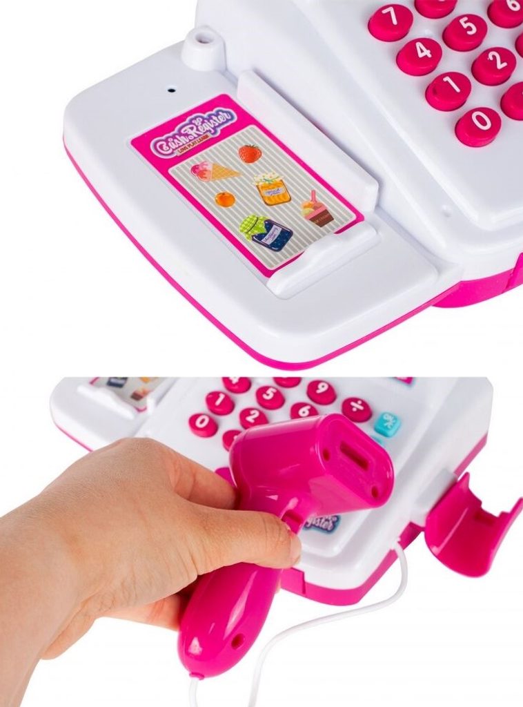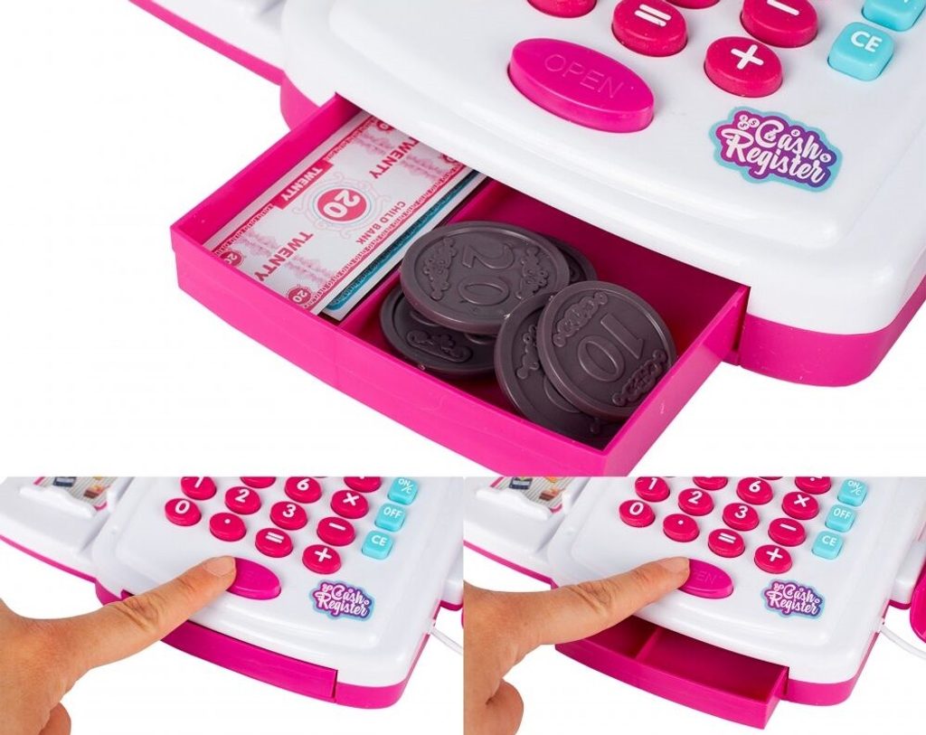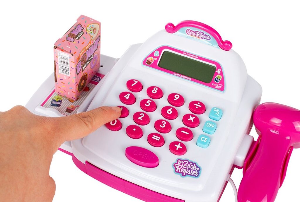 Dětská elektronická pokladna s displejem přemění Vaše dítě ve skutečného prodavače. Je vybavena LCD displejem, který funguje jako skutečná kalkulačka. Ve spodní části je umístěna výsuvná přihrádka na bankovky a mince, které jsou také součástí balení. Otevírá se zmáčknutím tlačítka a dá se uzamknout klíčkem. Součástí balení jsou také nákupní košíček, vozíček a imitace potravin. Hračka je určena pro děti od 36 měsíců věku.
