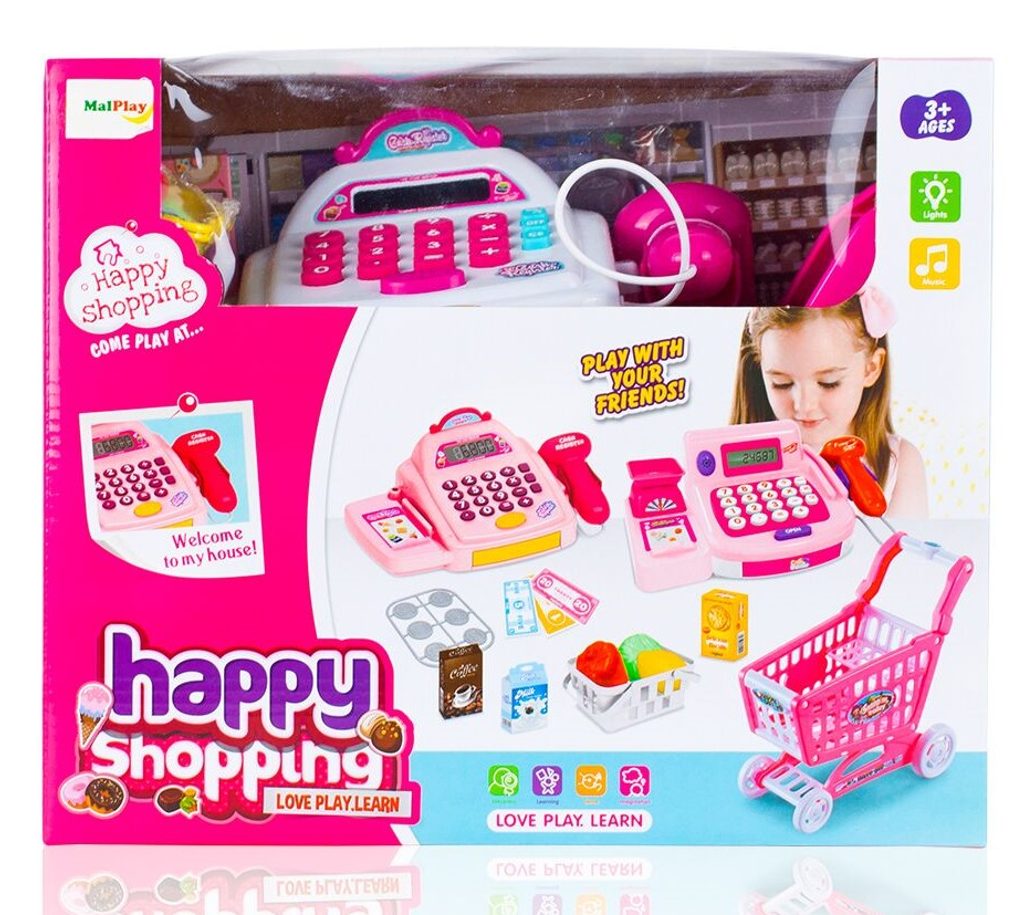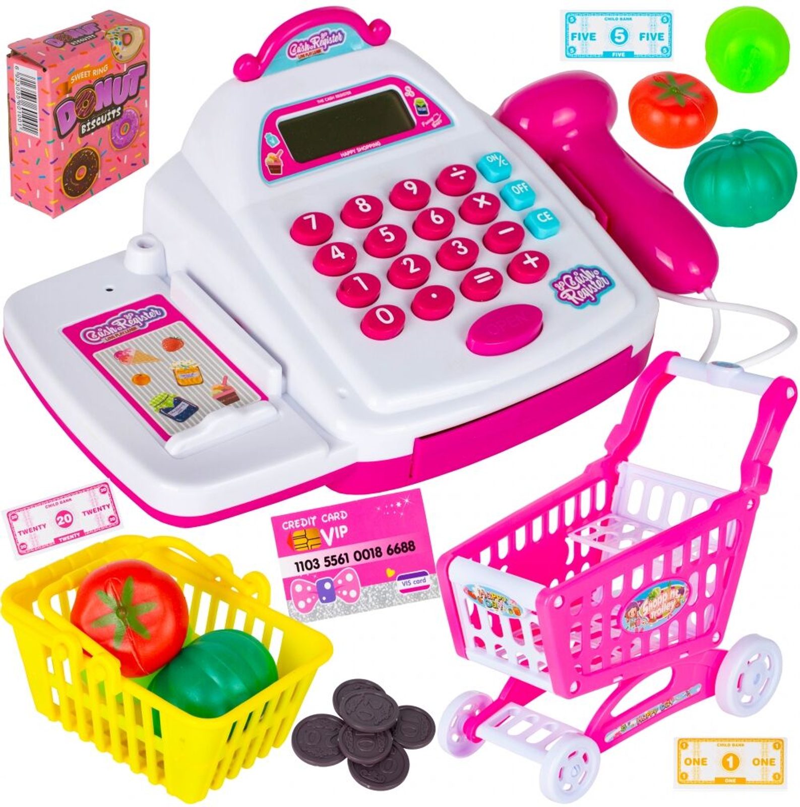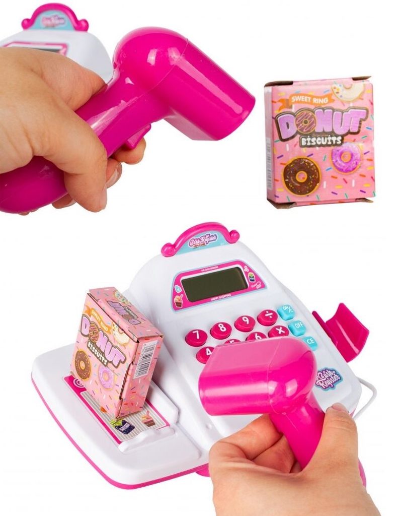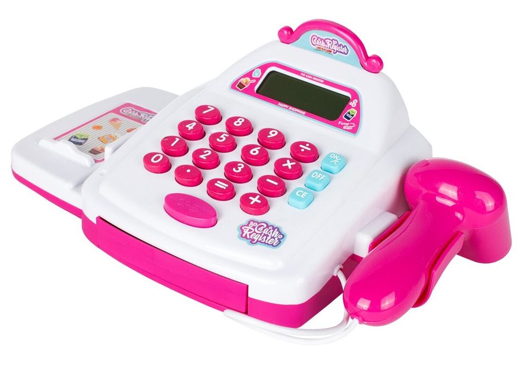 Dětská elektronická pokladna s displejem přemění Vaše dítě ve skutečného prodavače. Je vybavena LCD displejem, který funguje jako skutečná kalkulačka. Ve spodní části je umístěna výsuvná přihrádka na bankovky a mince, které jsou také součástí balení. Otevírá se zmáčknutím tlačítka a dá se uzamknout klíčkem. Součástí balení jsou také nákupní košíček, vozíček a imitace potravin. Hračka je určena pro děti od 36 měsíců věku.